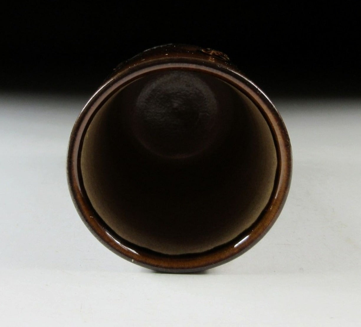 This listing is for an Ohi-ware yunomi style tea cup made by master potter, Ohi Chozaemon X. It is wheel-thrown and coated in glossy ‘Hijiri’ Ohi amber glaze. The exterior is incised with various lines, and the interior is coated with matte pale peach coloured glaze. Also this piece has an unusual triangular shape, more commonly associated with Karatsu potters. Chozaemon’s “O” stamp can be found on the bottom, and it comes with its original signed wooden storage box. It also comes with two Japanese language profiles about the potter and Ohi-ware.