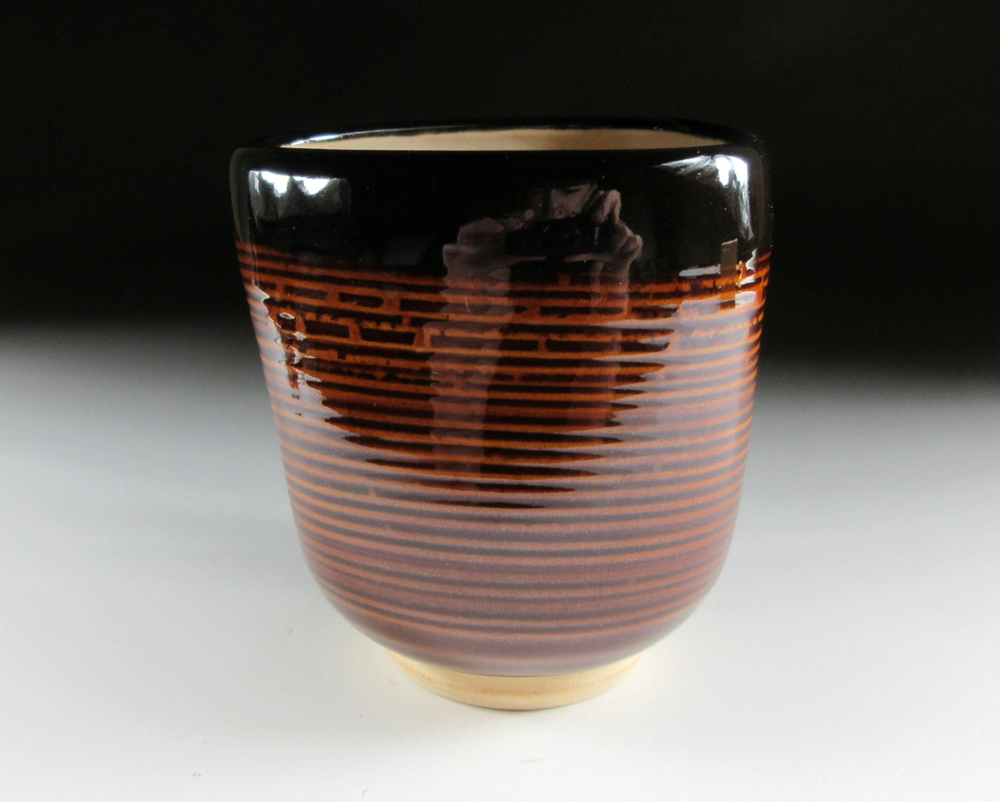 This listing is for a splendid Ohi-ware yunomi tea cup made by the current head of the Chozaemon family kiln, Ohi Toshio (Ohi Chozaemon XI). It is wheel-thrown and coated in glossy ‘hijiri’ caramel coloured glaze with two indentations on the exterior. The interior is glazed a peach/beige colour with a matte finish. The stamp of the potter can be found on the bottom, and it comes with its original signed wooden storage box. It also comes with three Japanese language profile papers about the potter.