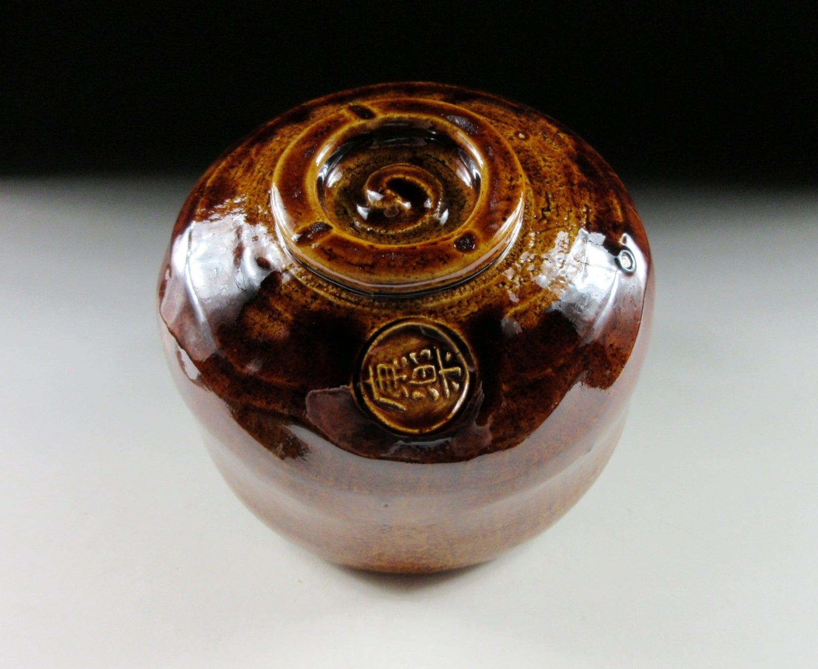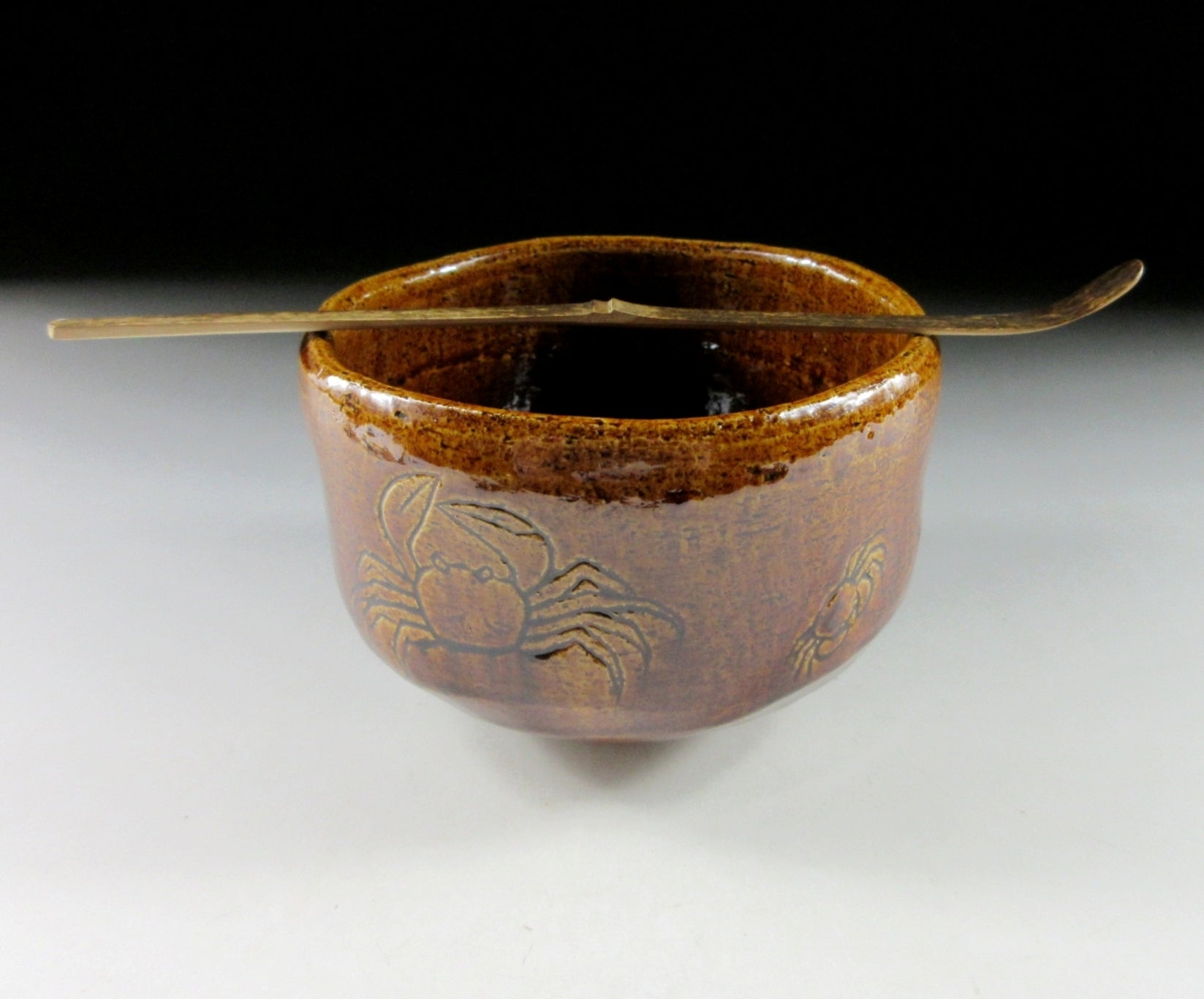 This listing is for a vintage Ohi-ware chawan made by Ohi Koraku. It is hand-turned and coated in ame-yu caramel coloured glaze, and the front is decorated with a pair of crabs. According to Japanese folklore crabs are believed to embody the souls of fallen samurai, and they’re a symbol of power and strength. This is a wonderful piece for year round use, the glossiness of the glazed interior compliments the bright green colour of matcha perfectly. The stamp of the potter can be found on the bottom, very sorry but there’s no box for this one. *PLEASE NOTE THAT THE CHASHAKU TEA SCOOP IS NOT INCLUDED.