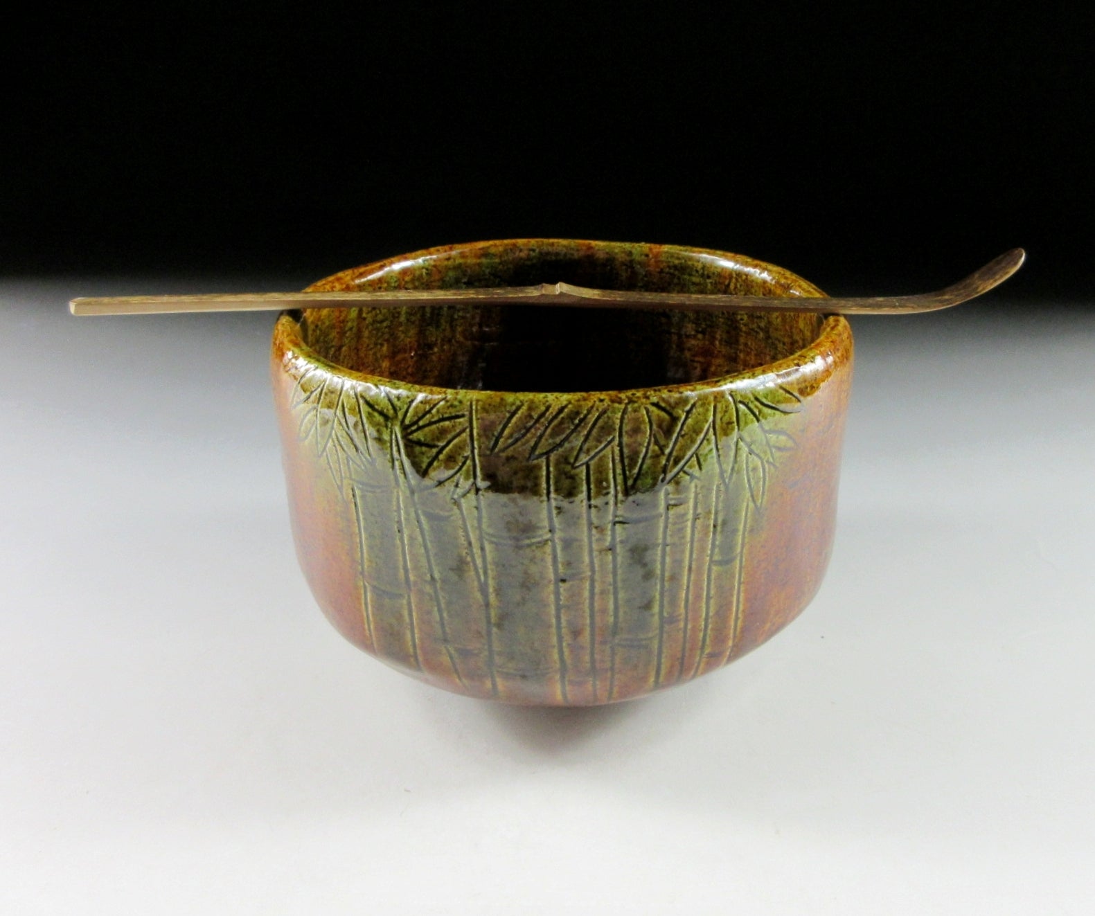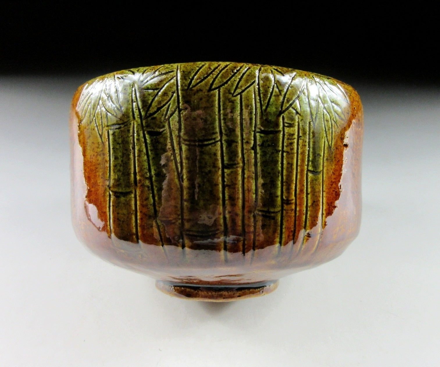 This listing is for a vintage Ohi-ware chawan made by Ohi Koraku. It is hand-turned and coated in ame-yu caramel coloured glaze, and the front is decorated with green glazed bamboo. This piece is suitable for year round use. When the wind gently blows bamboo it sways and makes a soothing sound, a sound commonly associated with summer. On the other hand, the ame-yu glaze conveys warmth making it especially inviting during the cooler months. The stamp of the potter can be found on the bottom, very sorry but there’s no box for this one. *PLEASE NOTE THAT THE CHASHAKU TEA SCOOP IS NOT INCLUDED.