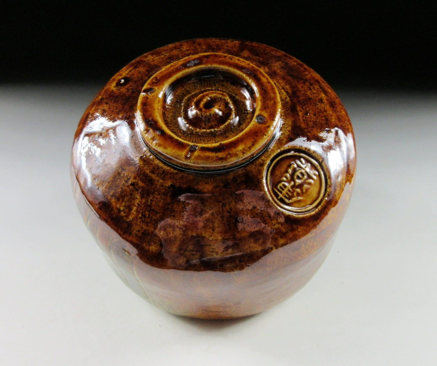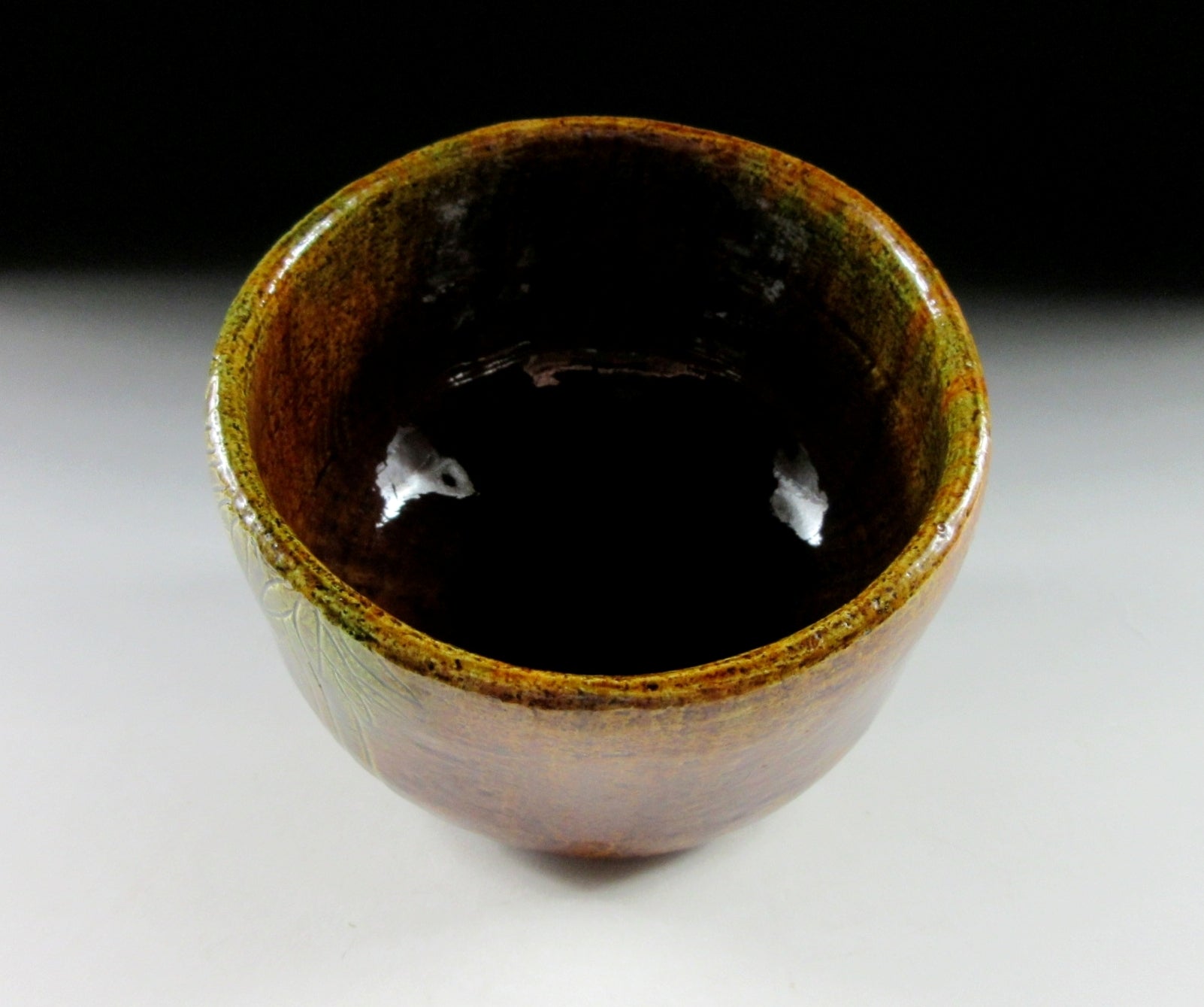 Ohi-ware refers to pottery made in Ohi town in Kanazawa Prefecture. It is made of soft clay and fired at low temperatures, and features what is known as an ame-yu glaze. Ohi-ware’s ame-yu glaze is amber or caramel coloured glaze with a glossy finish. Ohi-ware is generally shaped by hand and fired in a way not so different from Raku-ware. The temperature is increased sharply over a short period of time, and the piece is removed from the kiln whilst the glaze is still melting. This causes the piece to cool down rapidly, thus creating the beautiful rich colour and lustre.