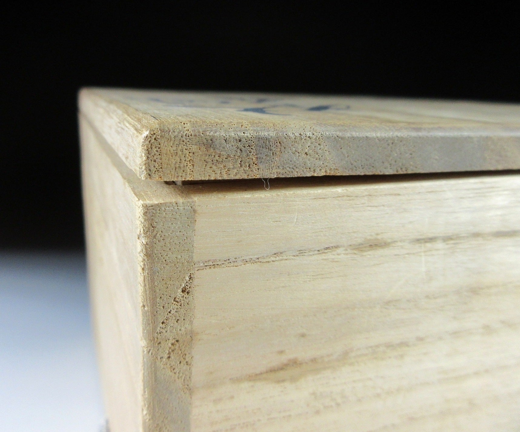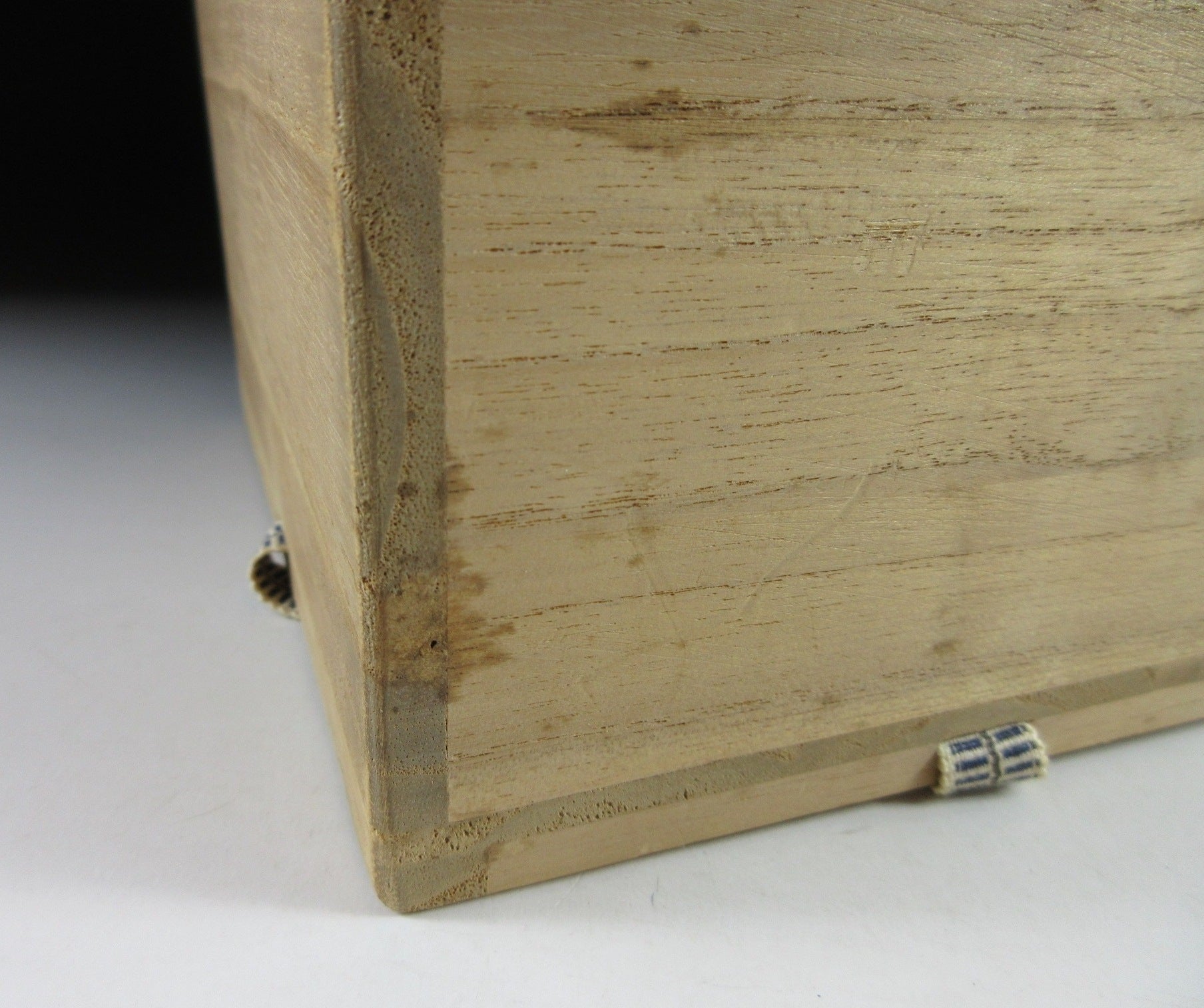 The chawan is in very good condition with no chips or cracks, but the box has darkened and is spotty, and there are wood borer lines on the interior.