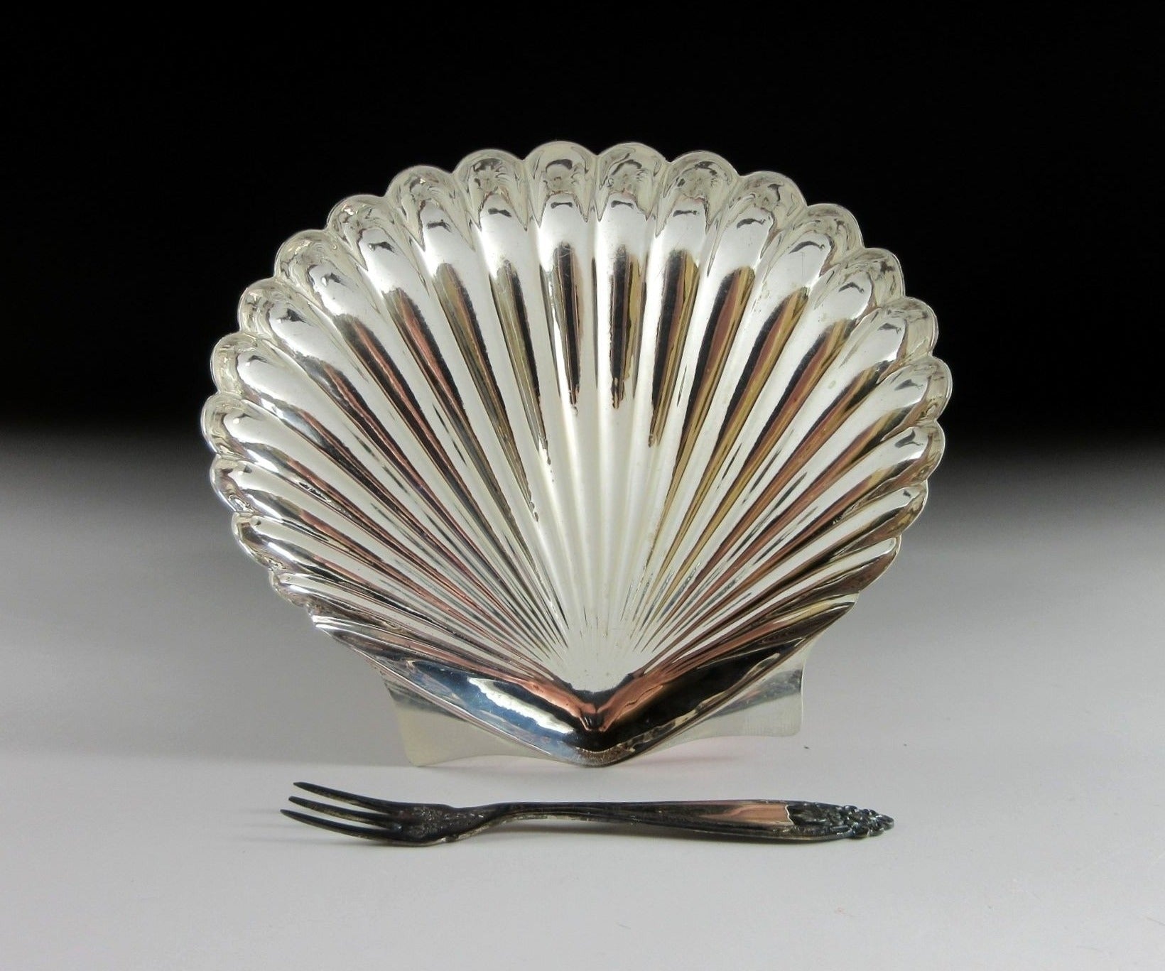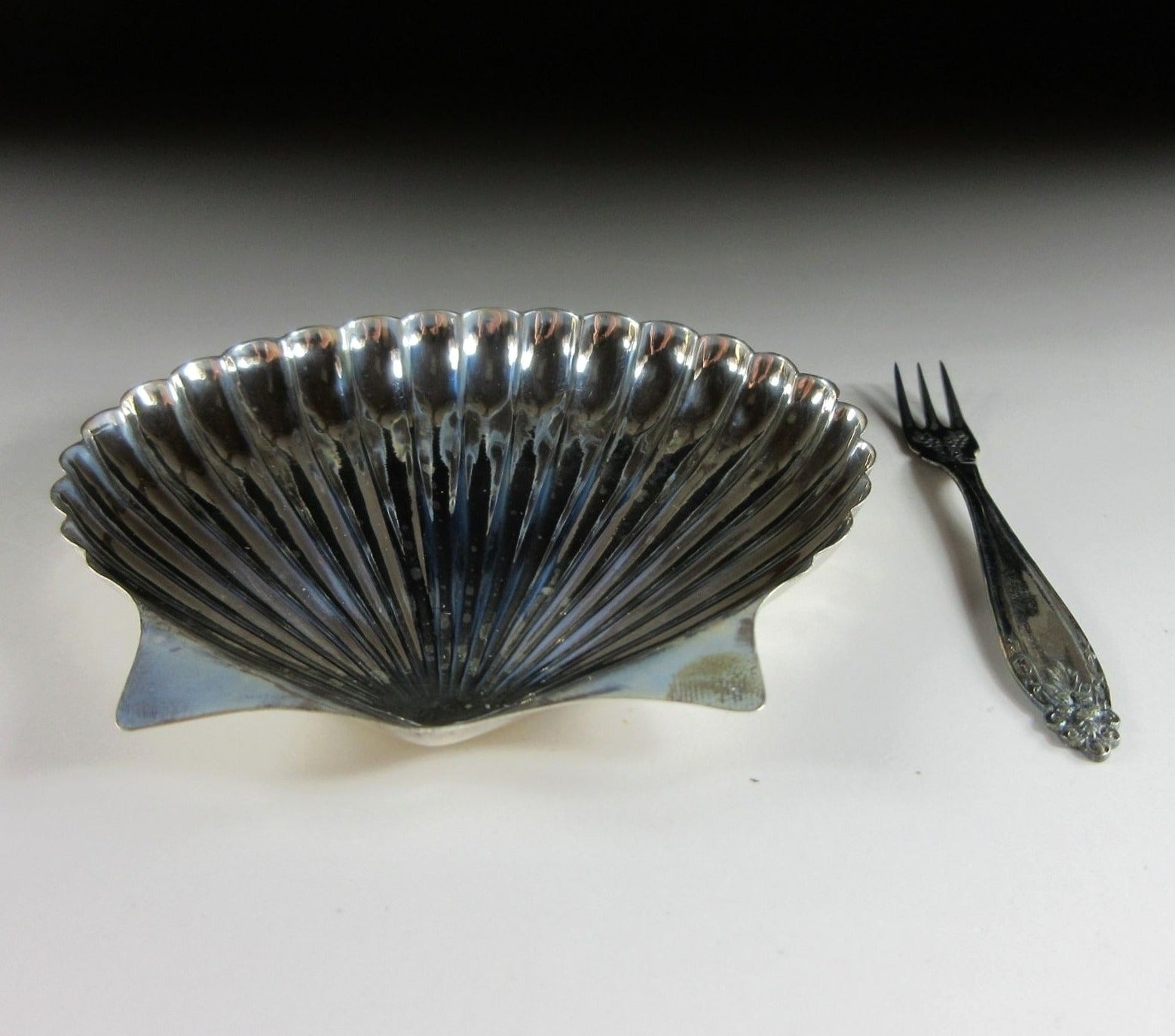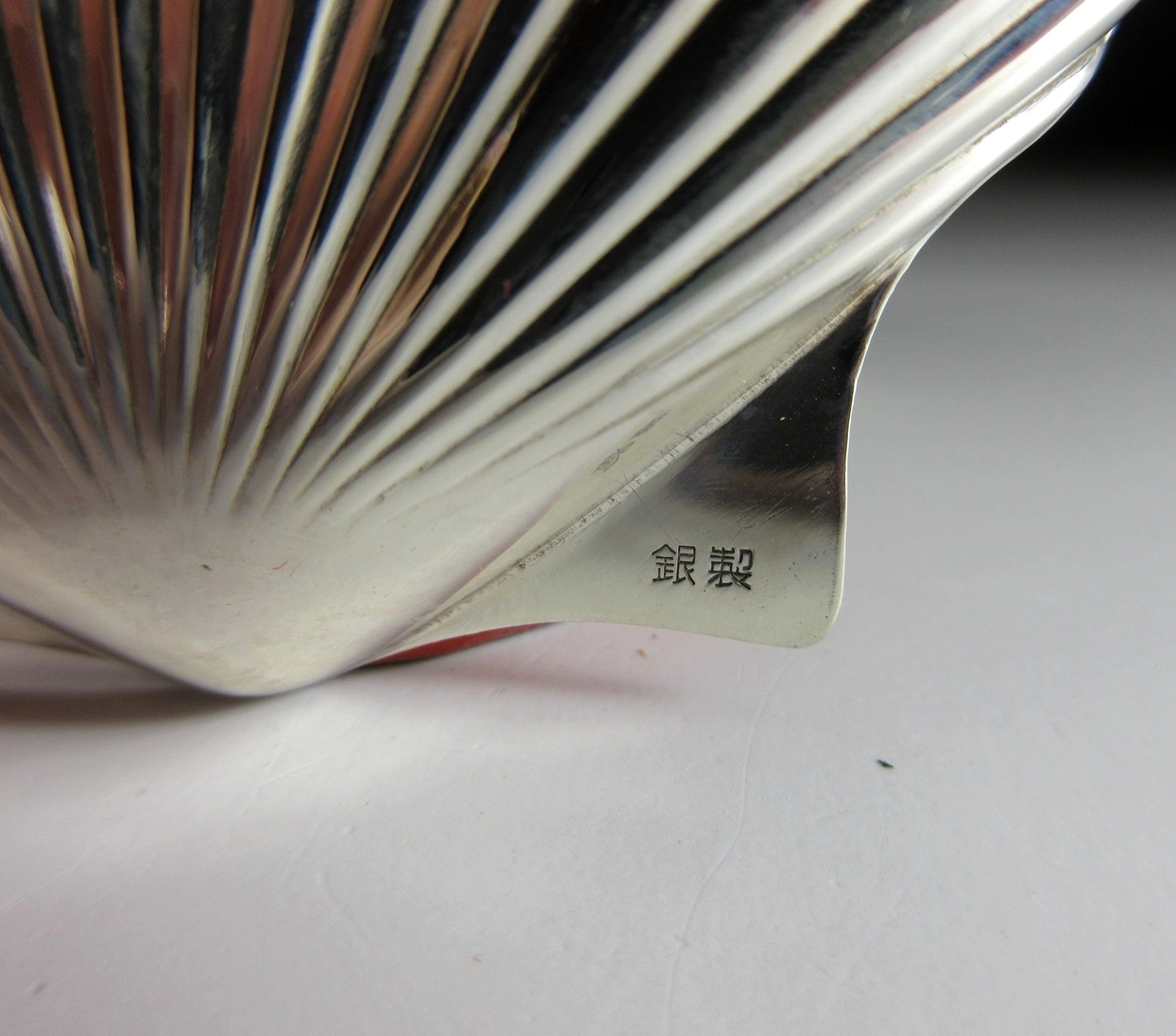 This listing is for a VERY SMALL silver shell plate and fork made around 40-50 years ago by Ohno & Son in Yokohama. The kanji on the back of the shell reads as silver, and the small fork is also marked ‘silver’. This set was most likely given as a gift to commemorate a special event such as the birth of a baby, anniversary etc. It comes with its original case marked Ohno & Son.