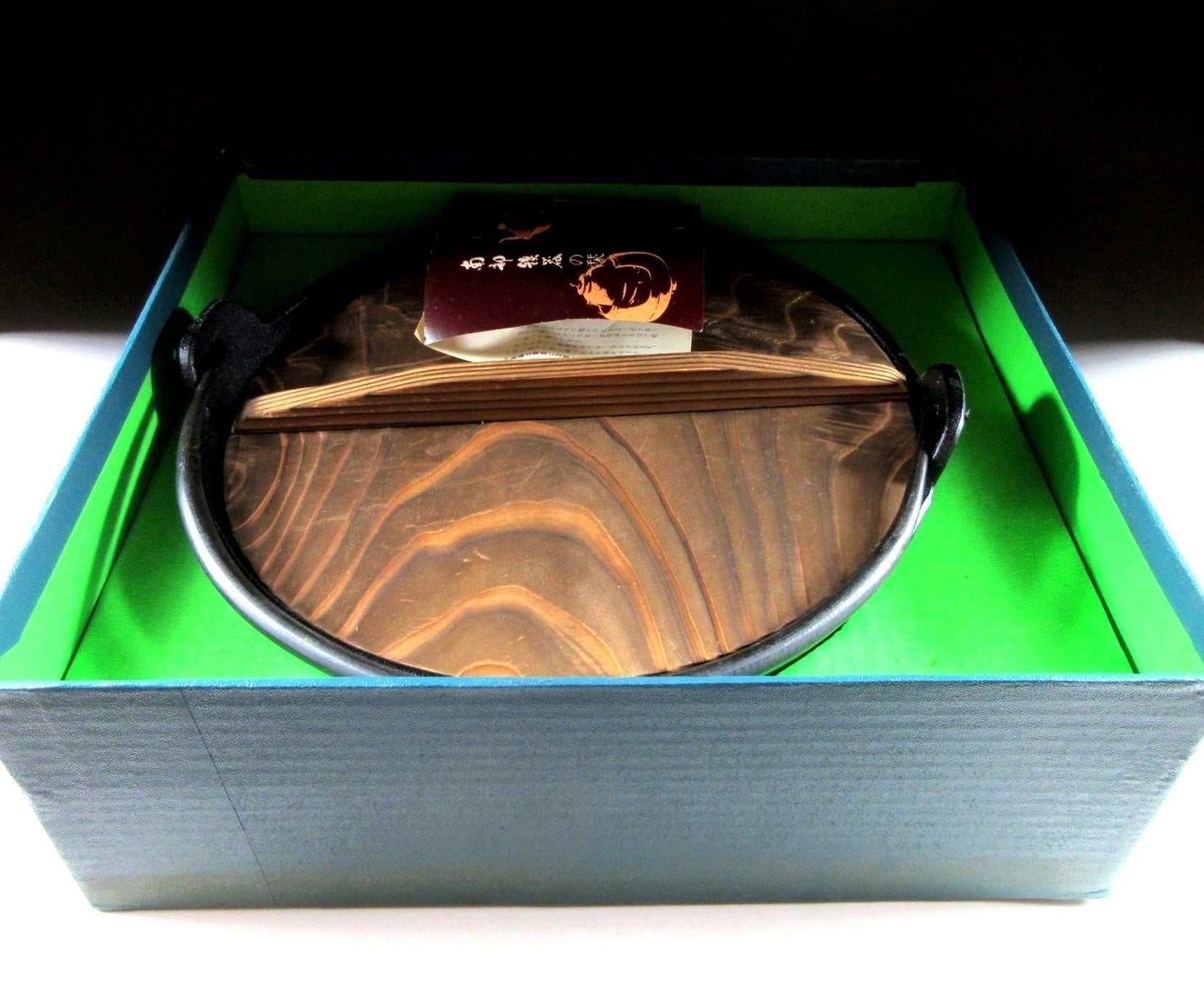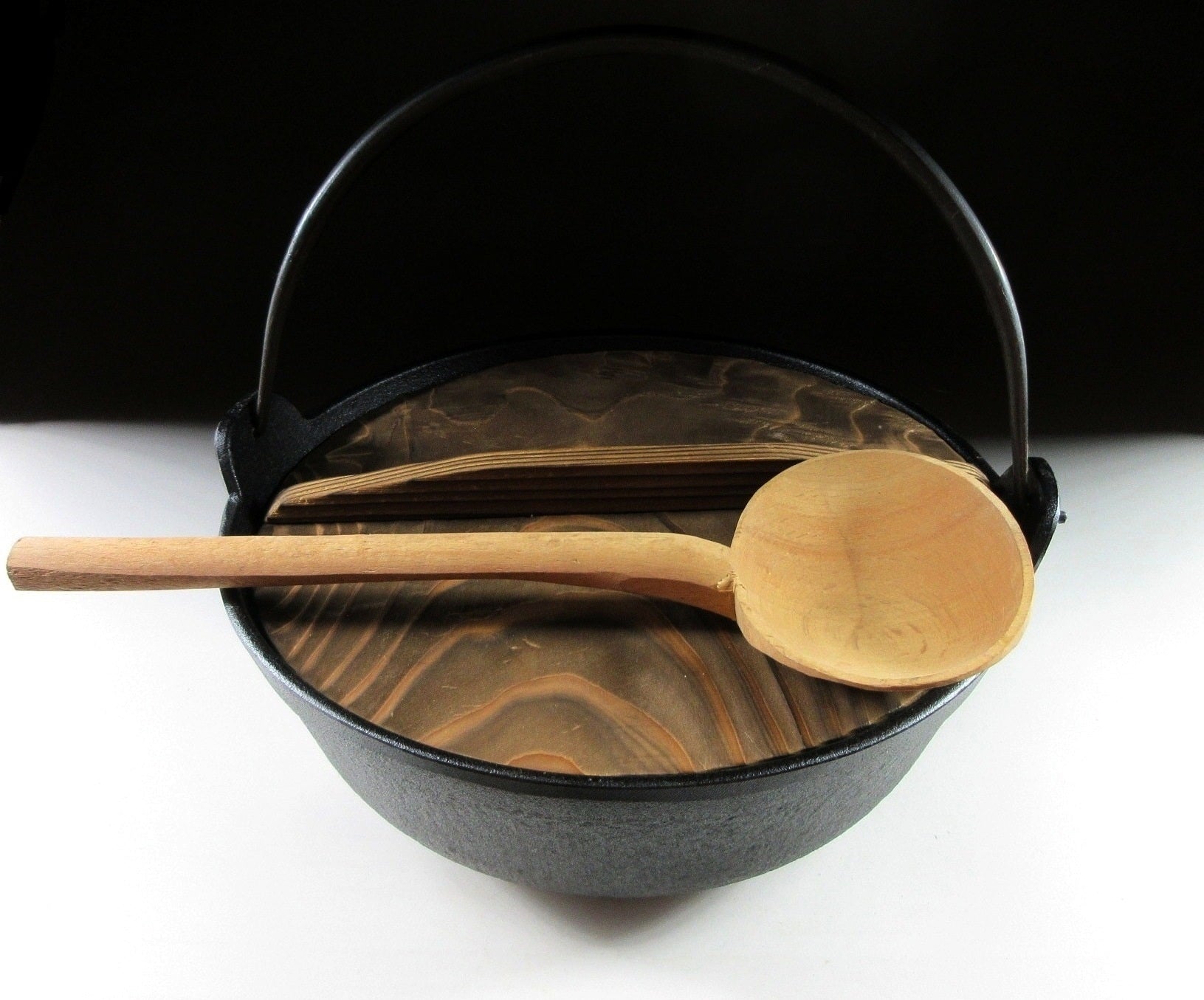 This listing is for a Nambu Tekki cast iron pot with wooden lid and spoon made around 20 years ago by Oigen. This particular item is intended for cooking meals over a hearth, and is ideal for camping or cooking outdoors. Before you begin using the pot for the first time it is recommended to boil water in it for 5 minutes, discard the water, then repeat the process. After each use the pot should be aired before being packed away to prevent rust. The wooden lid and spoon should also be air dried thoroughly before storing. The mark of the foundry can be found on the bottom, and it comes with its original paper storage box. It also comes with a Japanese language profile paper about Nambu Tekki, as well as Japanese care instructions.