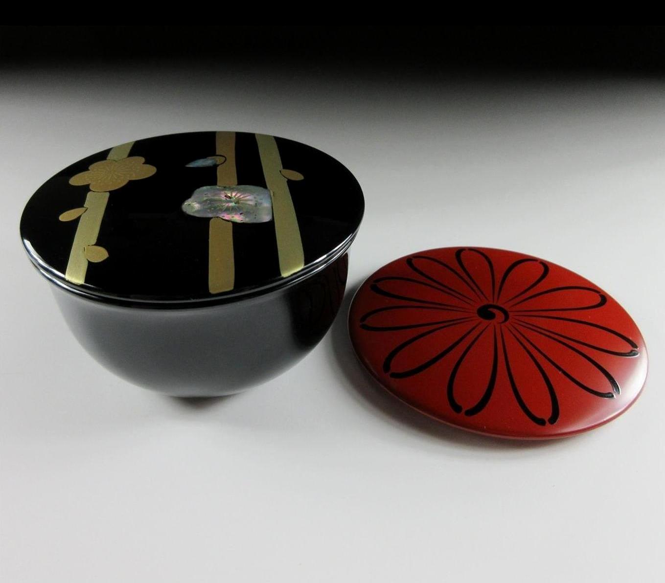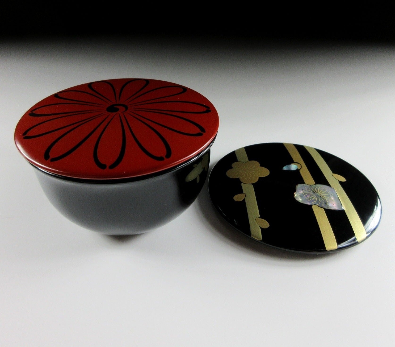 This listing is for a Wajima lacquerware ‘shunju’ spring and autumn natsume made around 20-30 years ago by Okamoto Yosai. Shunju natsume typically come with two lids – one for spring usually decorated with ume blossoms, and another for autumn featuring red lacquer with a chrysanthemum motif. The caddy in this listing is made of wood and is coated in multiple layers of black lacquer. The spring lid features gold makie and mother of pearl inlay, and the fall lid is hand-painted. It comes with its original signed wooden storage box for when it’s not in use.