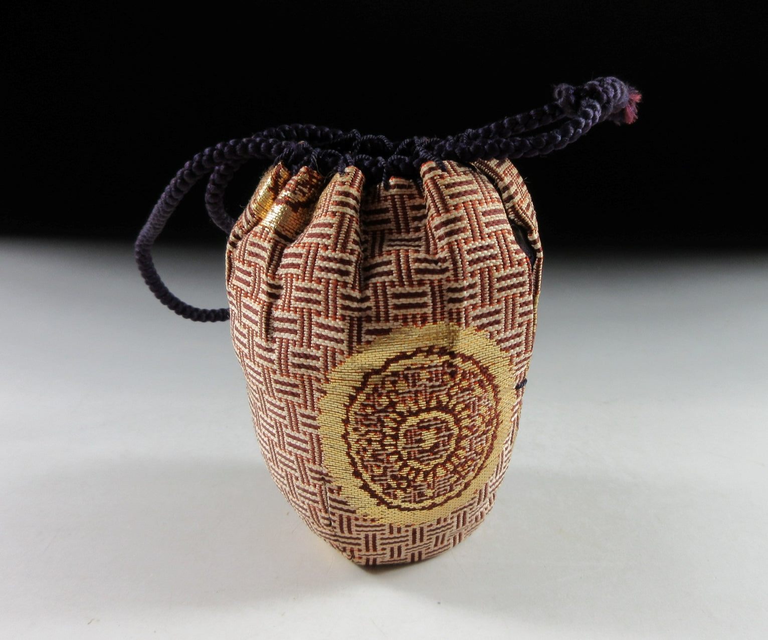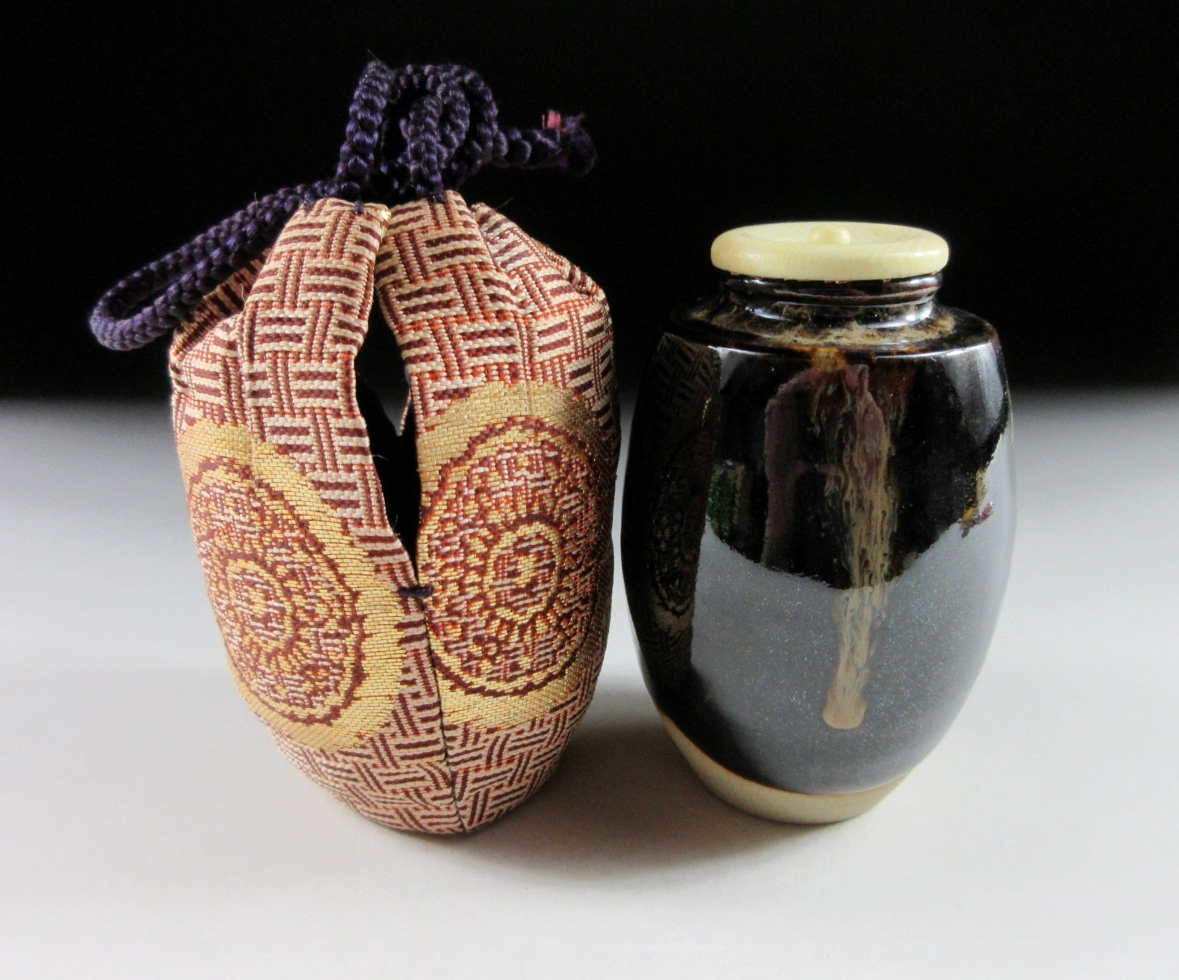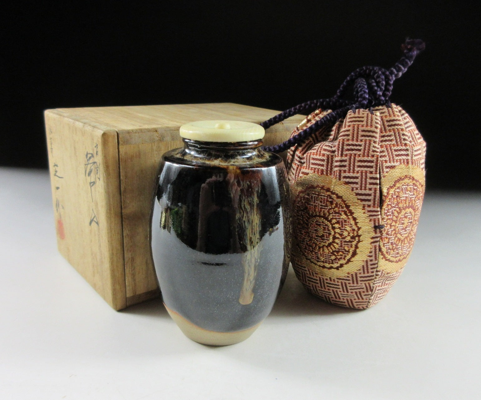 This listing is for a Kyo-ware chaire made around 30 years ago by noted potter, Oketani Teiichi II. It is wheel-thrown and has a katatsuki high shouldered shape, and it is coated in glossy dark brown glaze with splendid yohen markings on the front. Yohen refers to changes that take place in the kiln that cause the glaze to run during firing. In this case, light coloured streaks have formed as a result of glaze running down the front during the firing process. The lid has been lined with gold foil which allows the lid the fit closely into the opening on the chaire. The gold foil is important because it does not corrode like other materials do. The shifuku pouch is actually to protect the tea, not the chaire. Its purpose is to put pressure on the lid and hold it into place once the drawstring is tied over the top. The shifuku in this listing is red and gold and consists of a repeating geometric pattern with a circular medallion design. The signature of the potter can be found on the bottom, and it comes with its original signed wooden storage box.