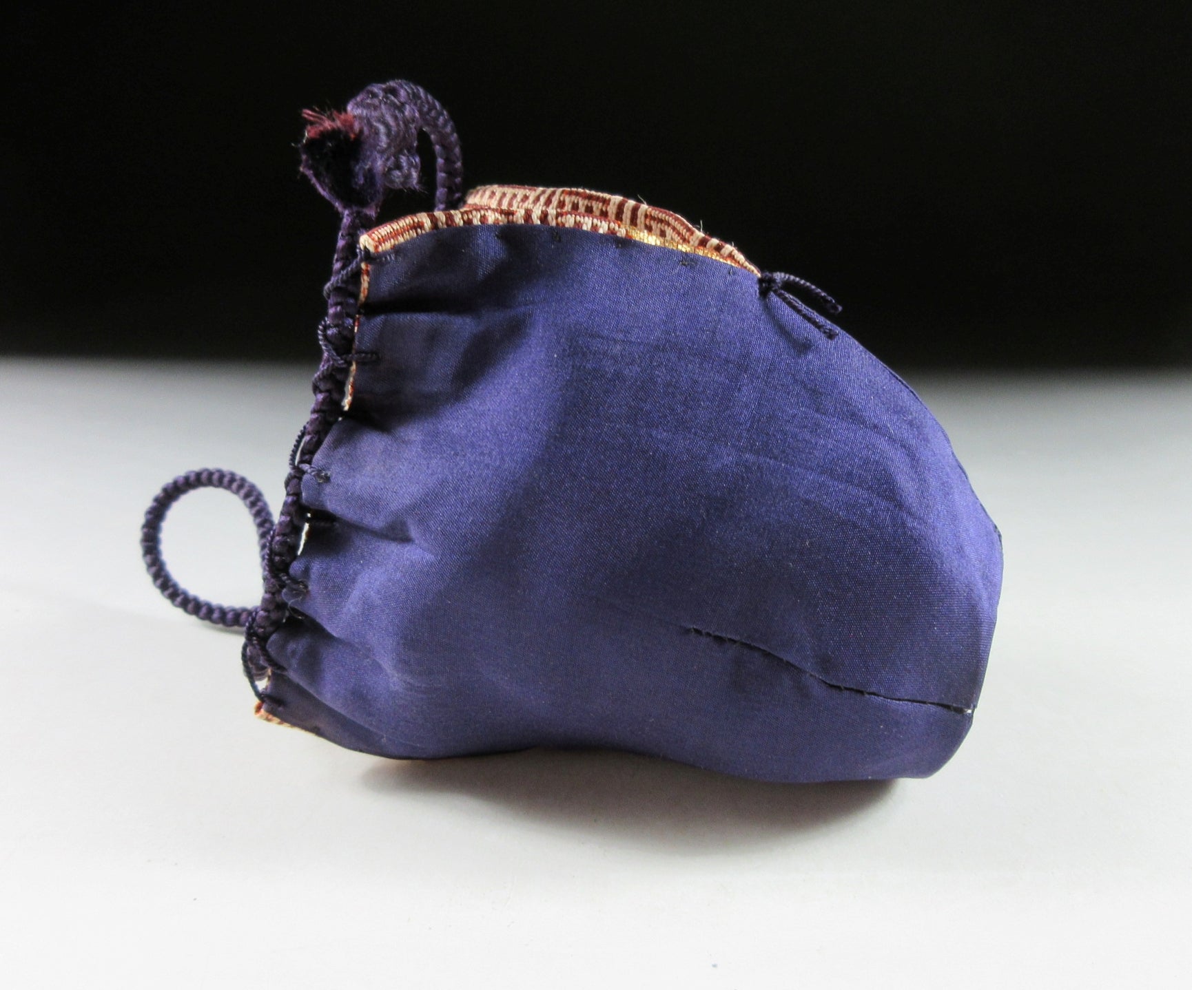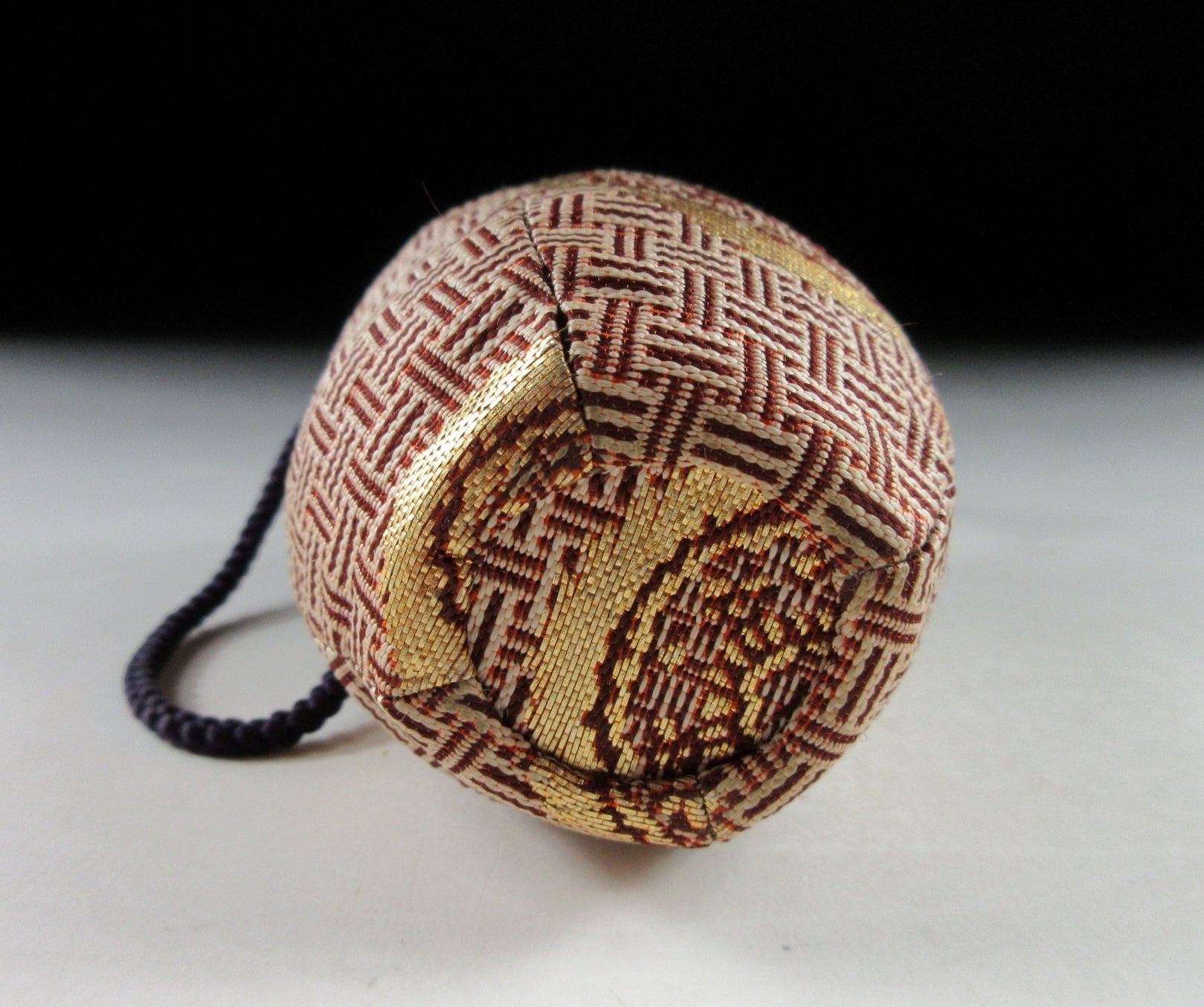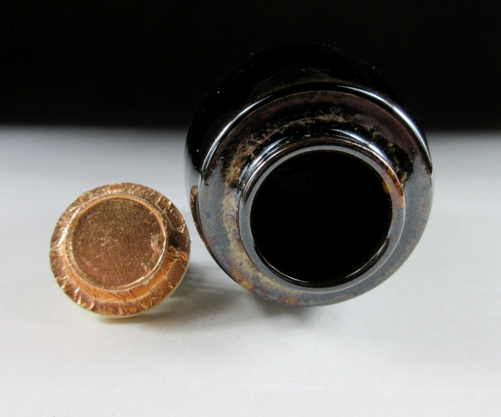 This listing is for a Kyo-ware chaire made around 30 years ago by noted potter, Oketani Teiichi II. It is wheel-thrown and has a katatsuki high shouldered shape, and it is coated in glossy dark brown glaze with splendid yohen markings on the front. Yohen refers to changes that take place in the kiln that cause the glaze to run during firing. In this case, light coloured streaks have formed as a result of glaze running down the front during the firing process. The lid has been lined with gold foil which allows the lid the fit closely into the opening on the chaire. The gold foil is important because it does not corrode like other materials do. The shifuku pouch is actually to protect the tea, not the chaire. Its purpose is to put pressure on the lid and hold it into place once the drawstring is tied over the top. The shifuku in this listing is red and gold and consists of a repeating geometric pattern with a circular medallion design. The signature of the potter can be found on the bottom, and it comes with its original signed wooden storage box.