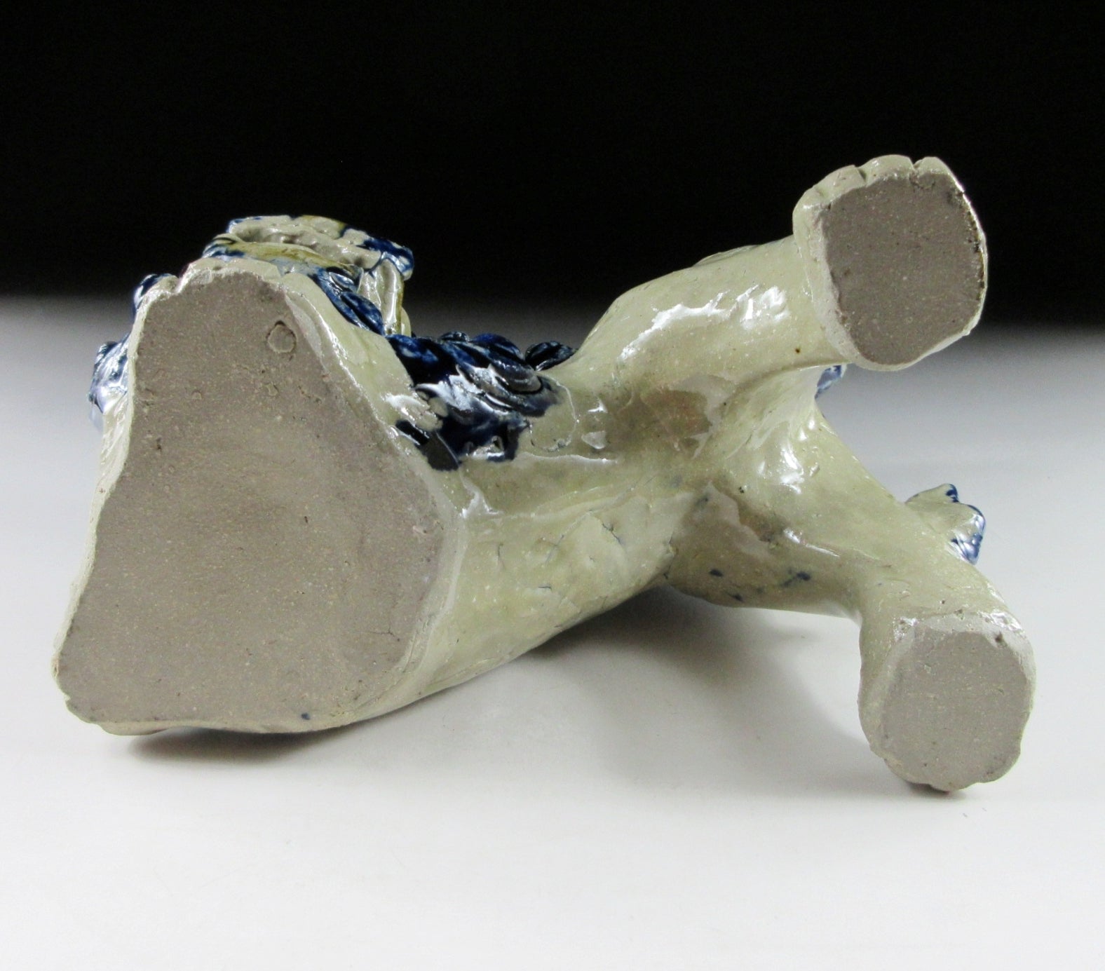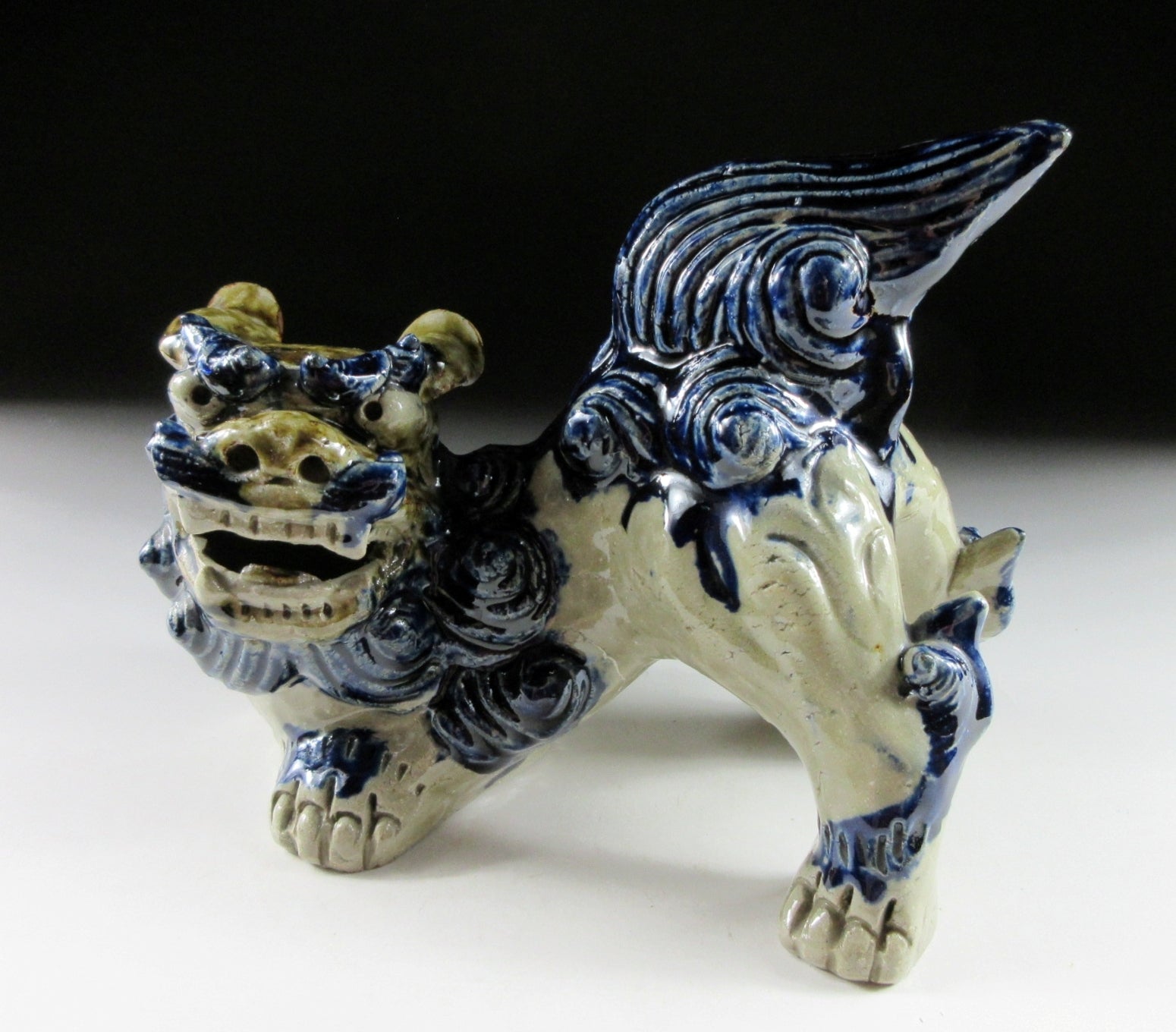 This listing is for a shisa okimono made about 30 years ago. It features a mix of blue and amber coloured glaze and is an open-mouth male lion dog. This piece is ideal as a garden ornament, or for guarding your front door!