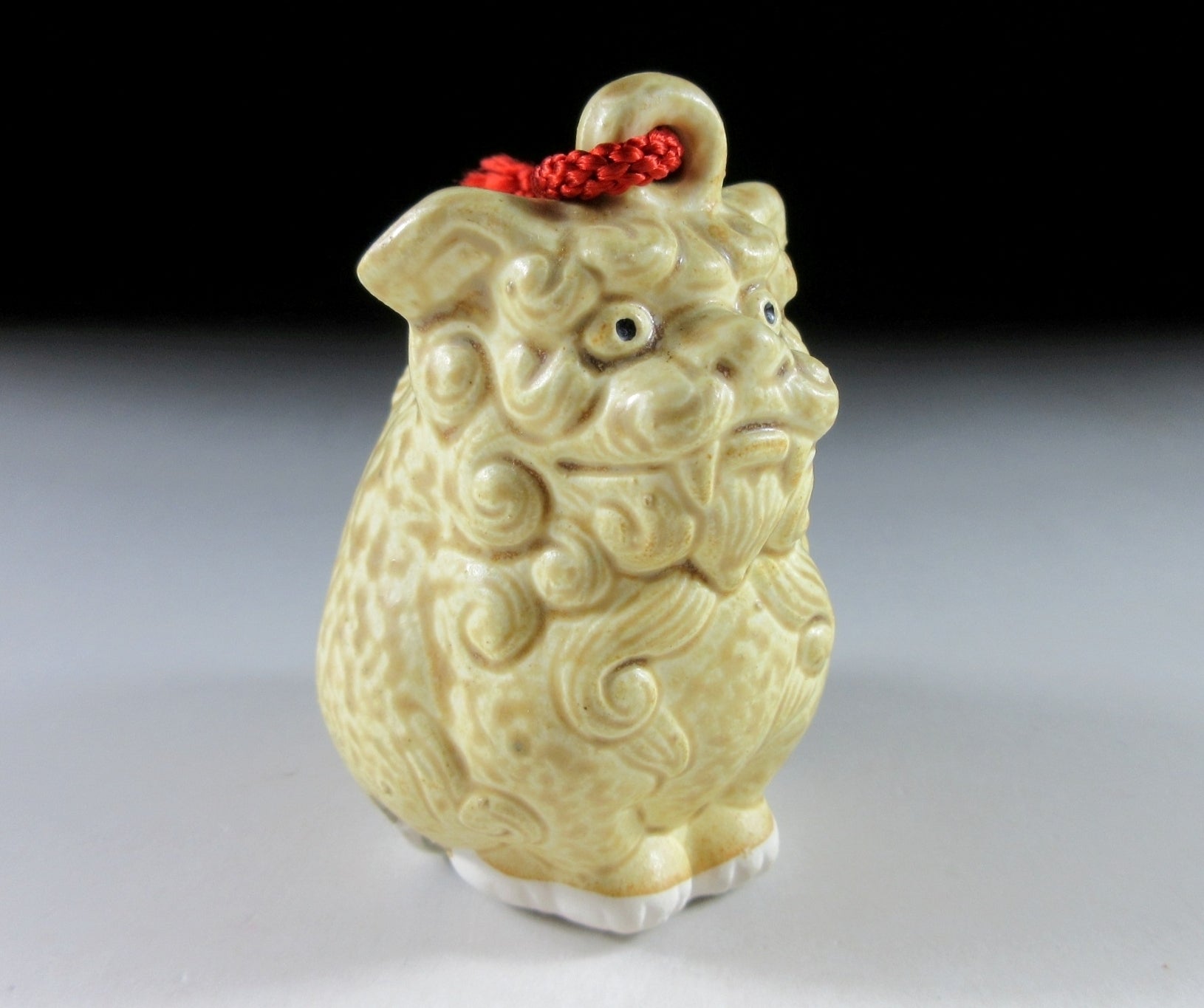 This listing is for a small shisa bell made around 5 years ago. It is made of stoneware slip and moulded in a sitting pose, and it has a red piece of cord attached to the top to enable easy handling. Shisa are a traditional Ryukyuan decoration, often in pairs, resembling a cross between a lion and a dog, from Okinawan mythology. People place pairs of shisa on their rooftops or flanking the gates to their houses. Shisa are believed to protect from homes from various types of evils. When in pairs, the left shisa traditionally has a closed mouth, the right one an open mouth. The open mouth wards off evil spirits, and the closed mouth keeps good spirits in.
