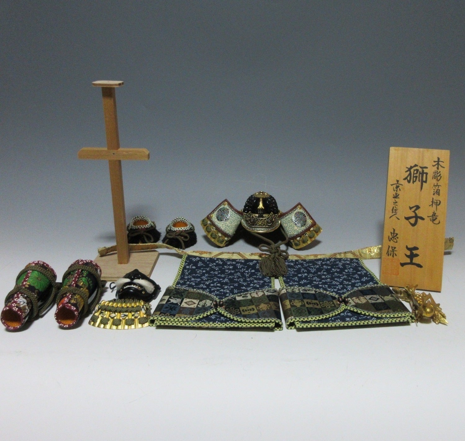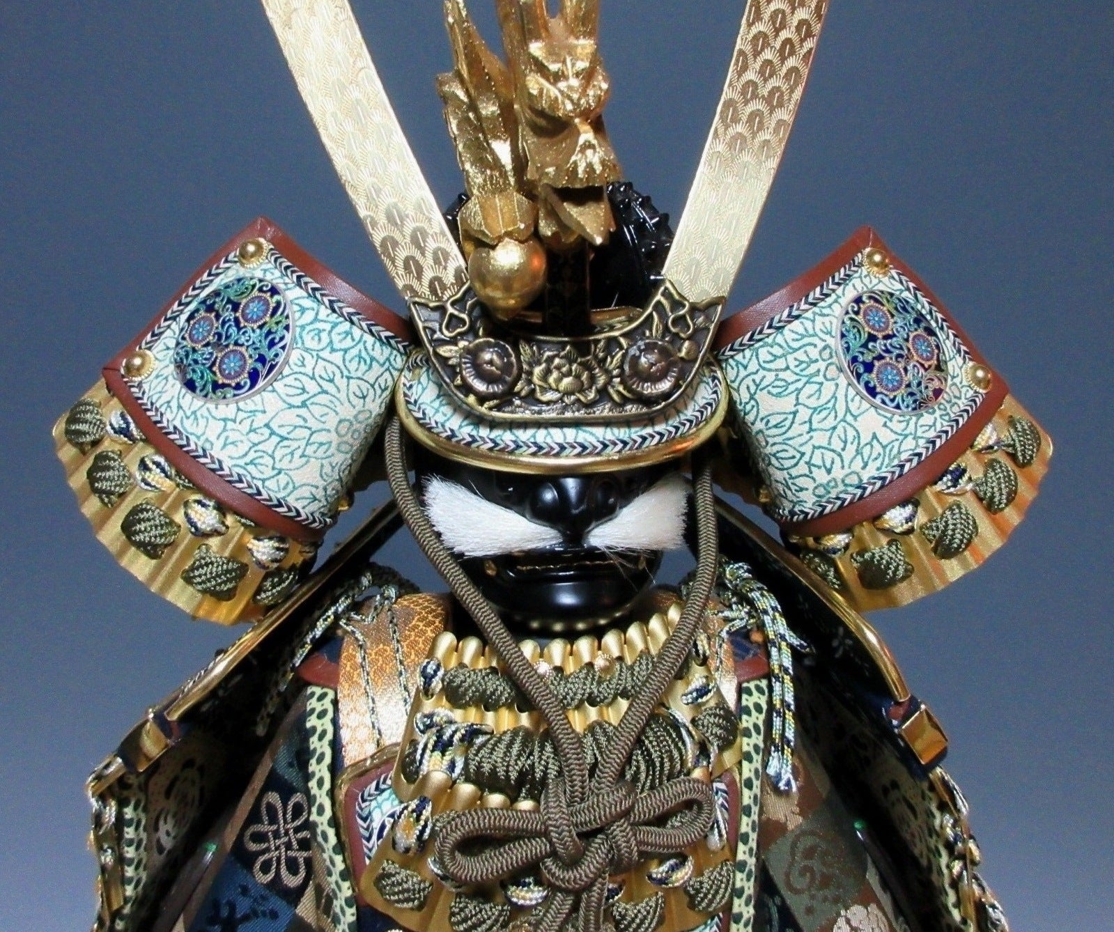 This listing is for an o-yoroi samurai armour decoration made 38 years ago by master craftsman, Okoshi Tadayasu II. The set consists of a small armour, a wooden stand, an Echizen lacquerware storage chest and also an outer paper box to protect the set during storage. It also comes with a feather duster, a certificate of authentication, a stamped plaque and a colour pamphlet. These types of decorations are intended for Tango-no-Sekku celebrations held on May 5th. Tango-no-Sekku was a boy’s day festival although now it is referred to as Children’s Day. The decoration in this listing has been very well taken care of.