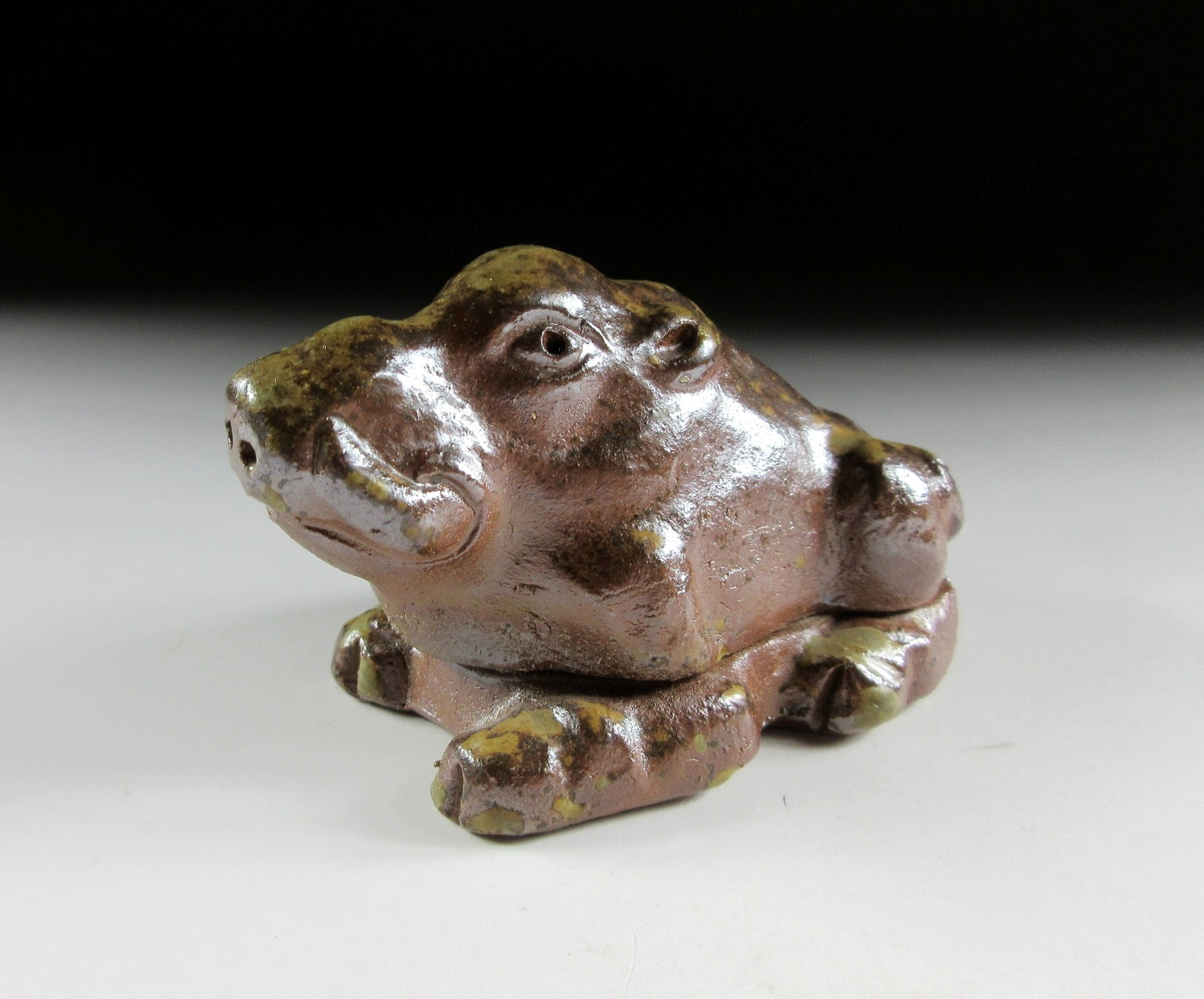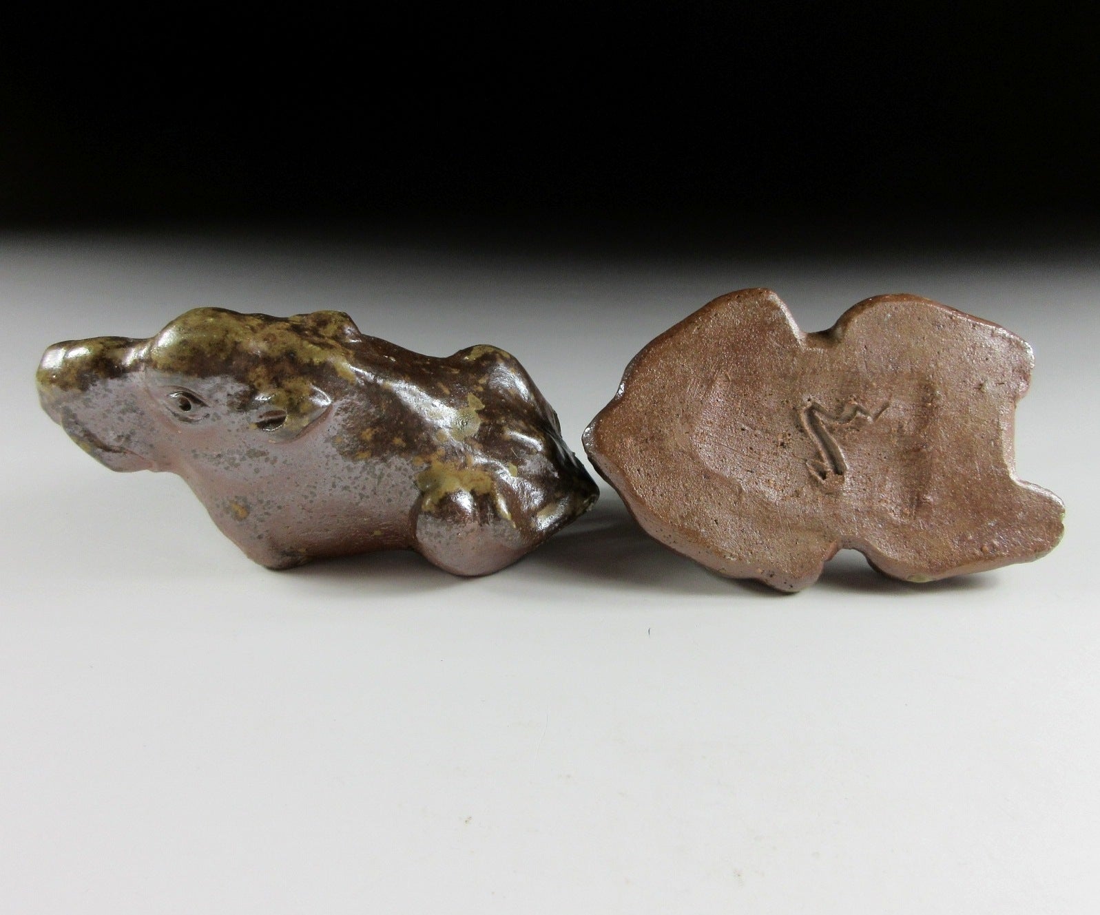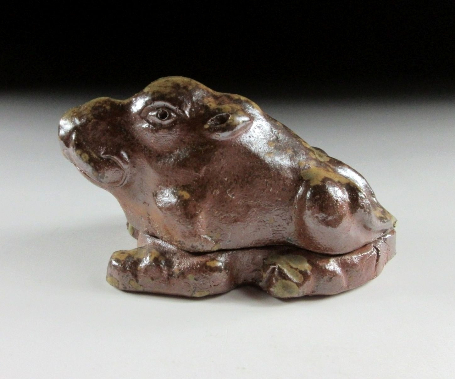 This listing is for a Bizen-ware kogo made around 20 years ago by noted potter, Okumoto Kenichi. It has been moulded into a boar, and there’s a sprinkling of red pine fly ash on the exterior. It’s suitable for holding both kneaded or woodchip incense, and was most likely made to commemorate the Year of the Boar back in 1995. The signature of the potter can be found on the bottom, and it comes with a paper storage box. It also comes with a Japanese language profile about the potter.