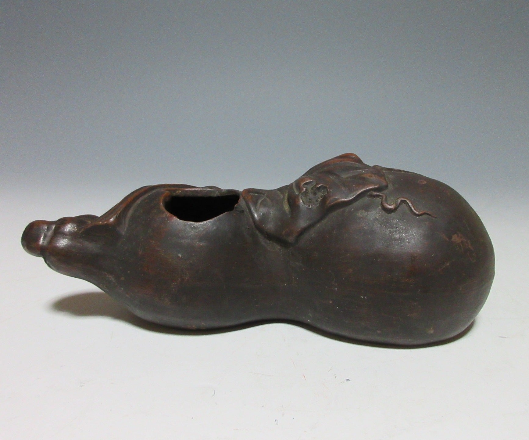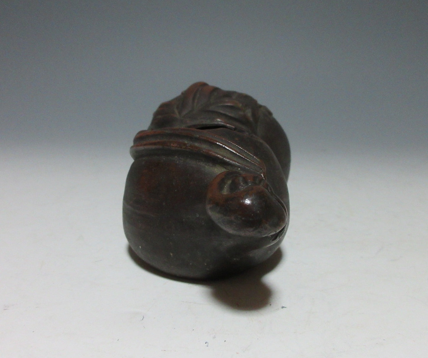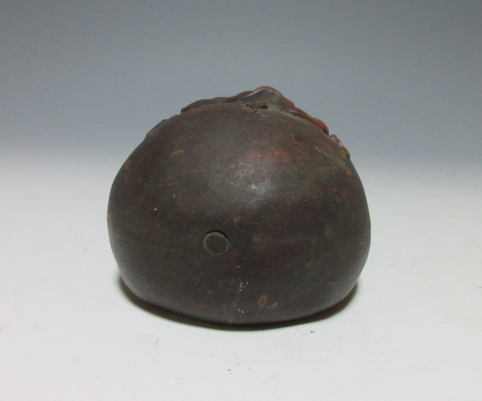 This listing is for an old Bizen wall vase made around 80 years ago. This piece has been made using a slip mould and shaped to resemble a hyotan. Hyotan are an auspicious symbol linked to longevity and fertility. Traditionally households grew gourds to use as flasks or containers, however the vines were also used to provide shade during the stifling summer heat. Gourds were also used as seed containers, and older Japanese will tell you that seeds kept in such containers were always fruitful. This piece doesn’t have a metal hook attached to the back, it is designed to slot onto a hook on the wall. There’s a decent sized opening to hold a small arrangement of flowers, and the stamp of the kiln can be found on the bottom.