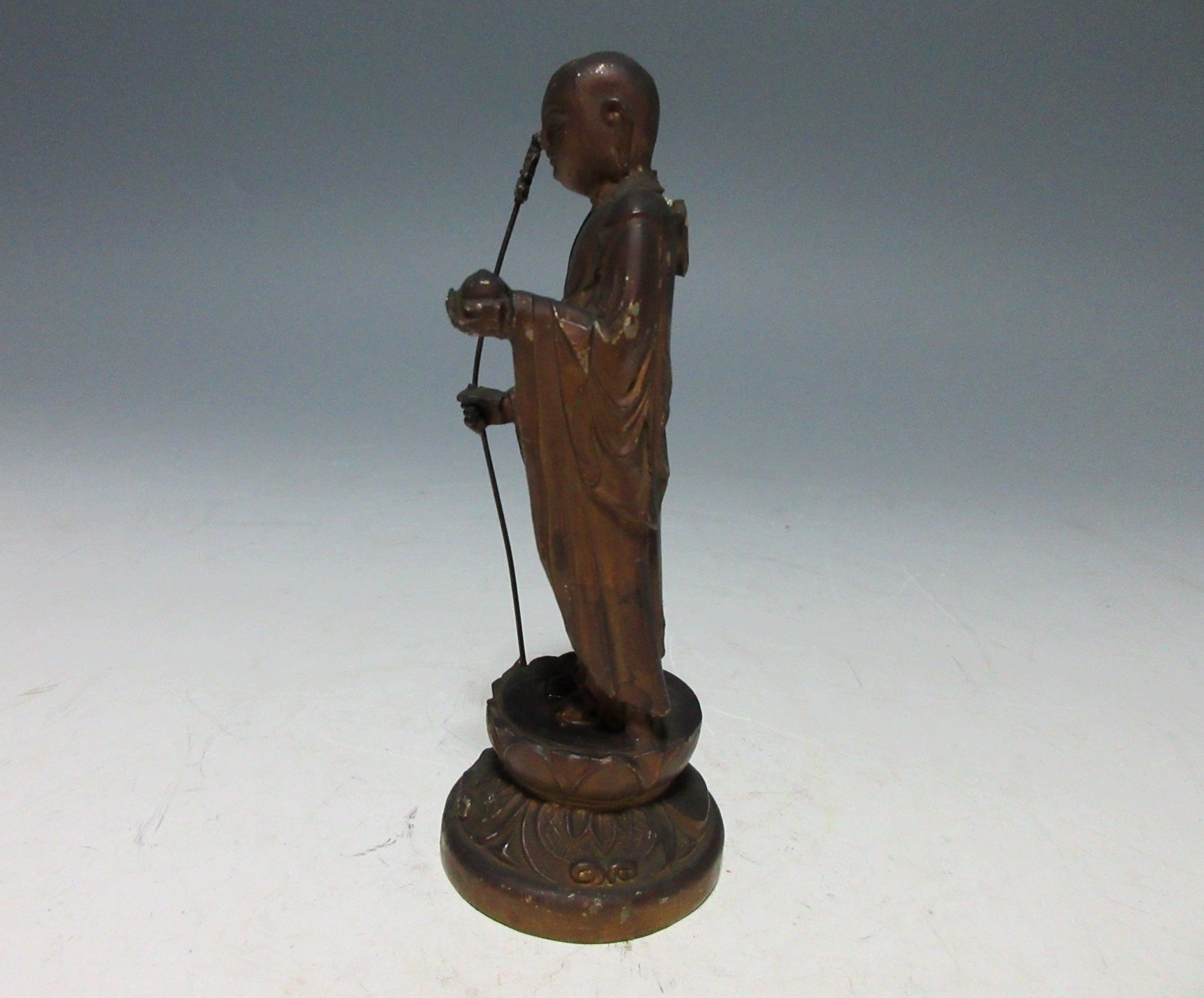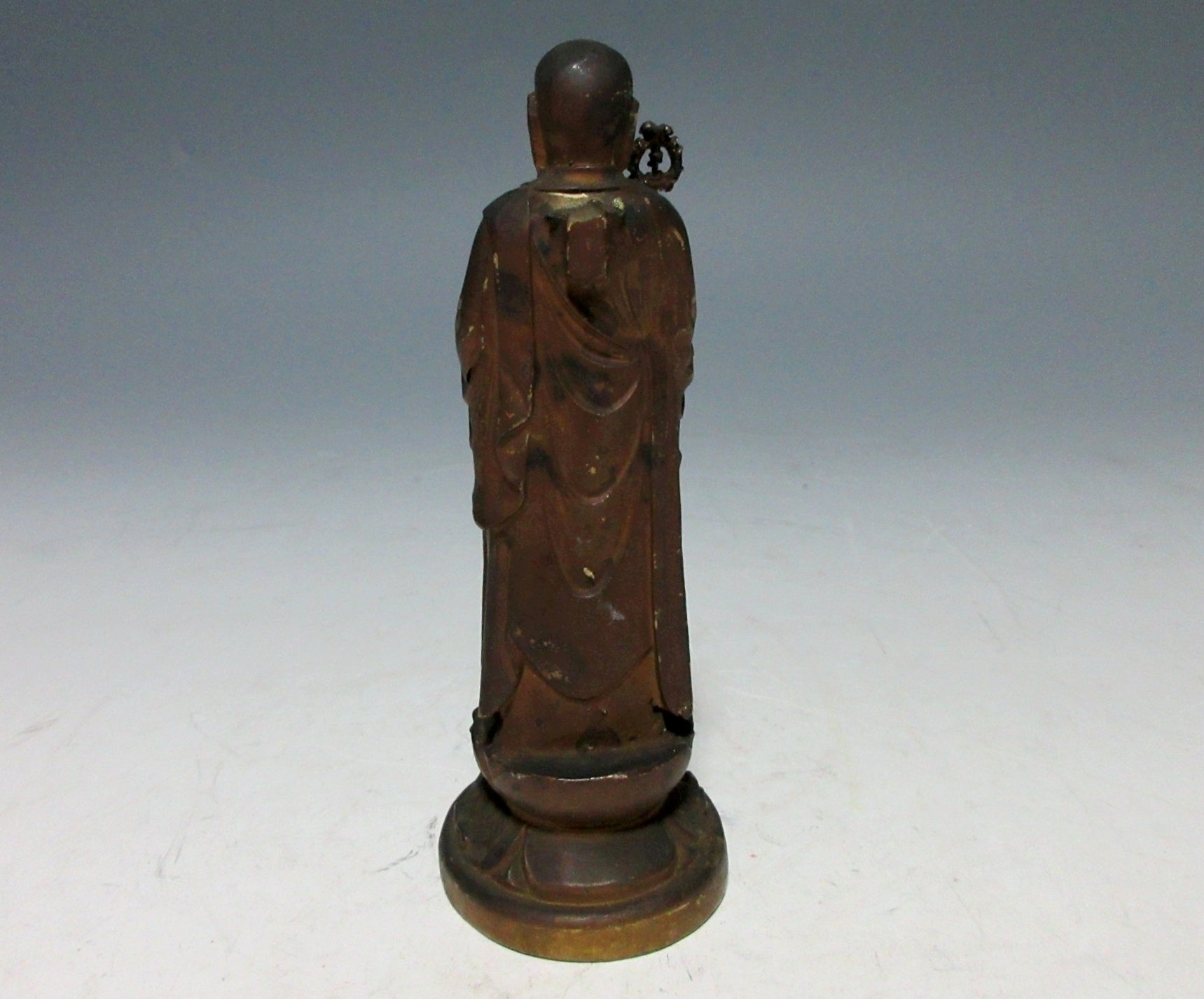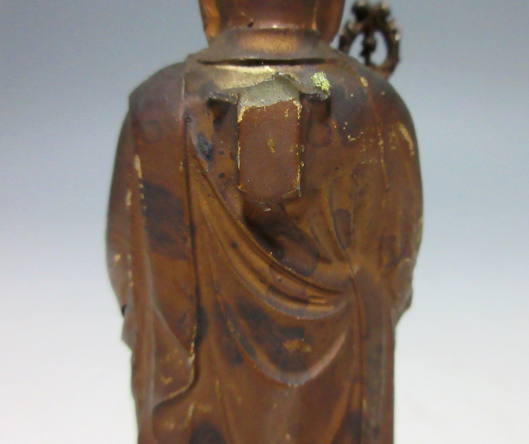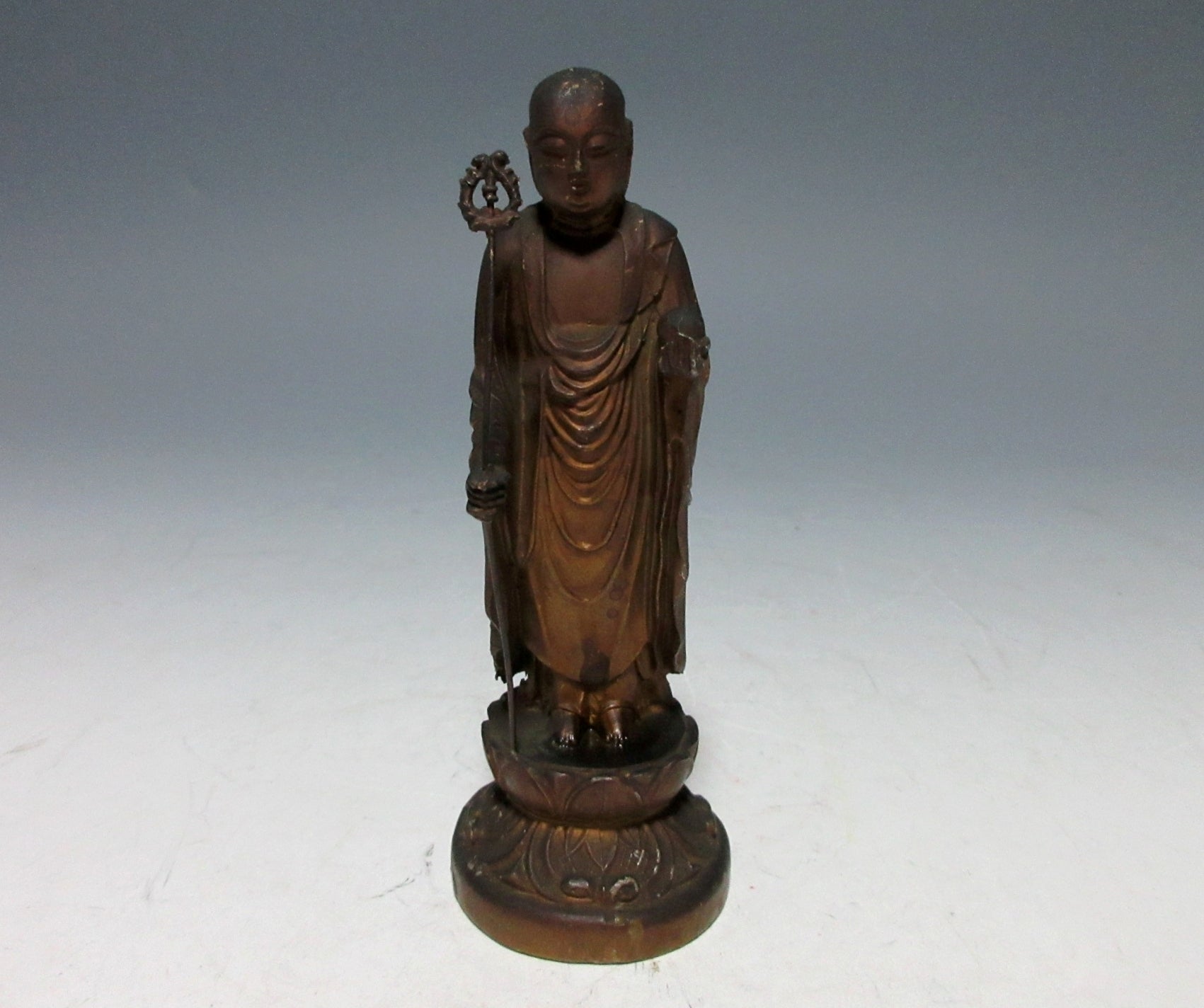 This listing is for an old Jizo Bosatsu made around 60-70 years ago. It is made of metal and depicts Jizo as an itinerant monk in robes. In his hands he carries a staff to announce his coming, and a hoju wish-fulfilling jewel to light up the darkness. He is mounted on a pedestal, and his original colour was gold.