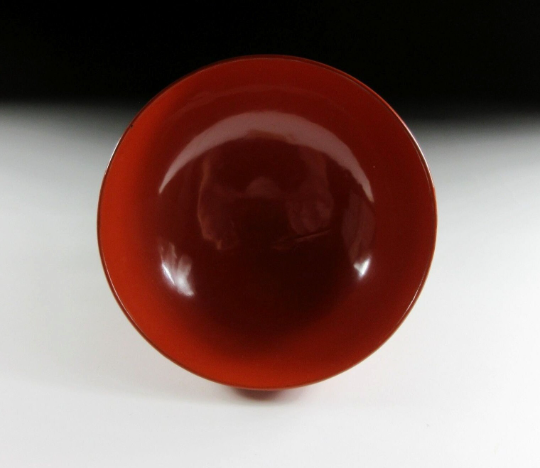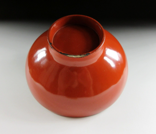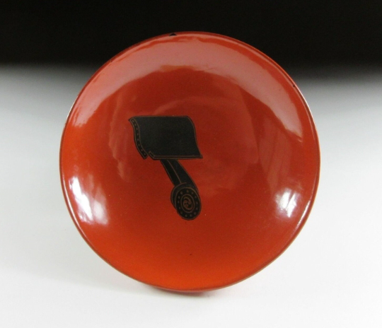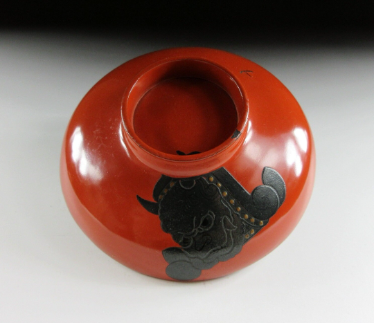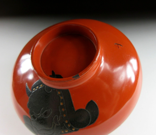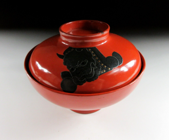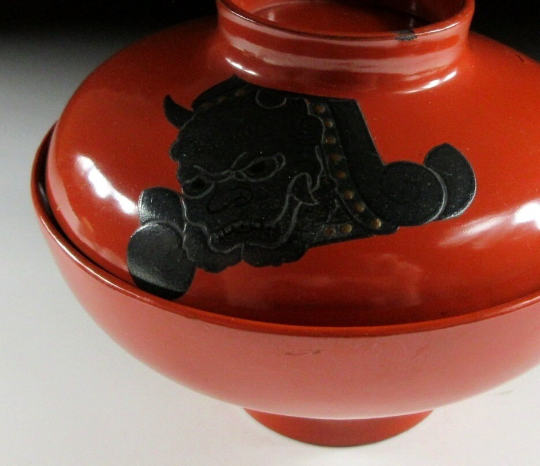 This listing is for an urushi lacquerware bowl made around 70-80 years ago. It is coated in vermilion coloured lacquer, and the lid is decorated with an onigawara roof tile motif. It’s made of wood, and the demon motif was applied using the makie technique. Onigawara are demon-head ornaments on roof tiles. It is believed that they offer protection and ensure safety in the household. They also repel evil omens attempting to enter homes, and they’re also found adorning Shinto shrines and Buddhist temples. Please read below regarding the size and condition of the bowl.