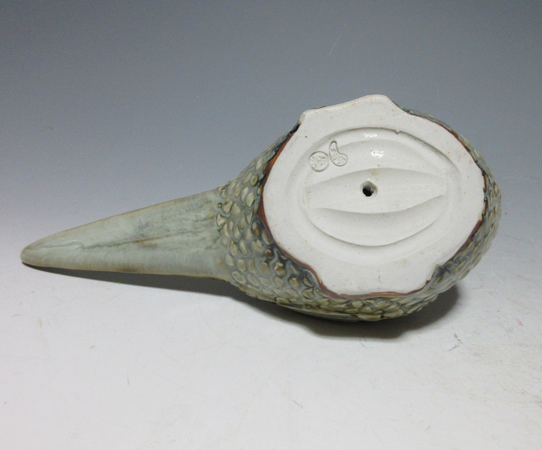This listing is for a rather robust Akahada-ware okimono made around 30 years ago by noted potter, Onishi Rakusai. It is made from a slip mould and is moulded to resemble a beautiful pheasant. In Japan, there is an old folk story about a boy named Momotaro. Momotaro was born from a giant peach that was found floating down a river nearby an old lady who was busy washing her clothes. The old lady collected the peach and took it home to eat it. When she and her husband cut the peach open they found a small boy inside. The boy’s name was Momotaro, and he told them that he was sent from the heavens to be the son they never had. As he grew older he became brave and decided to fight a group of ogres who were terrorising the area. The ogres lived on an island, and Momotaro set out to find them. En route he befriended a dog, a monkey and a pheasant, and together they beat the demons into surrender. The pheasant in this listing may be in reference to the pheasant that helped Momotaro beat down the offending ogres. The stamps of the potter can be found on the bottom, and it comes with its original signed wooden storage box. It also comes with a Japanese language profile paper about the potter.
