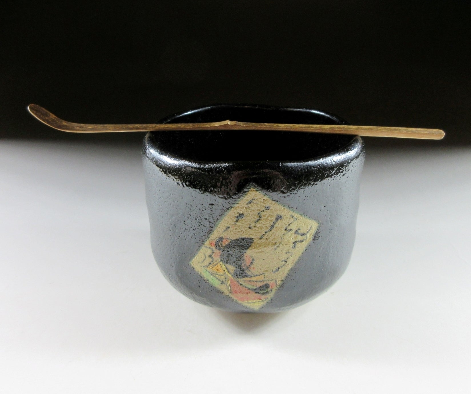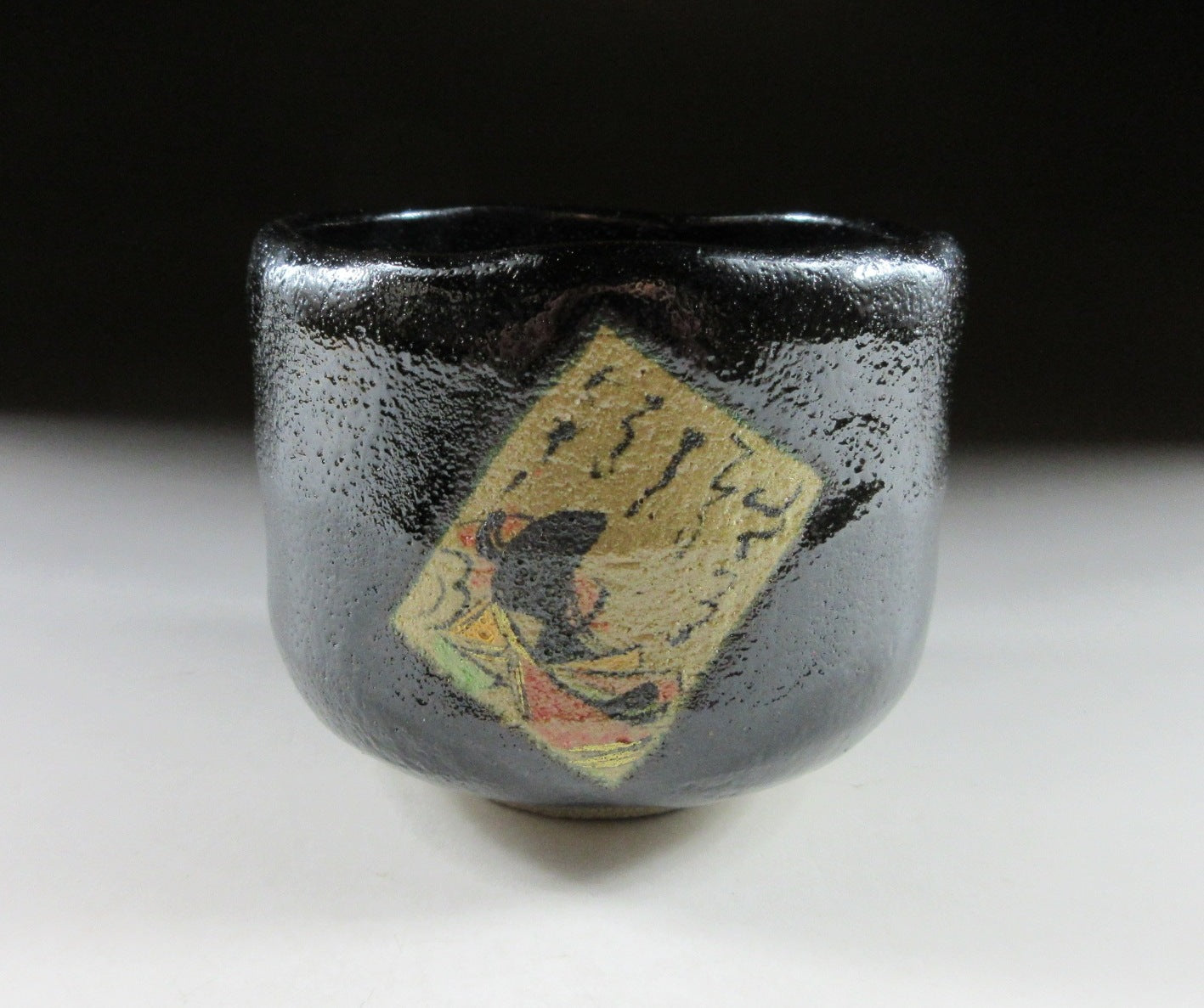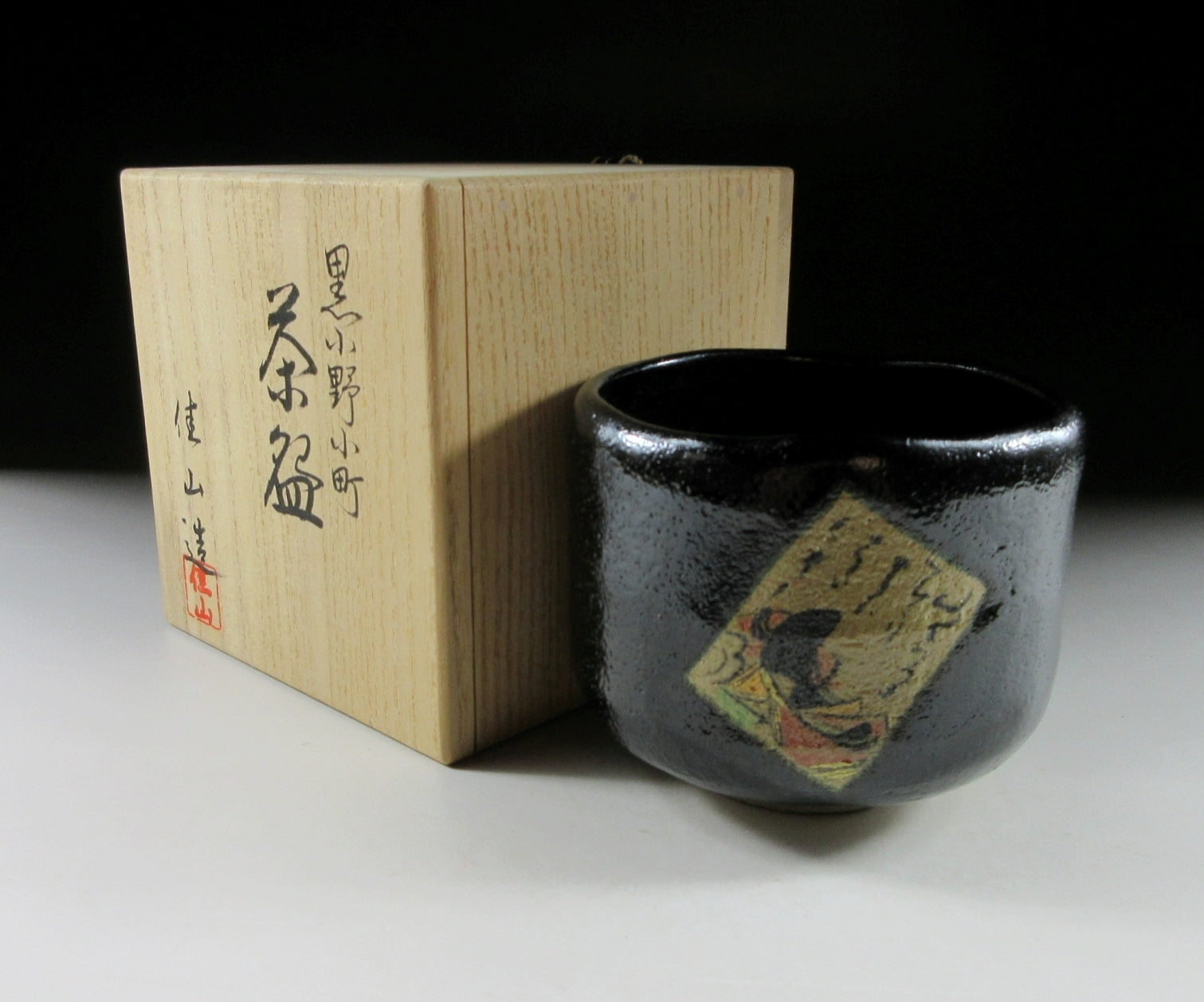 This listing is for a splendid kuro raku chawan made around 10-20 years ago by Ono Keizan. It is hand-turned and the front of the bowl features a beautifully painted depiction of Waka poet. Ono no Komachi is classified as one of the six best Waka poets of the early Heian period, and she was also renowned for her unusual beauty. This piece is relatively small in diameter and ideally suited for use during the cooler months. The stamp of the potter can be found on the bottom, and it comes with its original signed wooden storage box. *PLEASE NOTE THAT THE BAMBOO TEA SCOOP IS NOT INCLUDED.