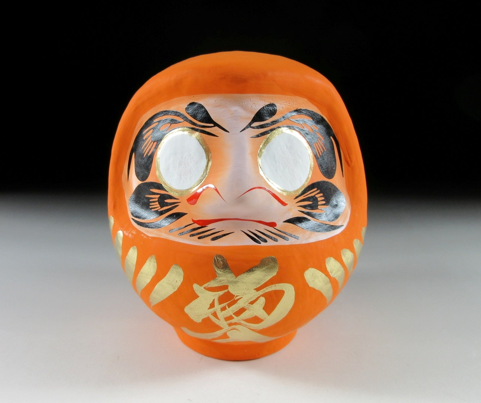 This listing is for a small Takasaki Shorinzan Fuku-Daruma. Daruma is a popular talisman of good luck, especially during New Year. When a Daruma is purchased, the owner paints a pupil on the left eye while making a wish. Once the wish is realised the right pupil is added, and then the Daruma is taken to the local temple to be burned during a special ceremony. The Daruma in this listing is orange and made of papier-mâché. Orange Daruma are thought to bring the owner safe childbirth and family prosperity. This Daruma has been blessed at the temple and there’s a blessing paper attached to the back.