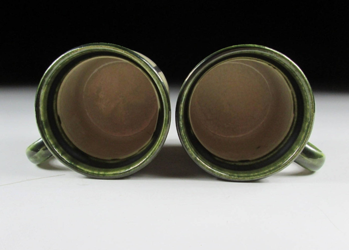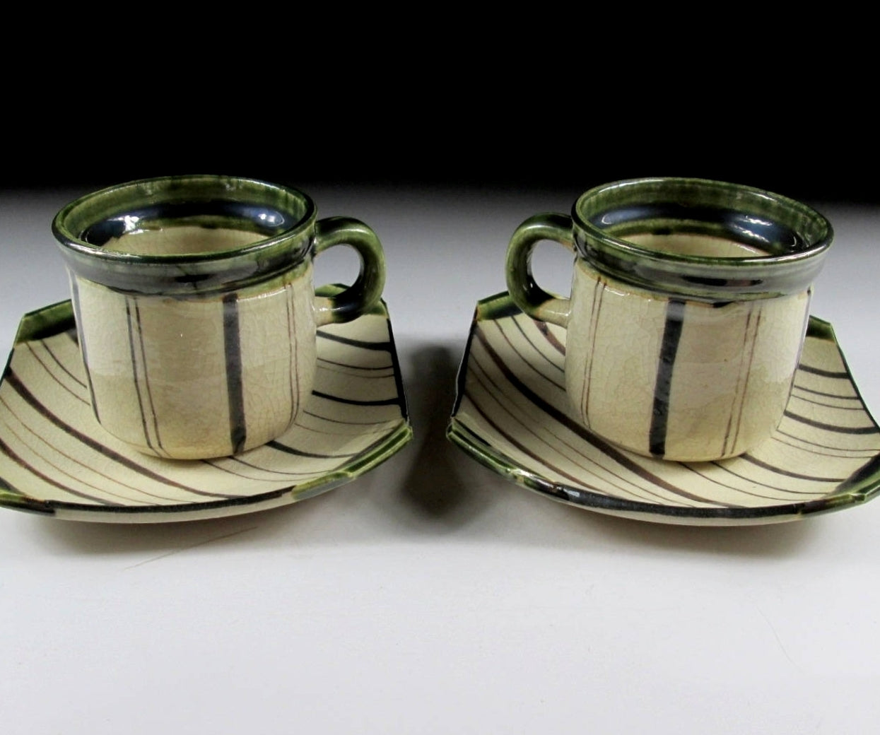 This listing is for a pair of Oribe-ware espresso cup and saucers made around 20-30 years ago by Tohzan Gama. Each piece is wheel-thrown and decorated with a simple yet modern striped pattern, and trimmed with green copper glaze. The stamp of the kiln can be found on the bottom of each piece.