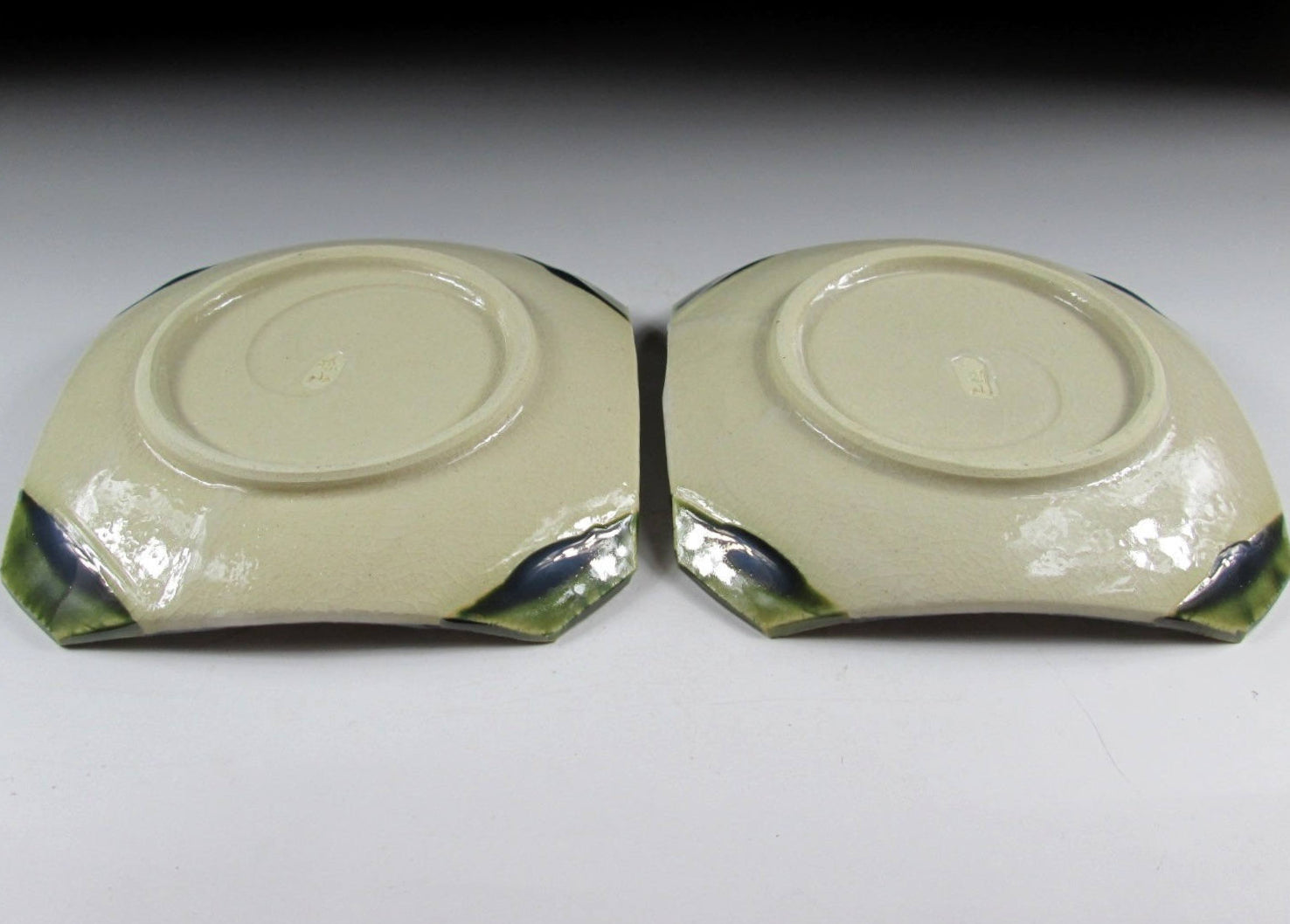 Oribe-ware uses blue or green copper glazes and often features simple design motifs such as squares, rectangles, and circles. It takes its name from Furuta Oribe, a tea master and pupil of Sen Rikyu. For Japanese potters, it was the first use of colour in the glazing of stoneware, and at the time was said to have a very simple and modernistic look about it. These days Oribe-ware still enjoys much popularity, with plates, bowls, and cups commonly produced in and around the Seto area.