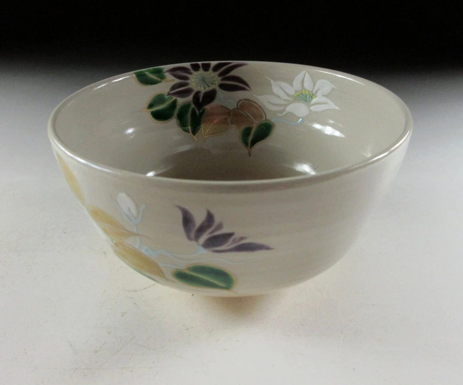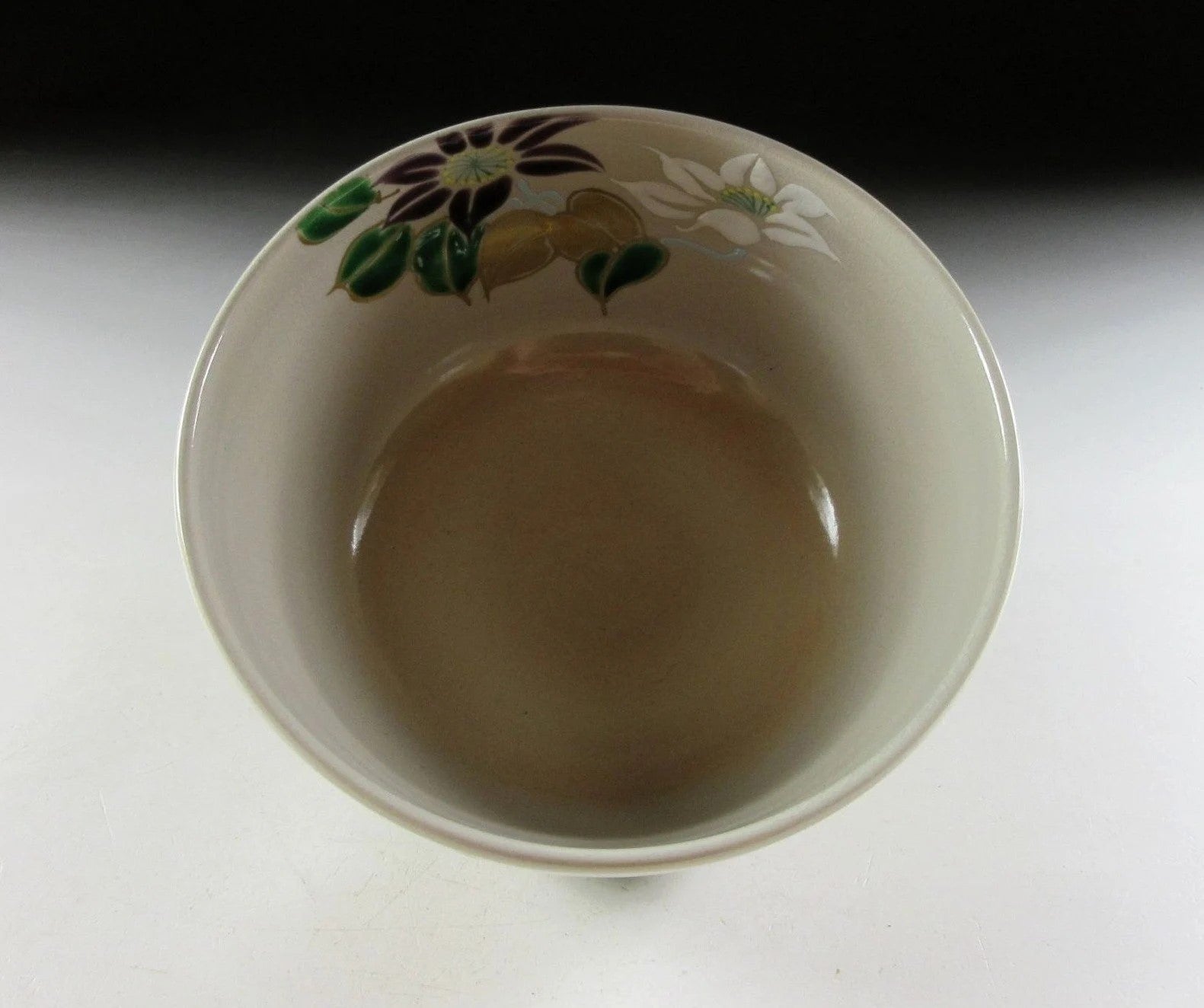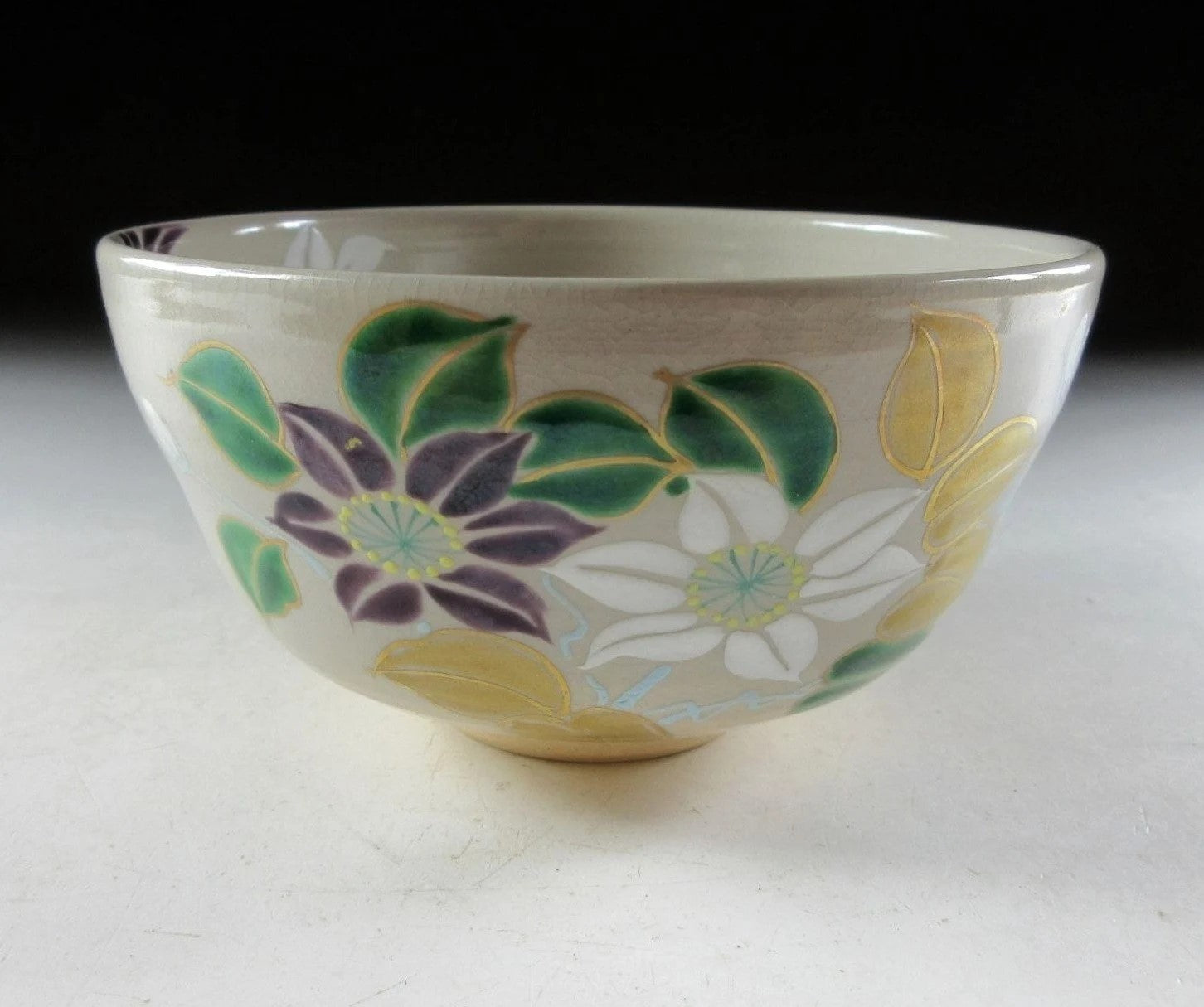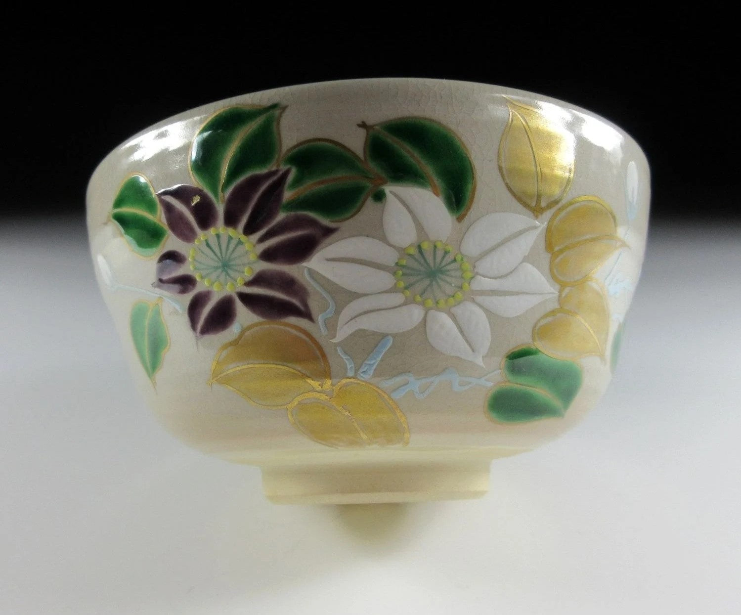 This listing is for an attractive Kyo-ware chawan made around 20 years ago by Oshikoji Gama. It is wheel-thrown and the front is decorated with purple and white clematis flowers with gold enamel leaves. Clematis is an intriguing climbing plant that blooms from late spring to early summer, the perfect motif for a summer tea bowl. The stamp of the kiln can be found on the bottom, and it comes with its original paper storage box.