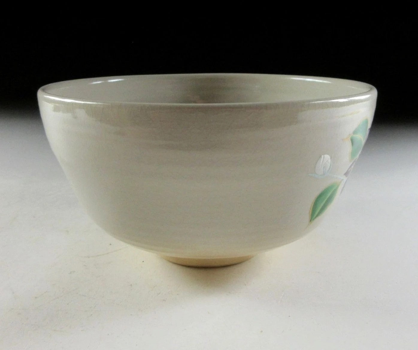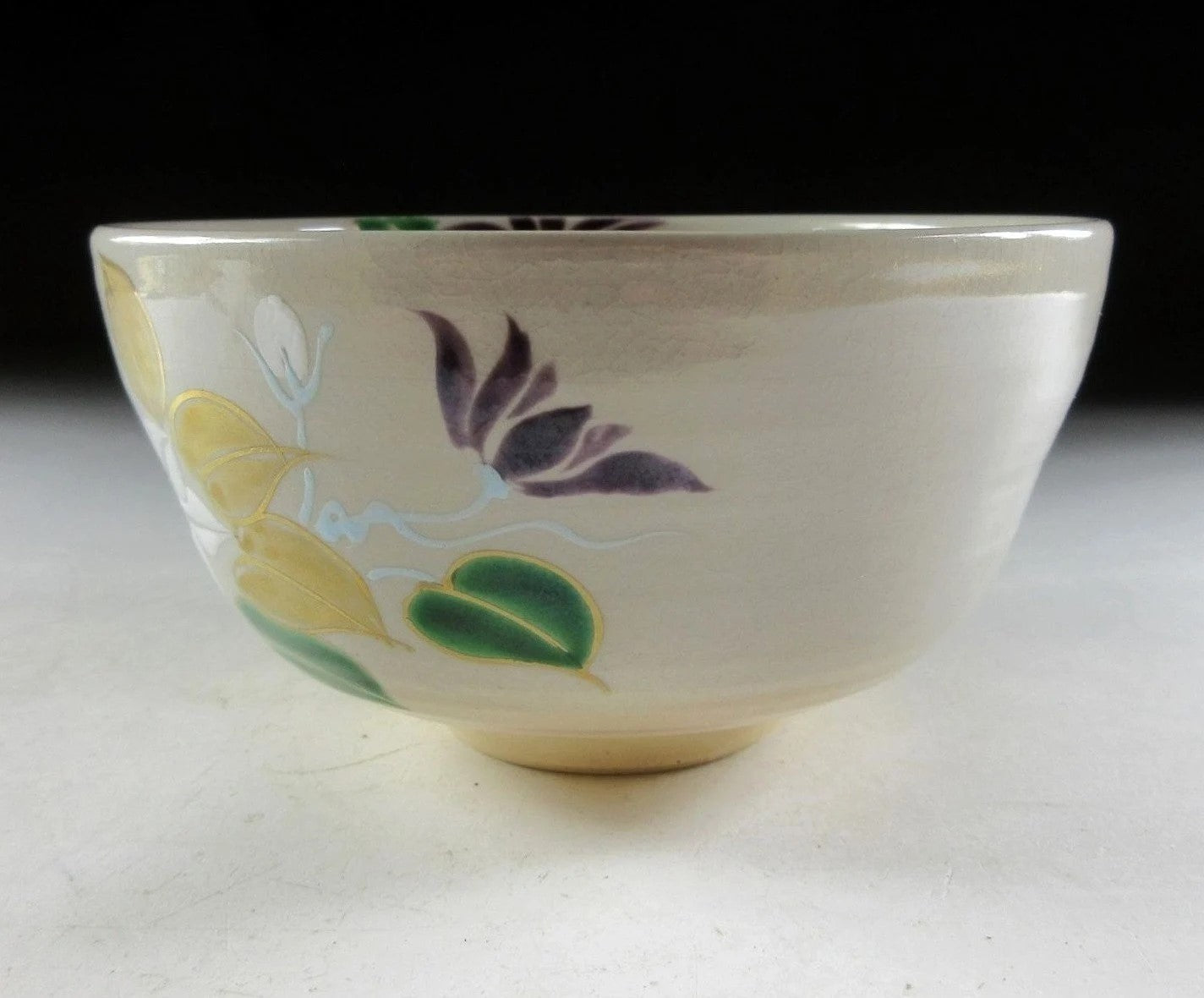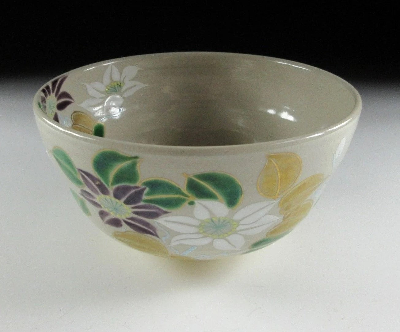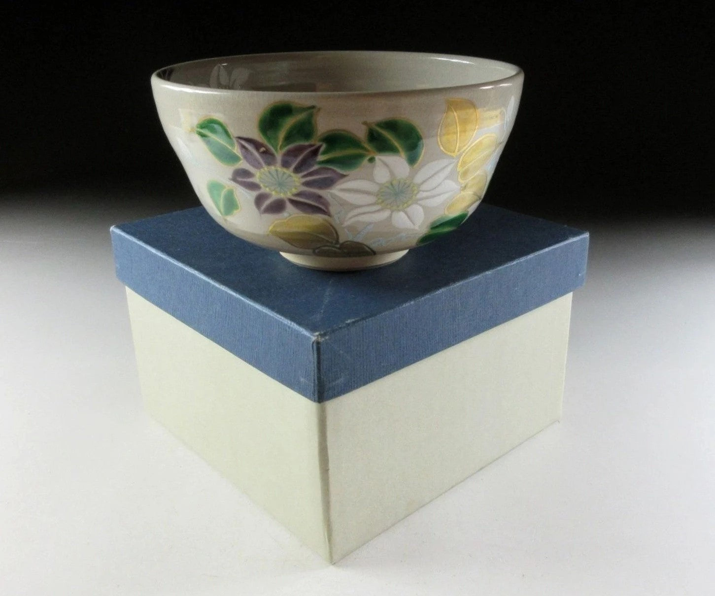 This listing is for an attractive Kyo-ware chawan made around 20 years ago by Oshikoji Gama. It is wheel-thrown and the front is decorated with purple and white clematis flowers with gold enamel leaves. Clematis is an intriguing climbing plant that blooms from late spring to early summer, the perfect motif for a summer tea bowl. The stamp of the kiln can be found on the bottom, and it comes with its original paper storage box.