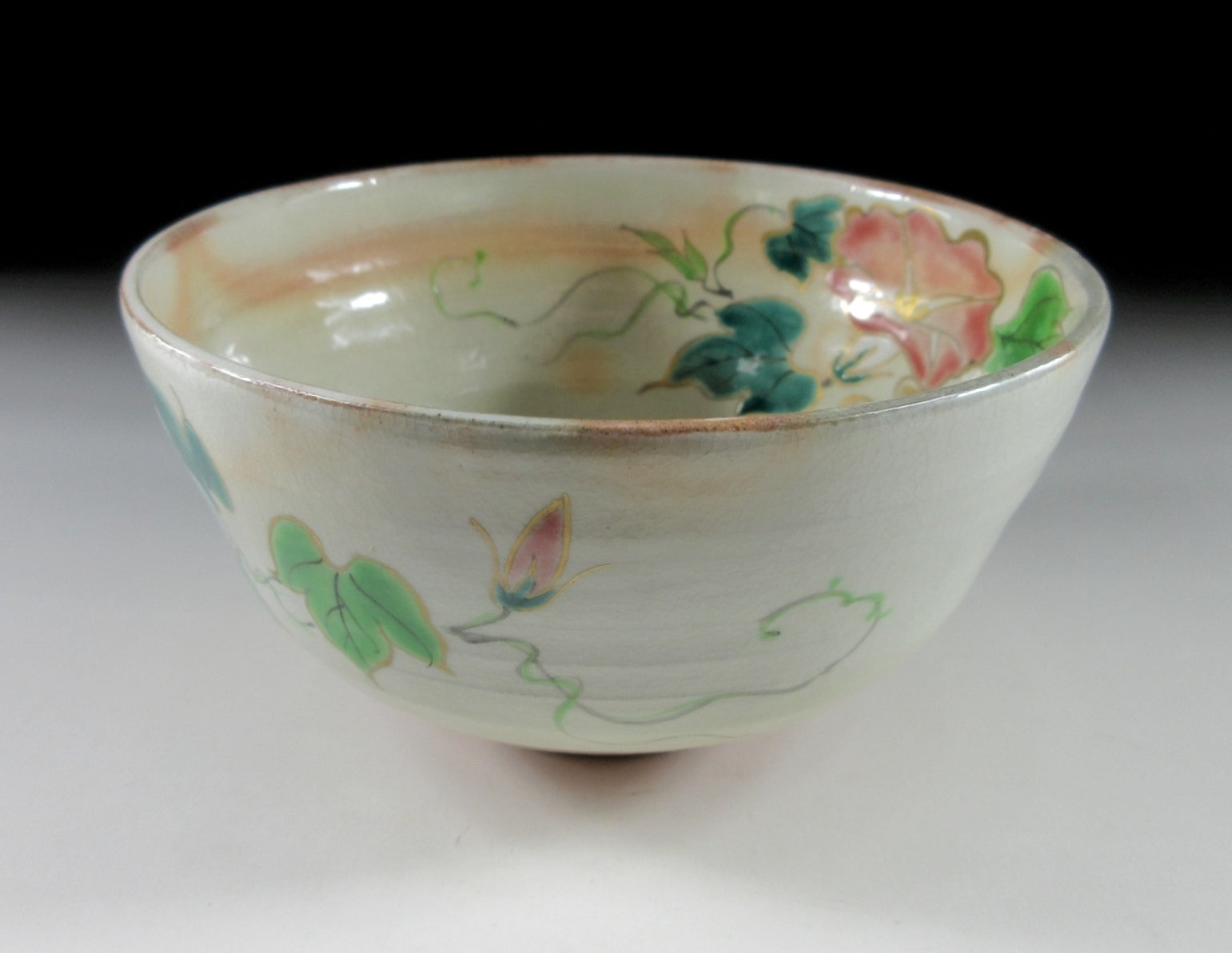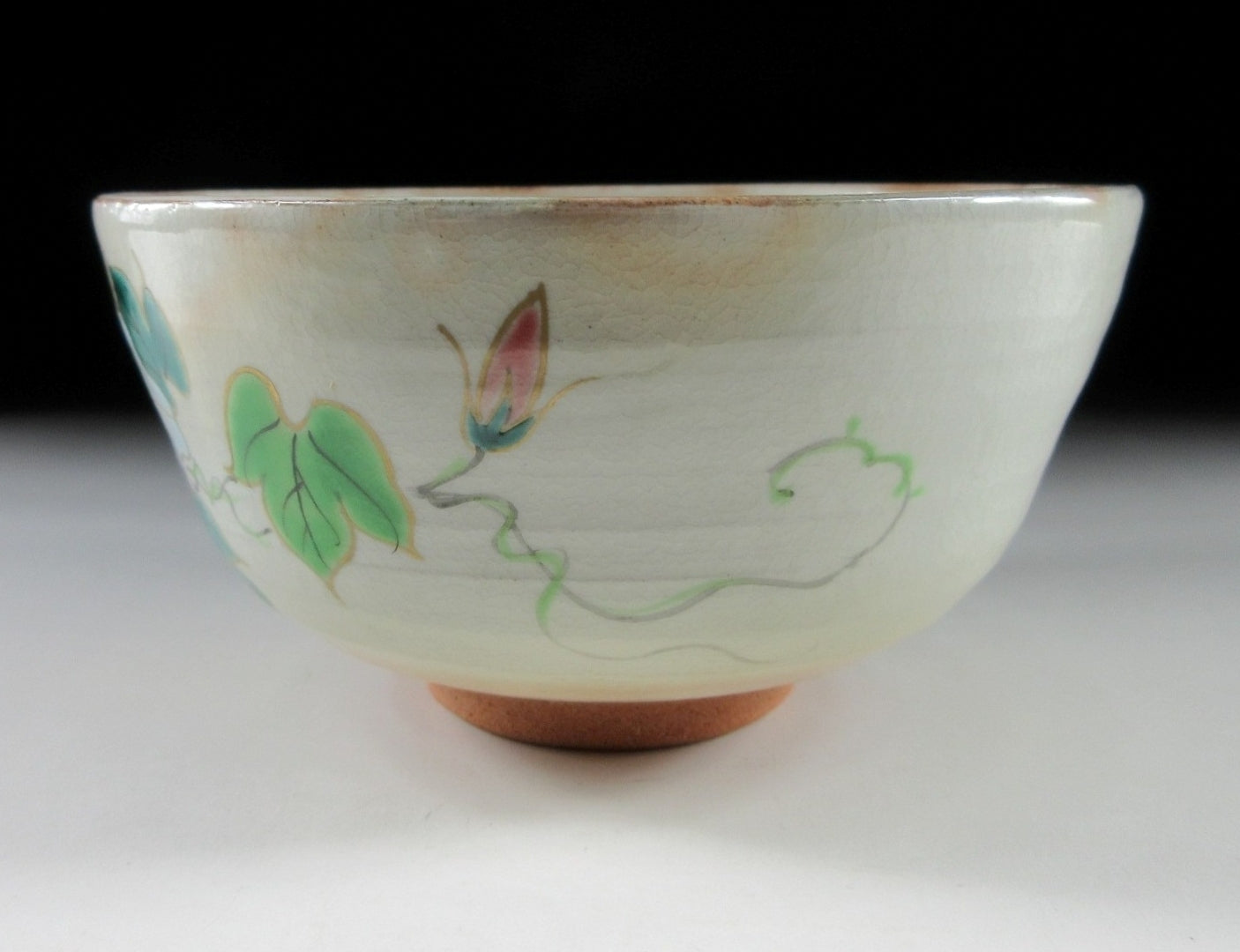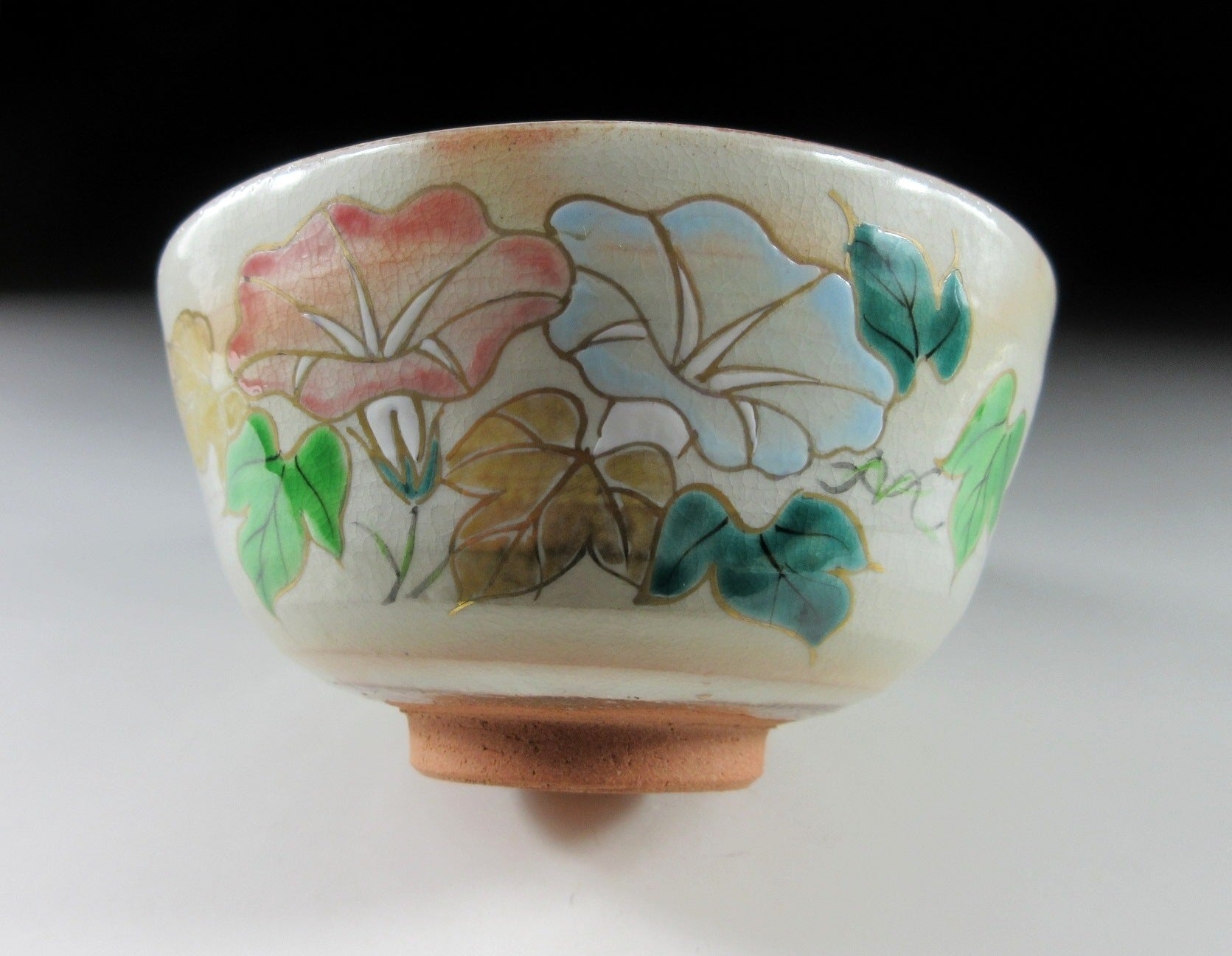 This listing is for a seasonal Kyo-ware chawan made around 20 years ago by Oshikoji Gama. It is wheel-thrown and the front is decorated with hand-painted asagao flowers. Asagao are morning glory flowers and the Japanese name means ‘beauty in the morning’. Asagao were originally brought from China as medicinal herbs, however towards the end of the Edo period they became popular as decorative plants and have come to symbolise summer. This piece is the flat hira type used during the summer season. Hira chawan are shallow bowls with low sides designed to cool tea down faster. The stamp of the kiln can be found on the bottom, and it comes with its original wooden storage box. It also comes with a Japanese language profile paper, as well as an outer paper box to protect the tomobako.