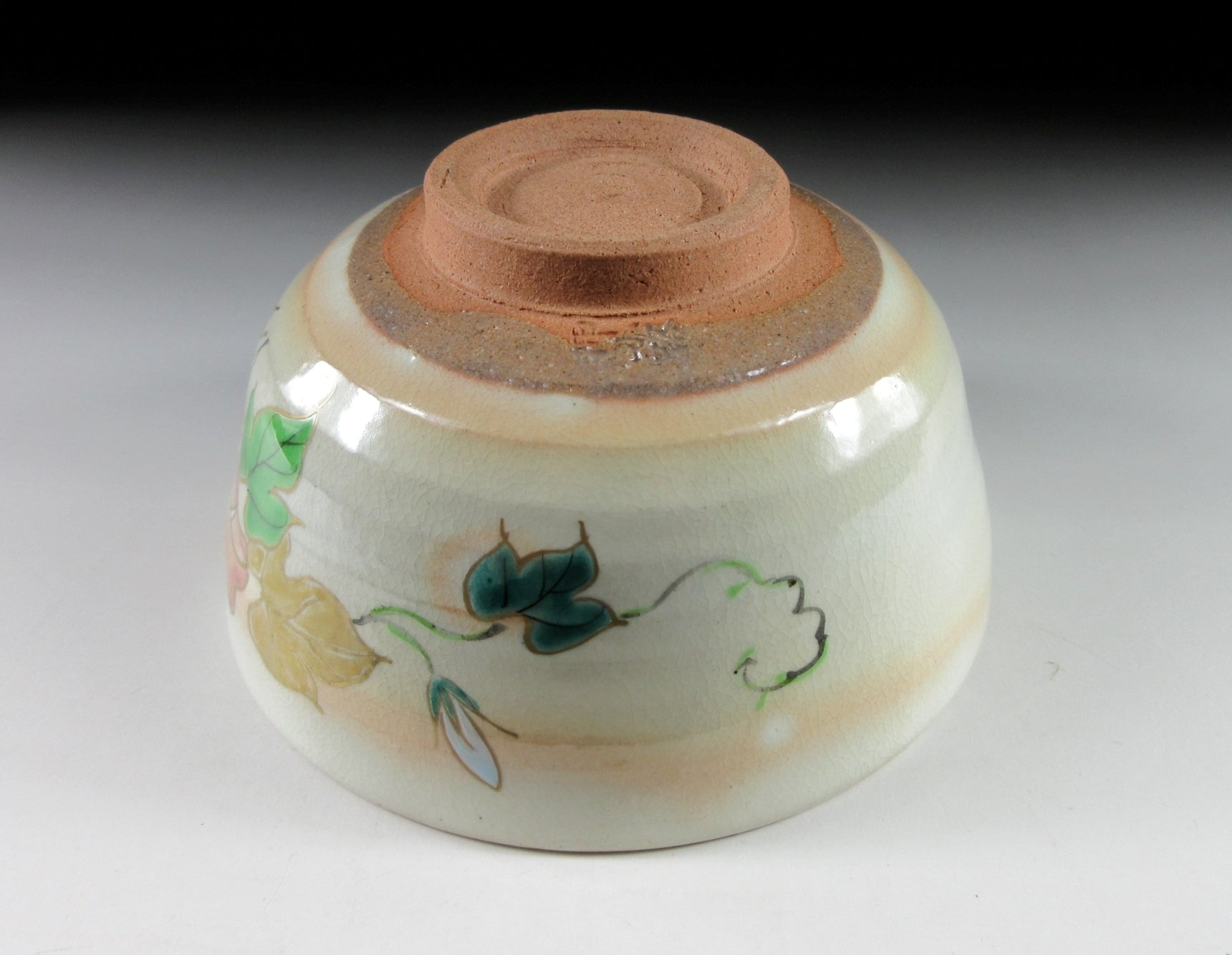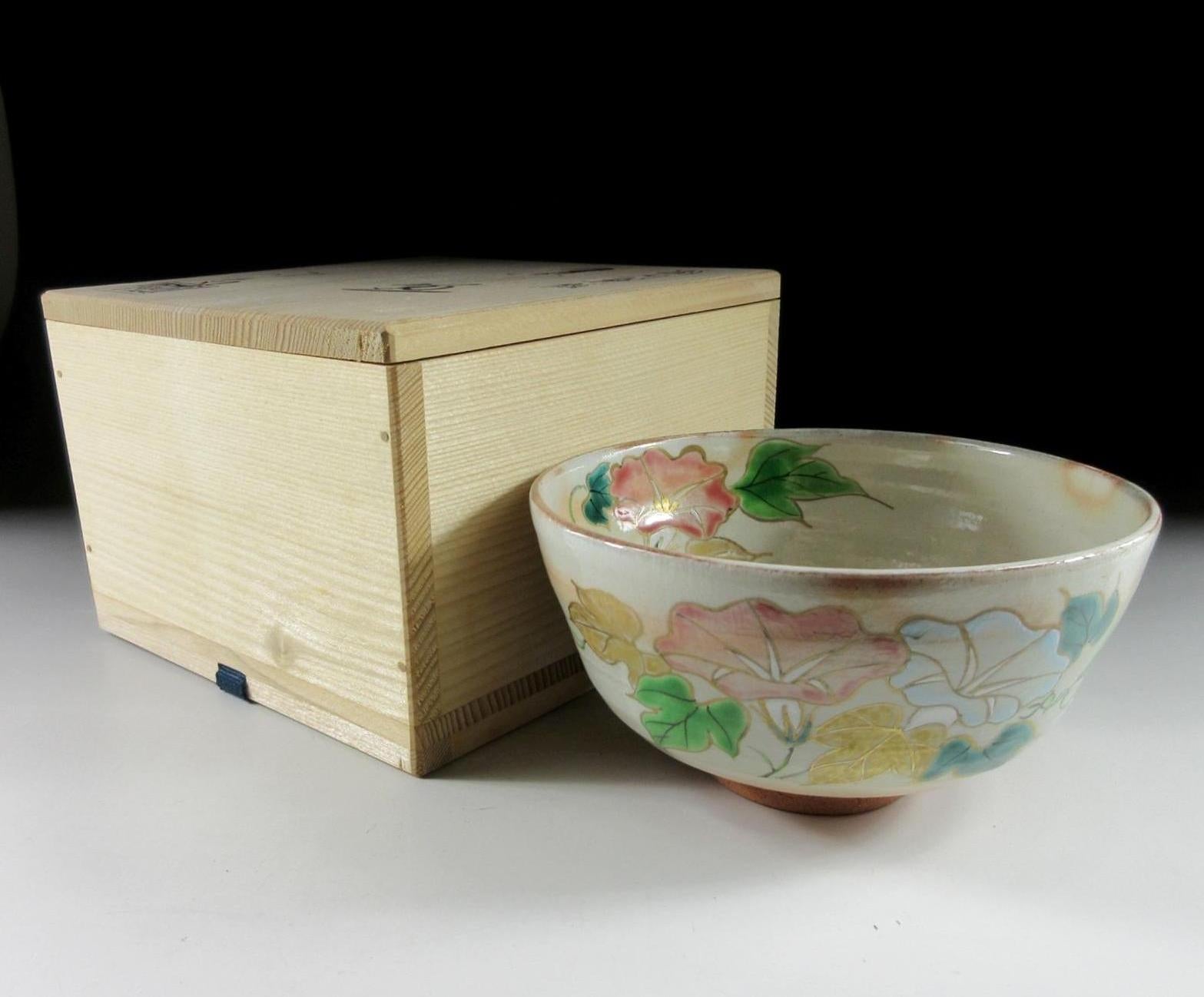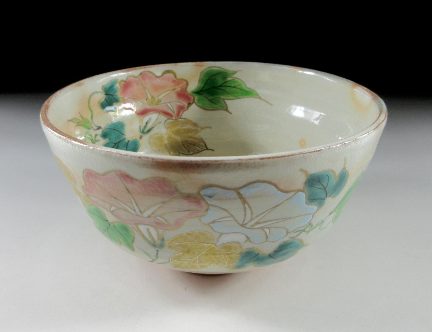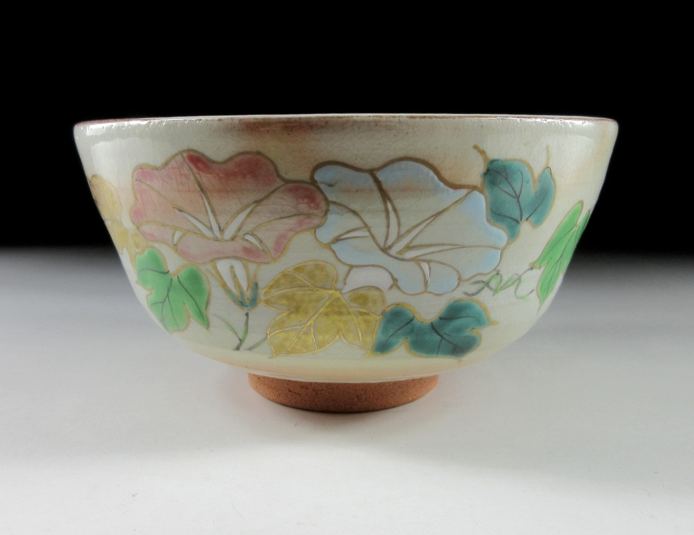 This listing is for a seasonal Kyo-ware chawan made around 20 years ago by Oshikoji Gama. It is wheel-thrown and the front is decorated with hand-painted asagao flowers. Asagao are morning glory flowers and the Japanese name means ‘beauty in the morning’. Asagao were originally brought from China as medicinal herbs, however towards the end of the Edo period they became popular as decorative plants and have come to symbolise summer. This piece is the flat hira type used during the summer season. Hira chawan are shallow bowls with low sides designed to cool tea down faster. The stamp of the kiln can be found on the bottom, and it comes with its original wooden storage box. It also comes with a Japanese language profile paper, as well as an outer paper box to protect the tomobako.