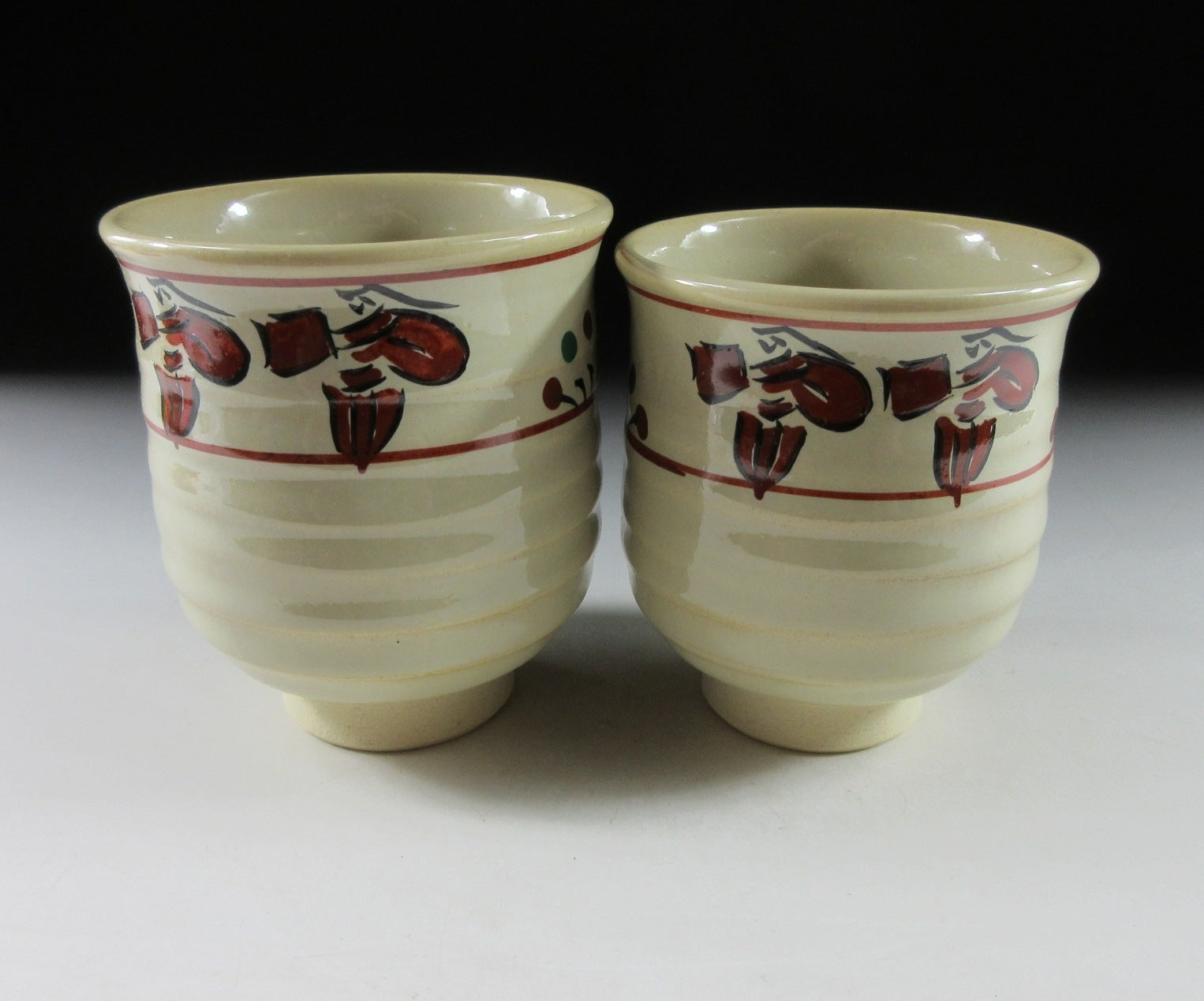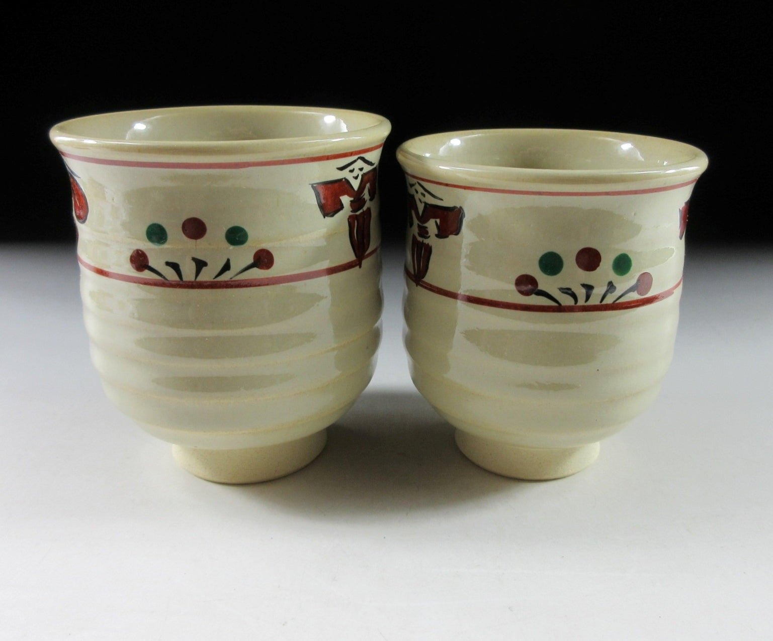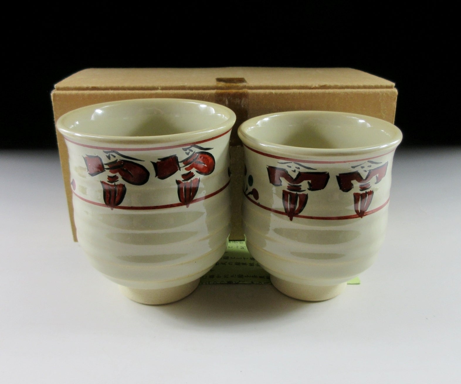 This listing is for a pair of Akahada-ware yunomi made around 20 years ago by noted potter, Oshio Gyokusen. They are wheel-thrown and decorated with a hand-painted Nara-e scene over a transparent white glazed base. There is an indent just under the rim to enable easy handling, and they are very suitable for daily use. Also these cups are what we call meoto style, meaning they are two different sizes and also referred to as husband and wife cups. The Akahada mark can be found on the bottom, and they come with a paper storage box. They also come with a Japanese language profile about the potter.
