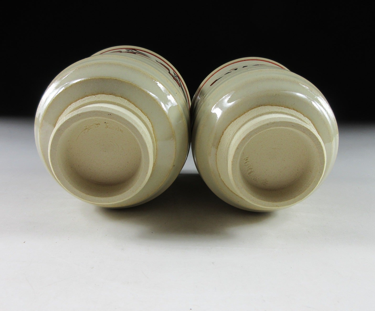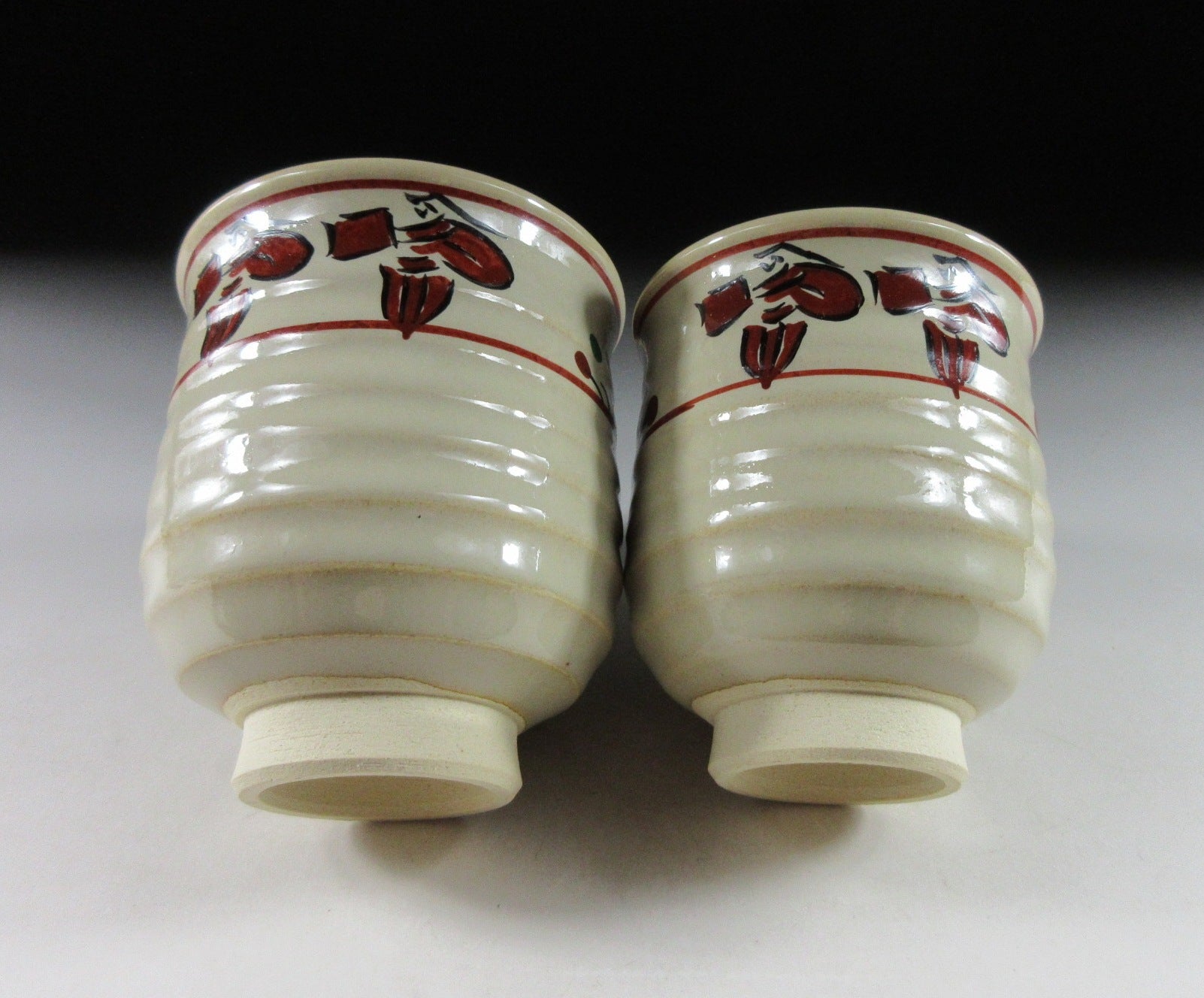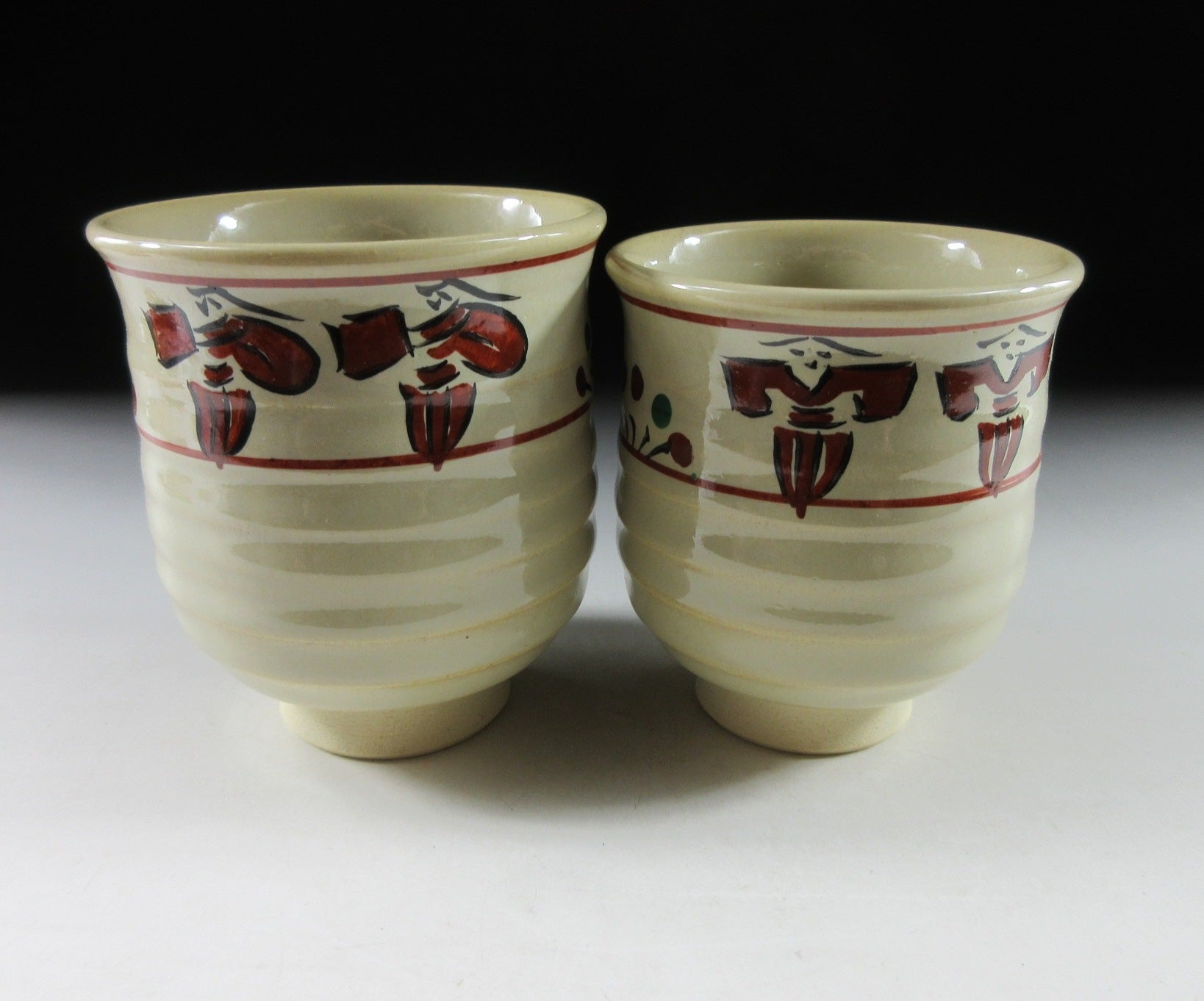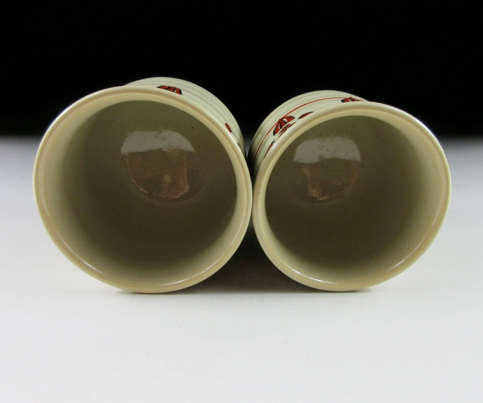 This listing is for a pair of Akahada-ware yunomi made around 20 years ago by noted potter, Oshio Gyokusen. They are wheel-thrown and decorated with a hand-painted Nara-e scene over a transparent white glazed base. There is an indent just under the rim to enable easy handling, and they are very suitable for daily use. Also these cups are what we call meoto style, meaning they are two different sizes and also referred to as husband and wife cups. The Akahada mark can be found on the bottom, and they come with a paper storage box. They also come with a Japanese language profile about the potter.