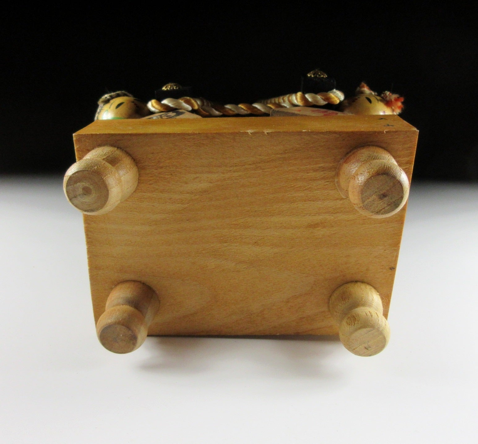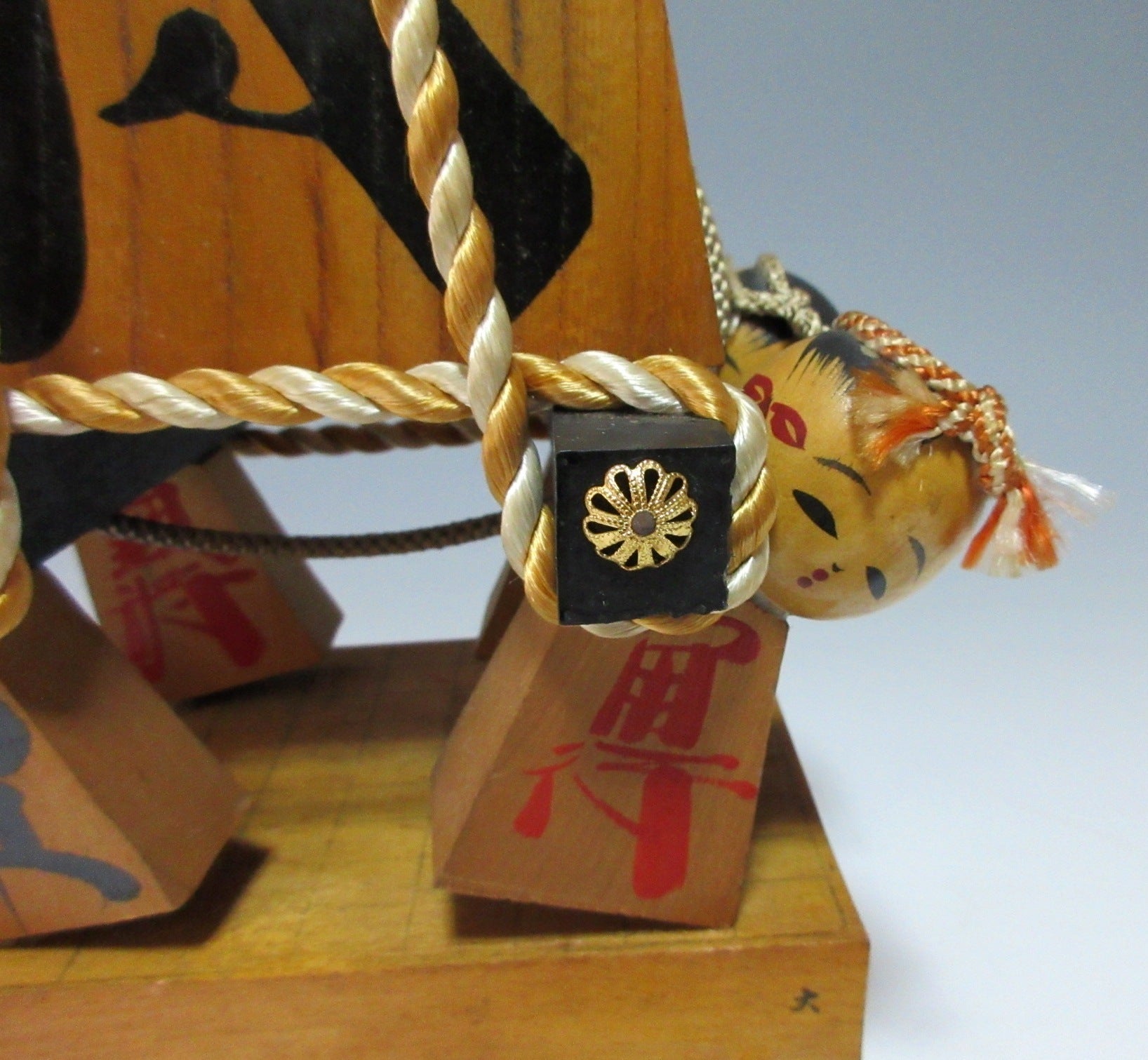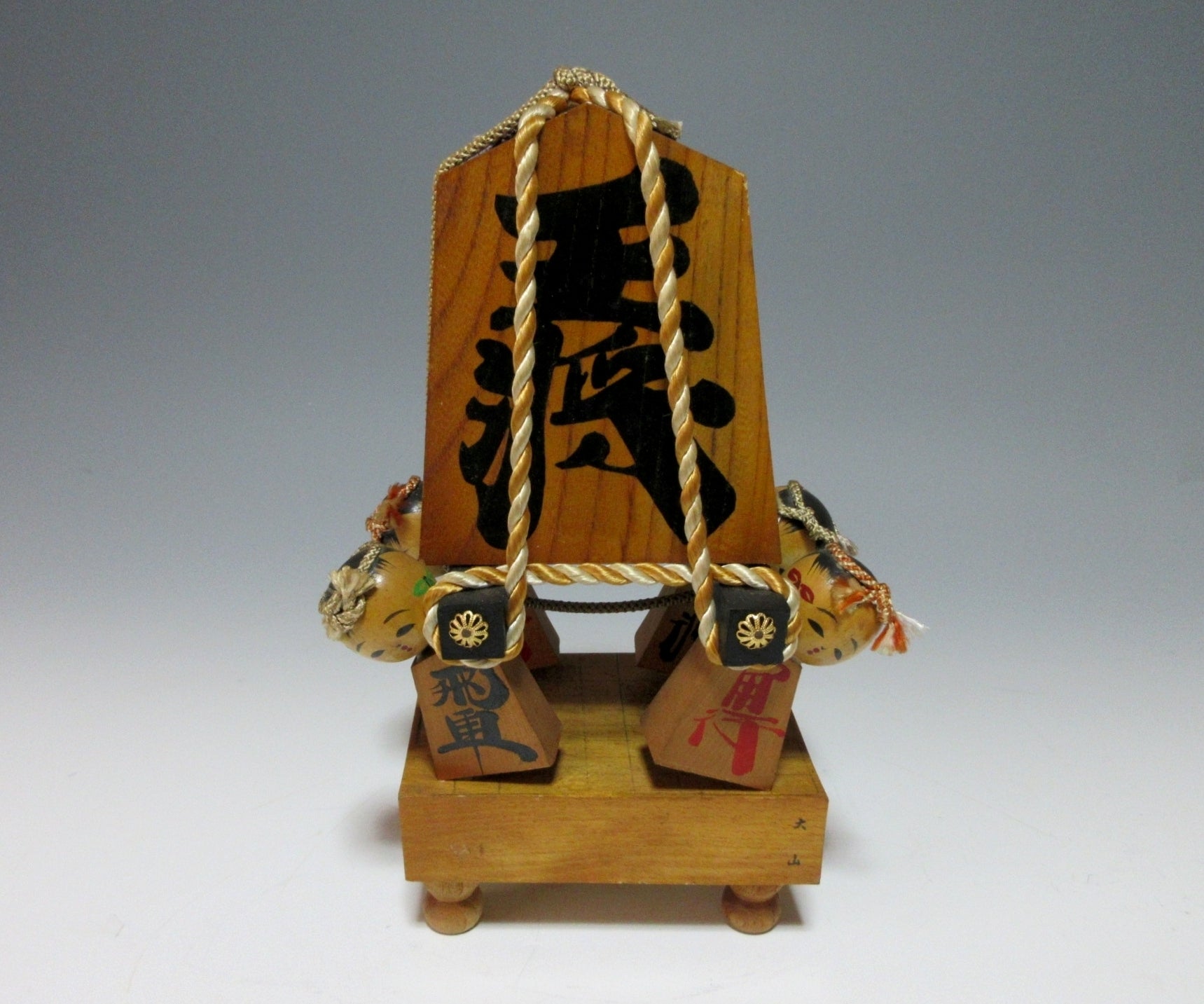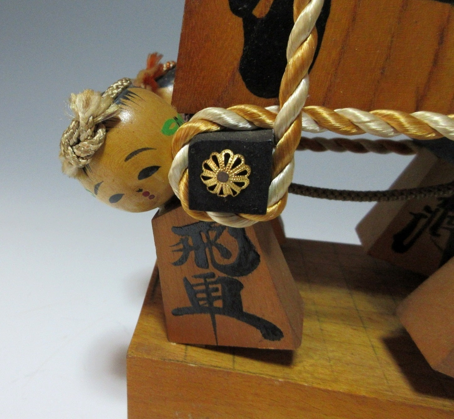This listing is for an ‘osho’ kokeshi okimono made around 30-40 years ago. It is made of wood and features four small kokeshi carrying a shogi piece attached to a mikoshi. Shogi is a board game similar to chess, and a mikoshi is a portable float carried during festivals. The writing on the shogi piece says ‘osho’,which means king piece. Osho okimono are generally made from zelkova and or sen wood, and they are hand carved and finished with clear lacquer. Tendo City in Yamagata Prefecture is Japan's largest producer of shogi pieces and shogi okimono. The making of shogi pieces began in Tendo during the late Edo period when shogi was becoming popular among the common people. At that time, the Tendo Oda domain was suffering from severe financial hardship. The Oda clan encouraged the samurai to rebuild their finances by making pieces, which they had learned from the Yonezawa clan. Tendo shogi pieces were designated as a national traditional craft in 1996. Osho themed okimono are often displayed as lucky charms at house or shop entrances to celebrate housewarming or store openings.