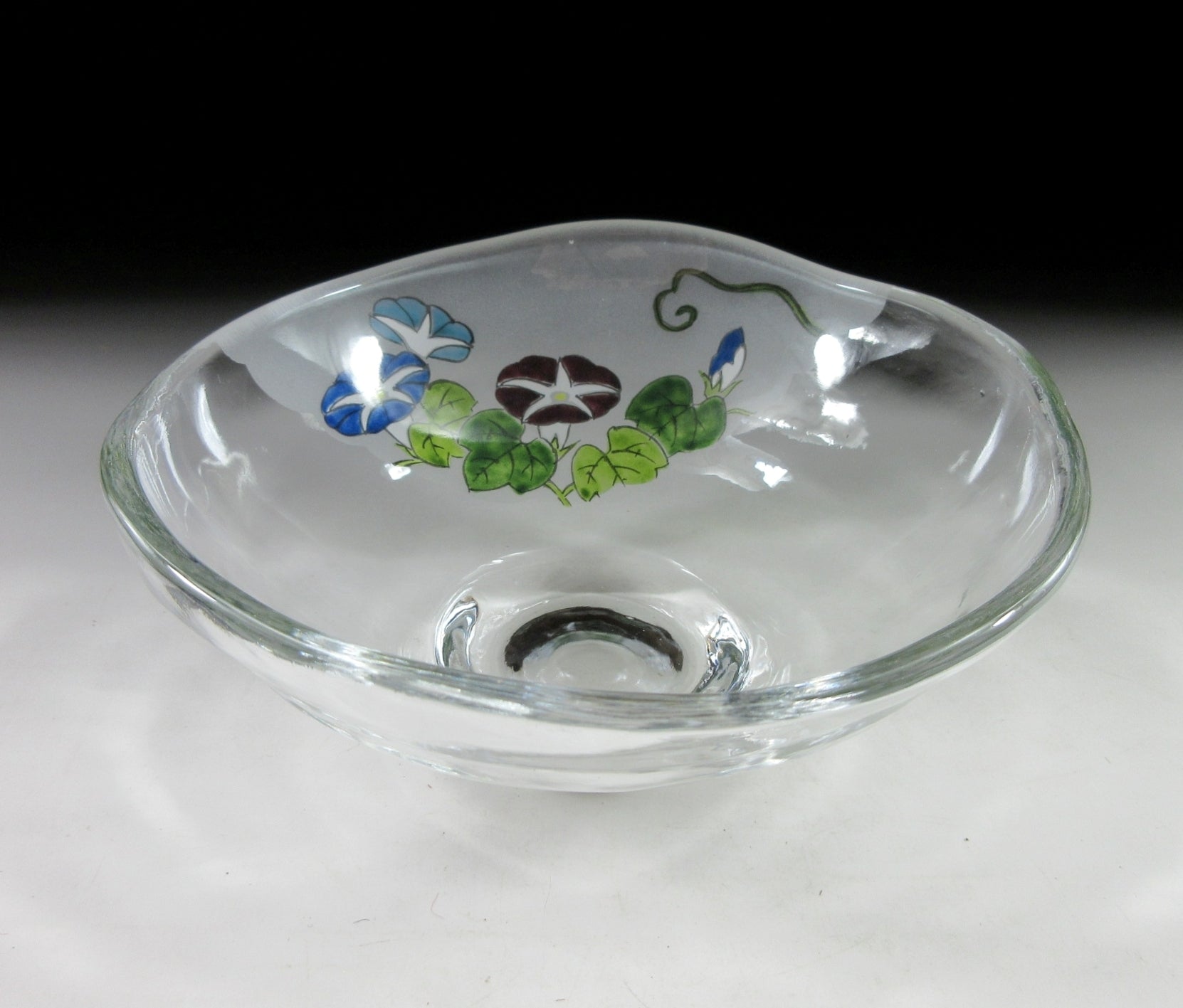 This listing is for a beautiful giyaman glass chawan made around 20 years ago. The chawan was made by Yume-Enogu glass and decorated by distinguished potter, Ozeki Hiroko. This piece is the flat hira type used during the summer season. Hira chawan are shallow bowls with low sides designed to cool tea down faster. This beautiful hand-painted piece depicts morning glory flowers, a symbol of summer in Japan. Asagao have a romantic image and are often depicted in poems, scrolls, and textiles. It’s not uncommon to see young women wearing morning glory themed yukata during festivals, or carrying fans decorated with colourful asagao flowers. It comes with its original paper storage box, as well as a Japanese language profile paper.