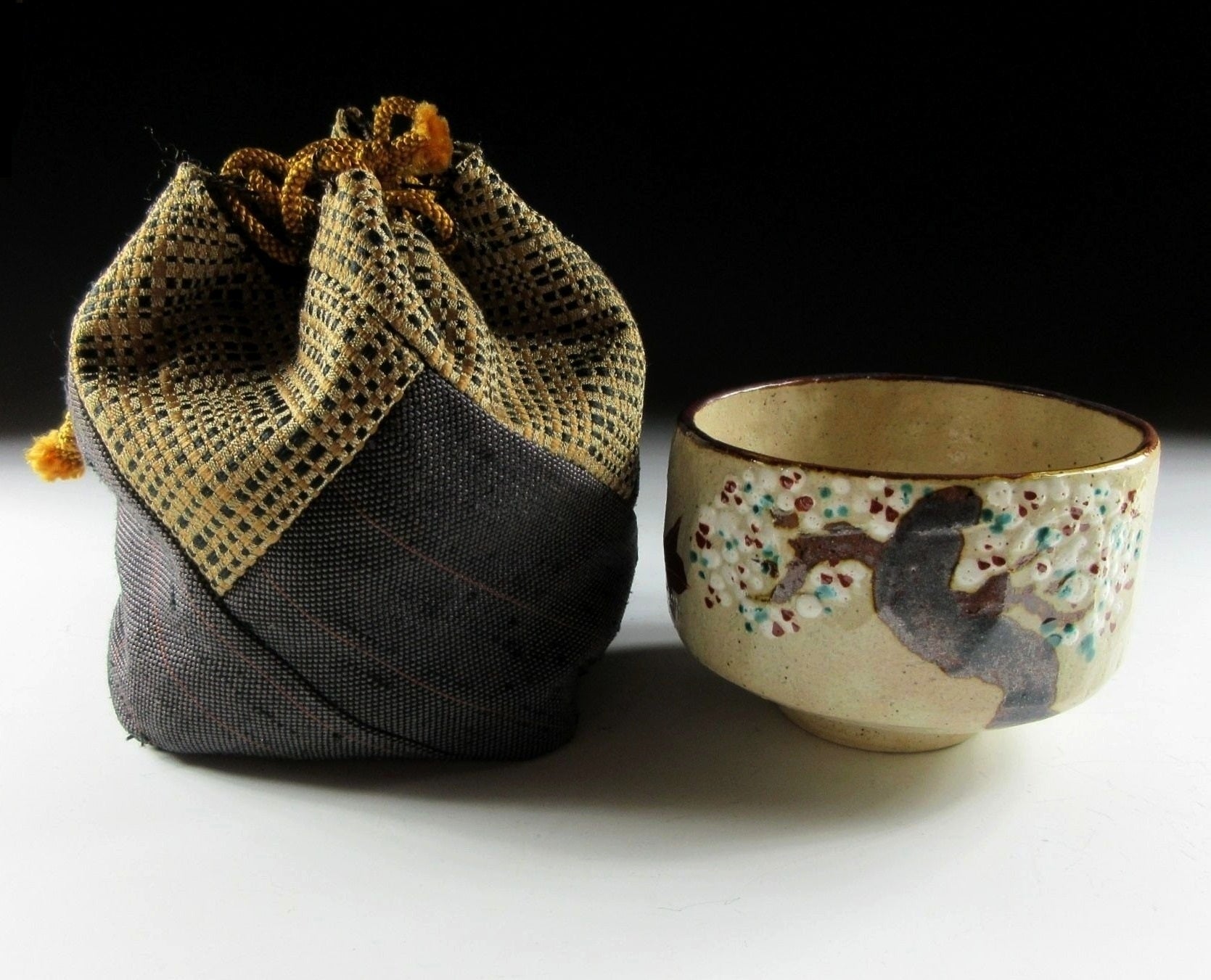 This listing is for a vintage Inuyama-ware chawan with shifuku made around 30-40 years ago by Ozeki Sakujuro Toen. It is wheel-thrown and decorated with red and green maple leaves and stylised cherry blossoms. The combination of leaves and sakura reflect the changing seasons and is a traditional motif used by Inuyama potters. This piece also comes with a shifuku drawstring bag thus allowing it to be used outdoors. The stamp of the kiln can be found on the bottom and it comes with its original wooden storage box. It also comes with a Japanese language profile paper about the kiln.