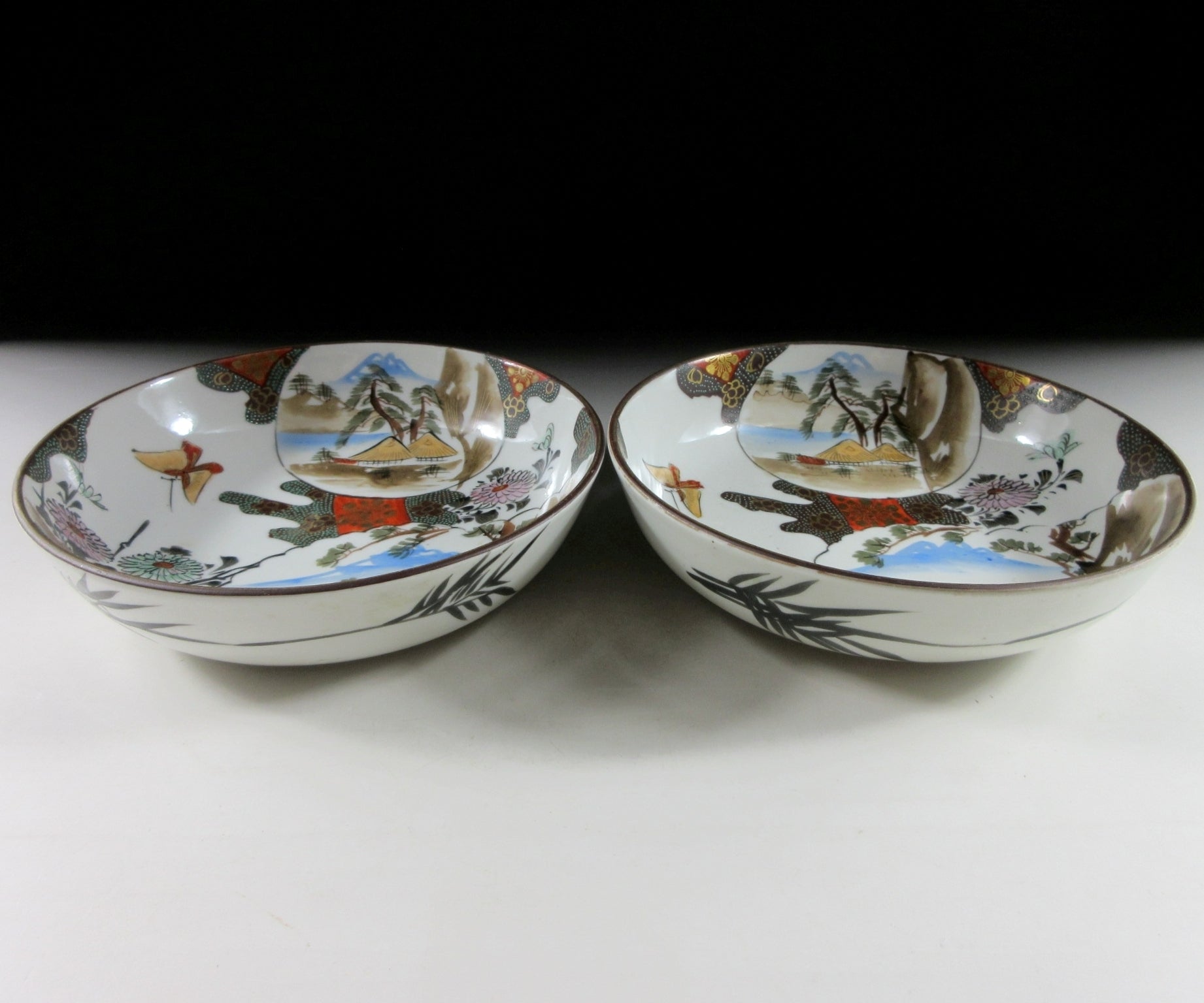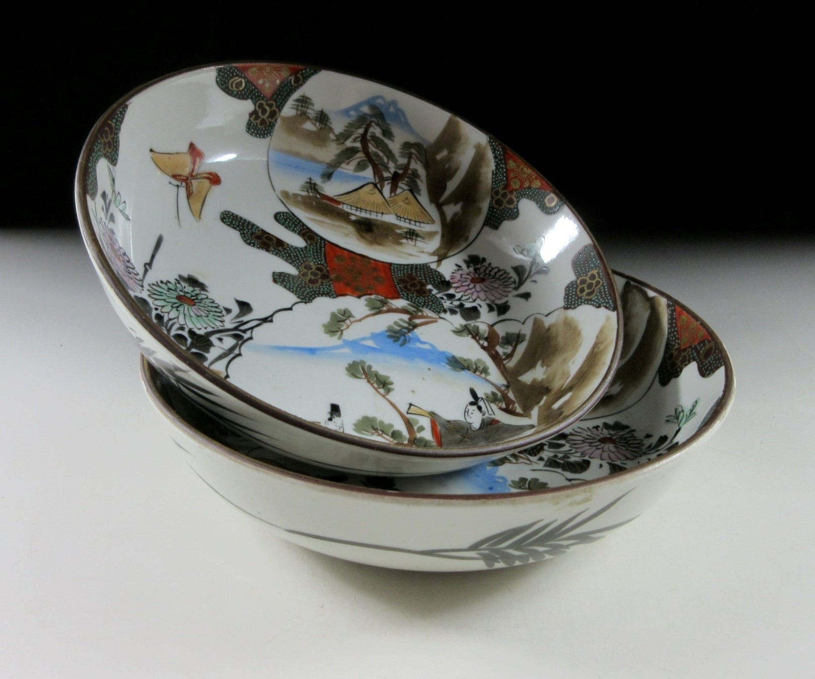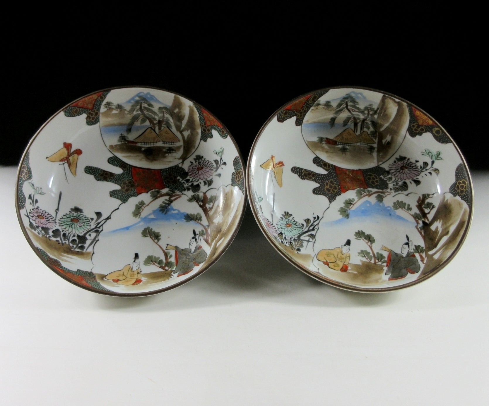 This listing is for a pair of antique Kutani-ware bowls made around 120 years ago. Each piece is hand-painted and decorated with aristocrats, flowers, butterflies, and landscape scenery. Some of the enamel is raised so it has a slight texture when you run your fingers over the surface. Both bowls are still very usable but they would also make lovely display items. The Kutani mark can be found on the back of each piece.