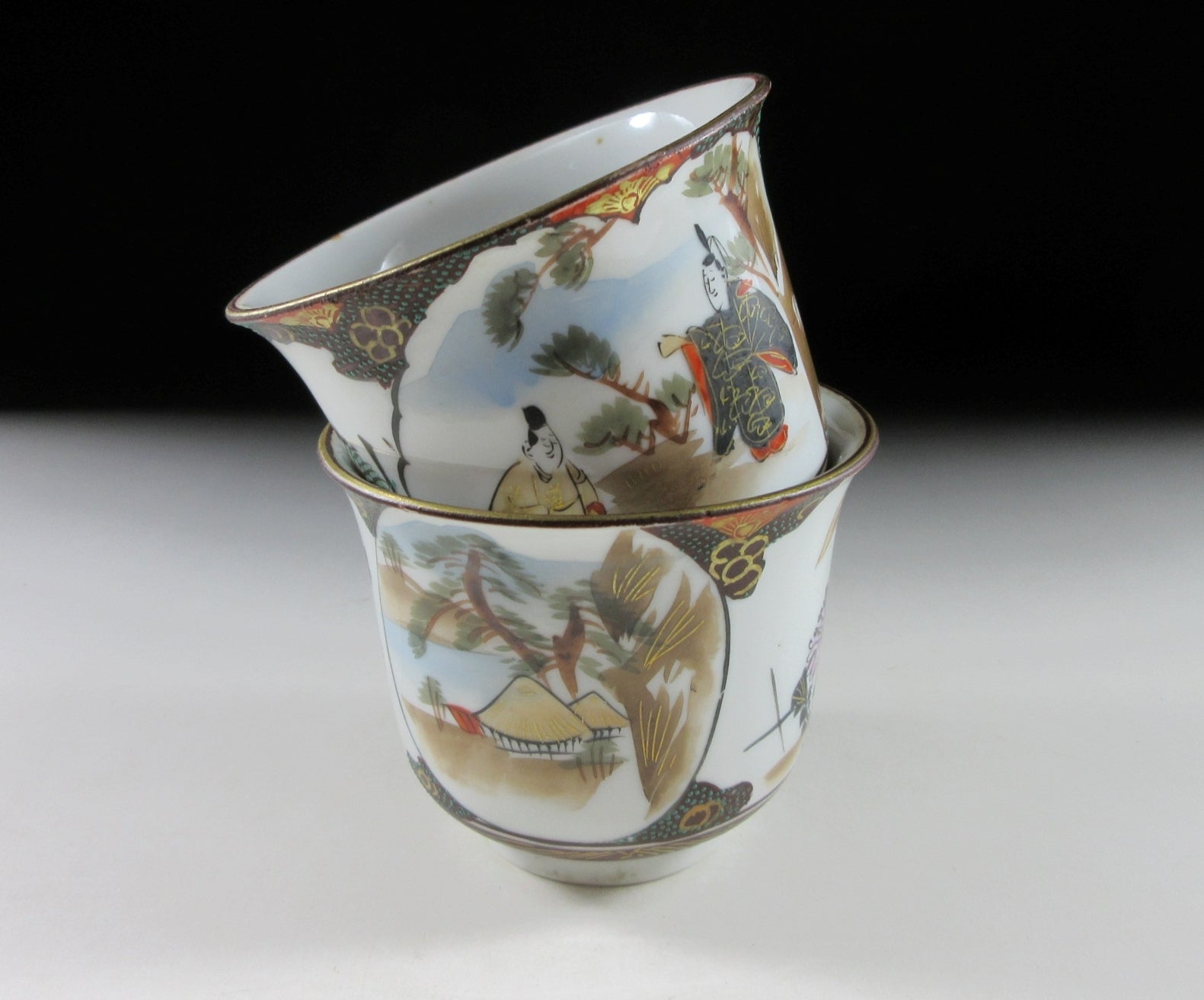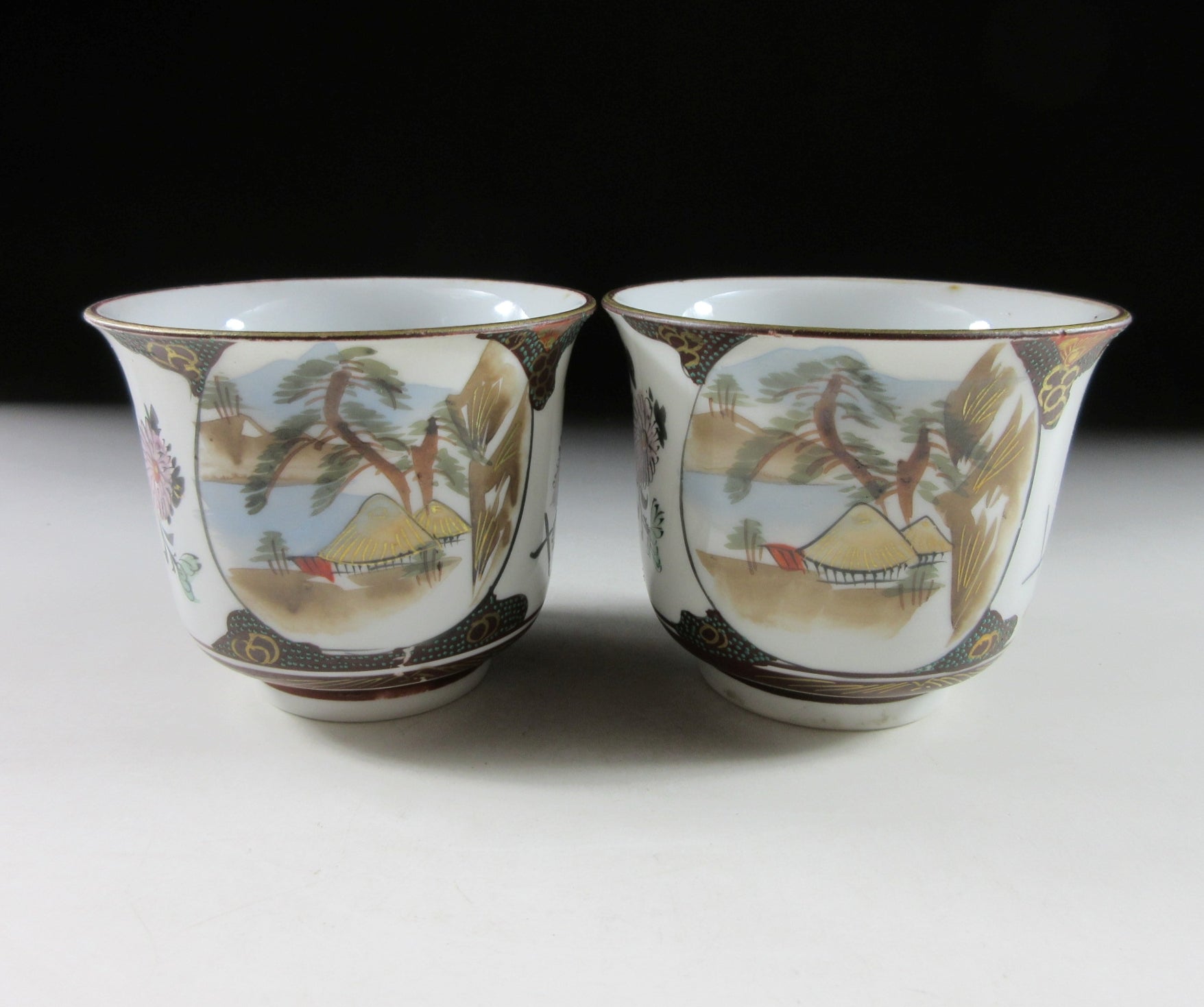 This listing is for a pair of antique Kutani-ware soba cups made around 120 years ago. Soba cups are used when eating soba noodles. The cups contain sauce and the noodles are dipped into the cup before eating. Each piece is hand-painted and decorated with aristocrats, flowers, butterflies, and landscape scenery. Some of the enamel is raised so it has a slight texture when you run your fingers over the surface. They can be used for their intended purpose however soba cups do make excellent tea light and candle holders. The Kutani mark can be found on the bottom of each piece.