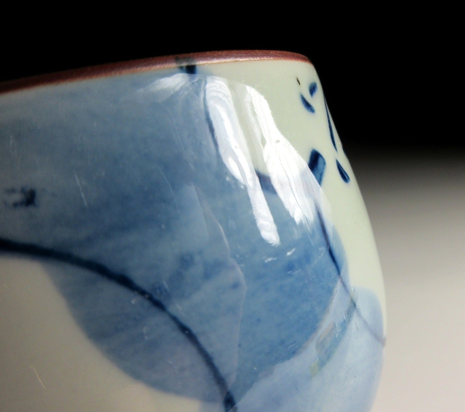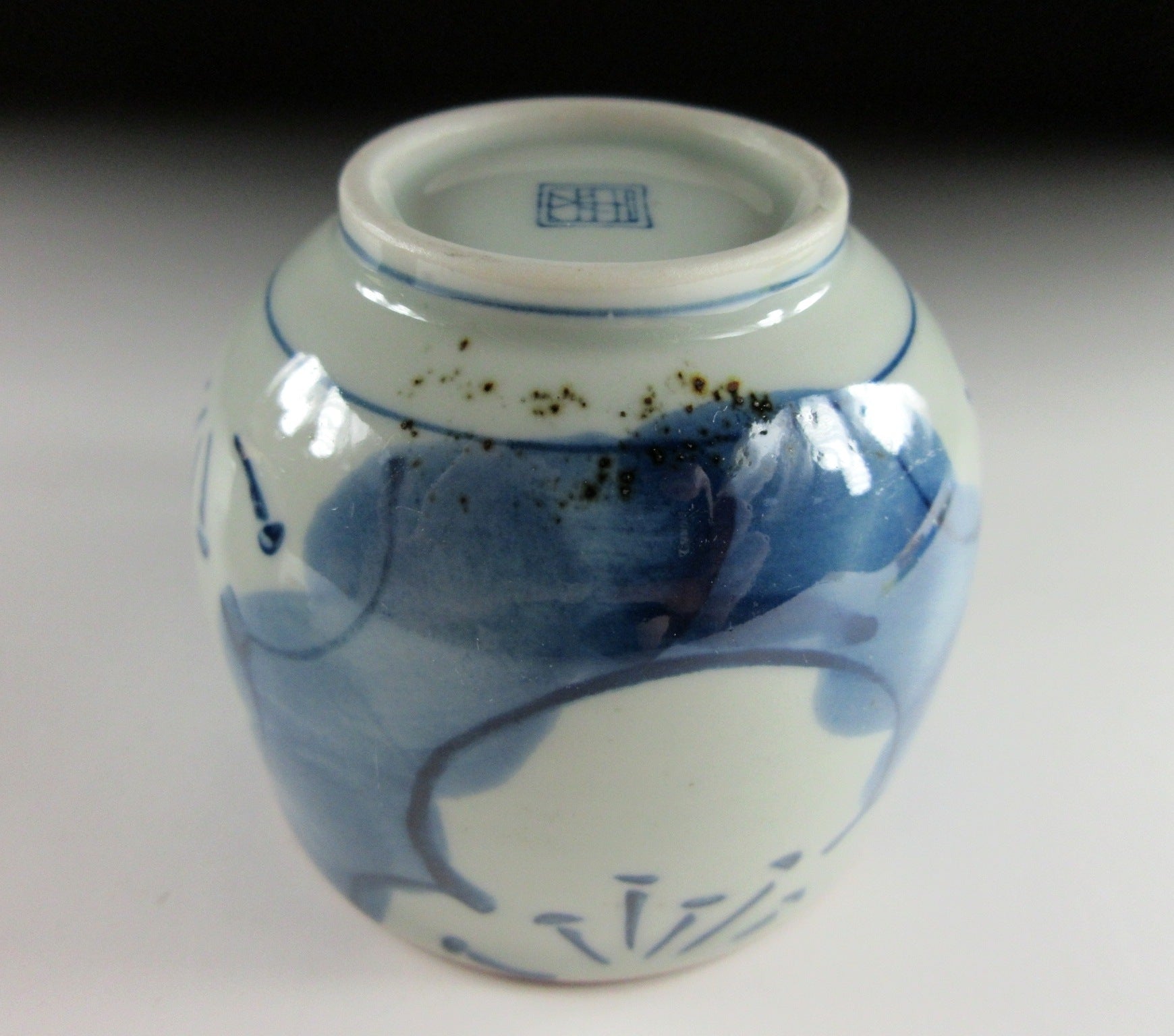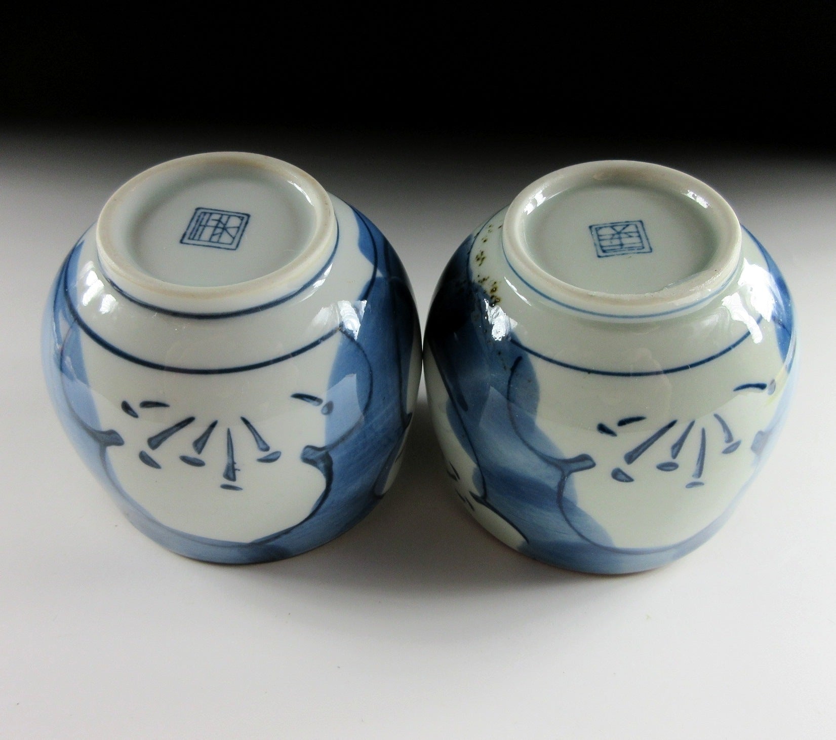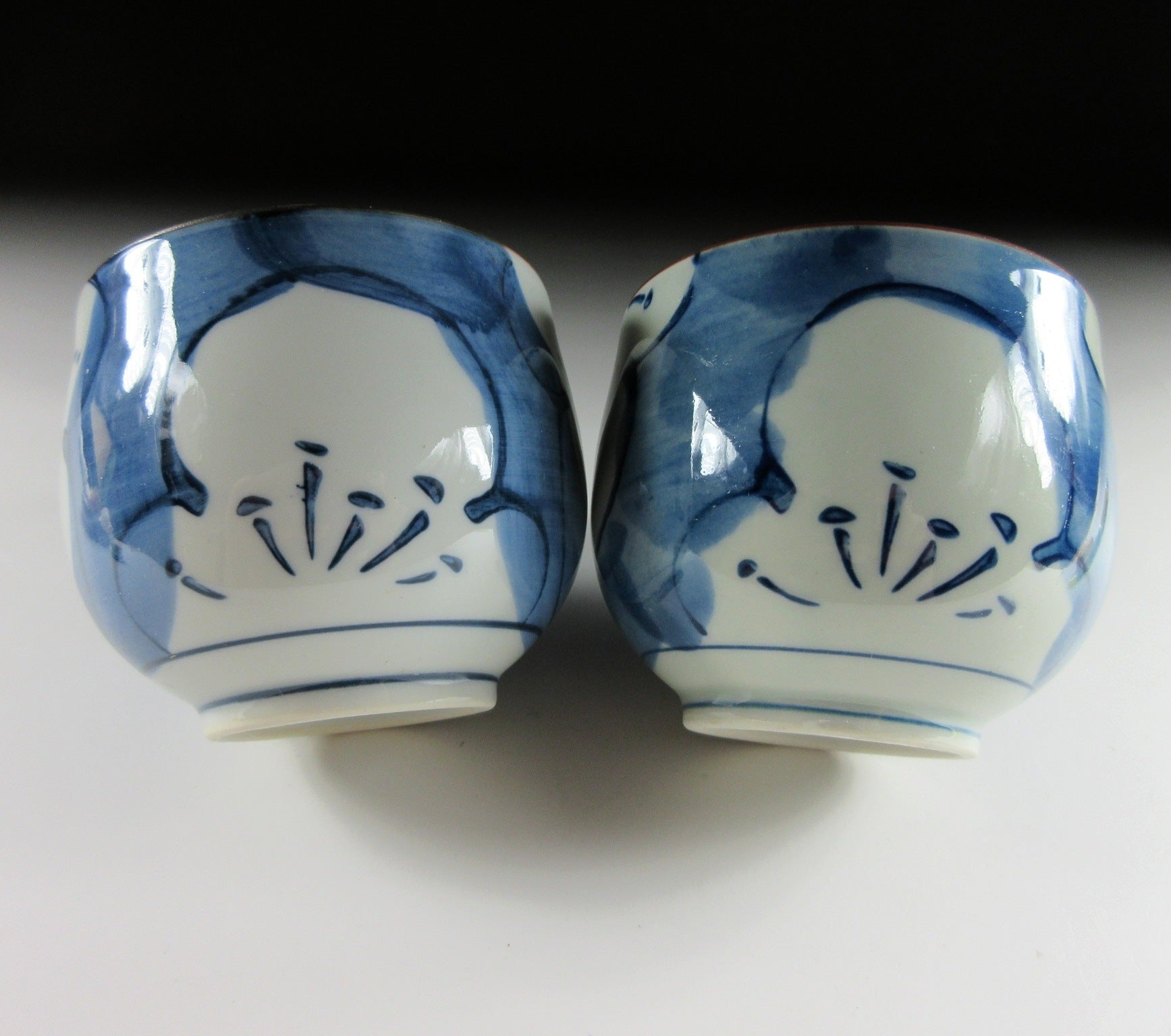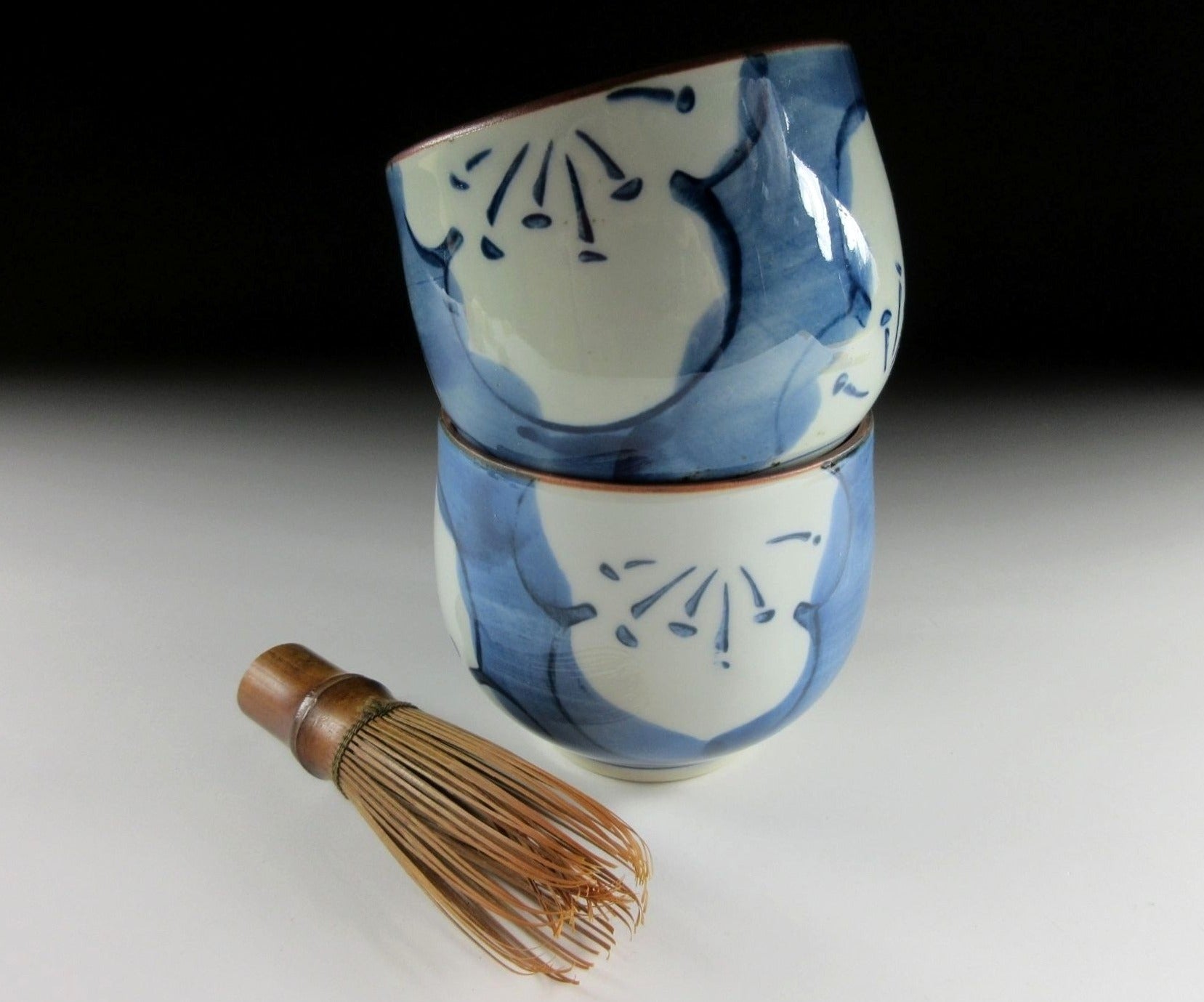 This listing is for a pair of small Arita-ware tea cups made around 20 years ago. They are made of porcelain and each piece is decorated with hand-painted depictions of ume blossoms using cobalt underglaze. The rims are trimmed with brown glaze and the stamp of the kiln can be found on the bottom of each cup. *PLEASE NOTE THAT THE CHASEN TEA WHISK IS NOT INCLUDED.