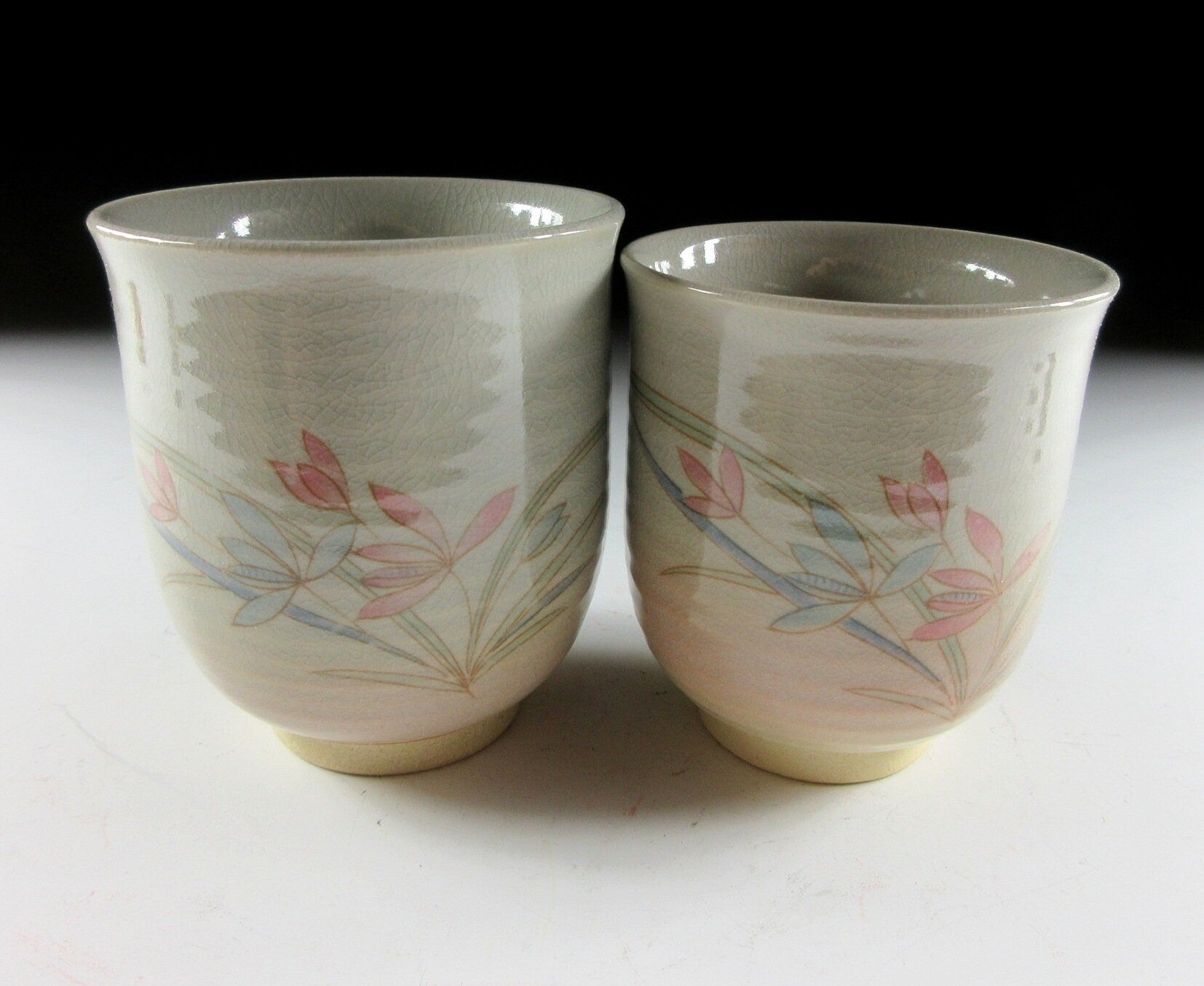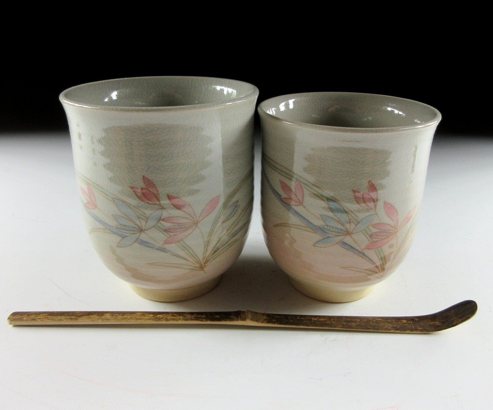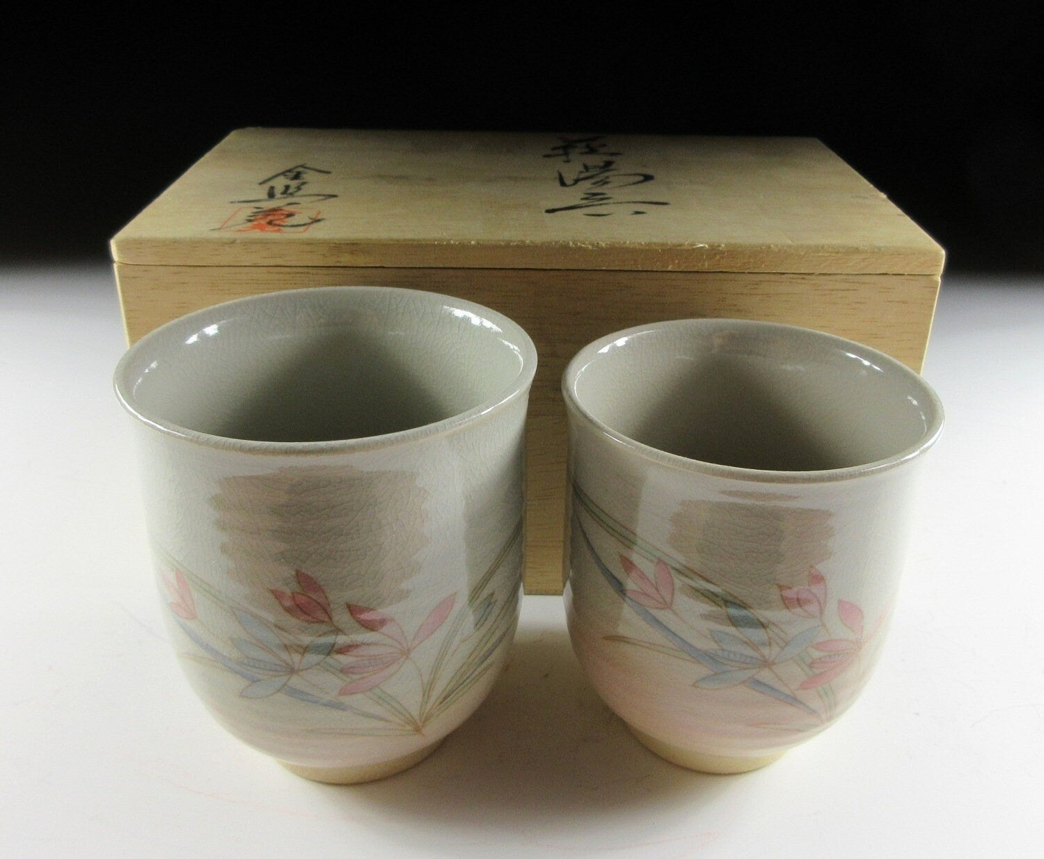 This listing is for a pair of Hagi-ware yunomi tea cups made around 20 years ago. They are wheel-thrown and the front of each cup is decorated with pale red and blue flowers. Also these cups are what we call meoto style, meaning they are two different sizes and often referred to as a husband and wife pair. The cups are unsigned , however they come with a signed wooden storage box. **PLEASE NOTE THAT THE CHASHAKU TEA SCOOP IS NOT INCLUDED.