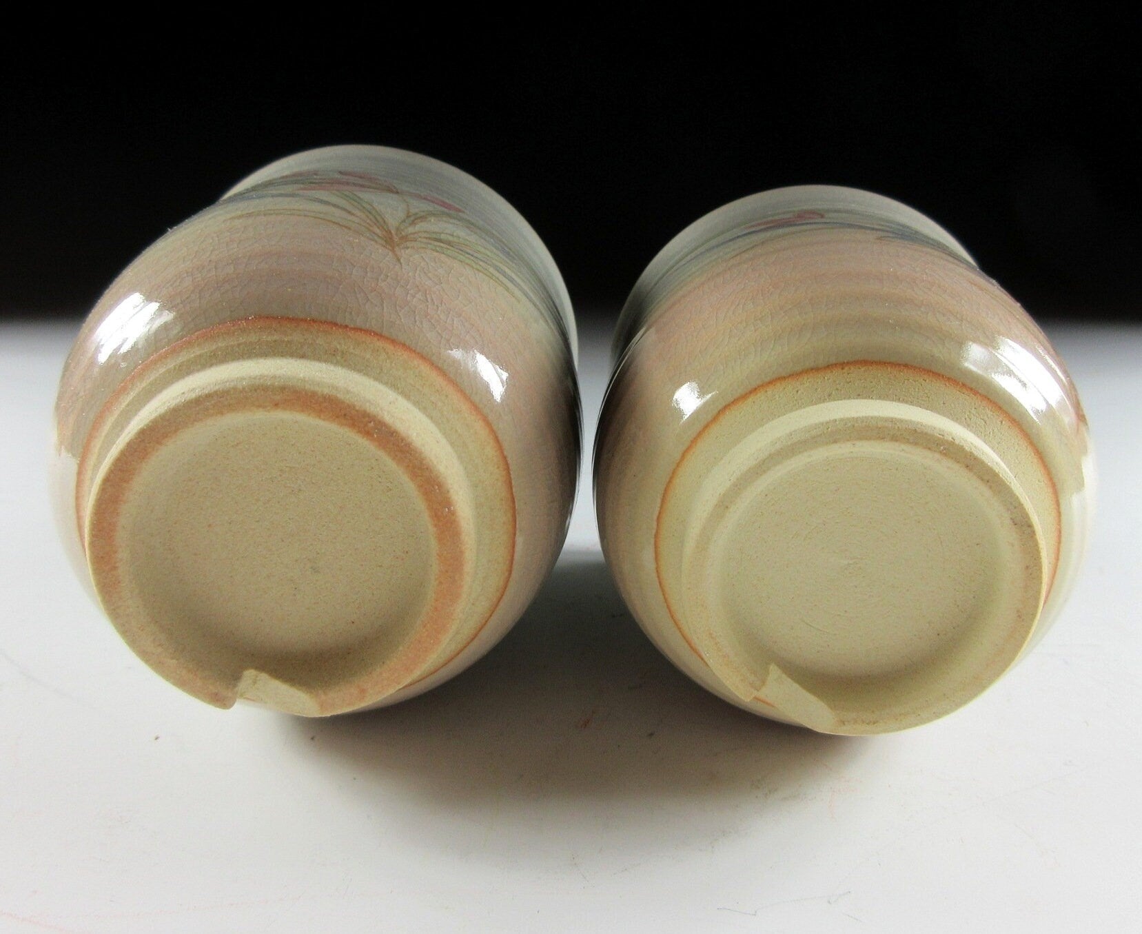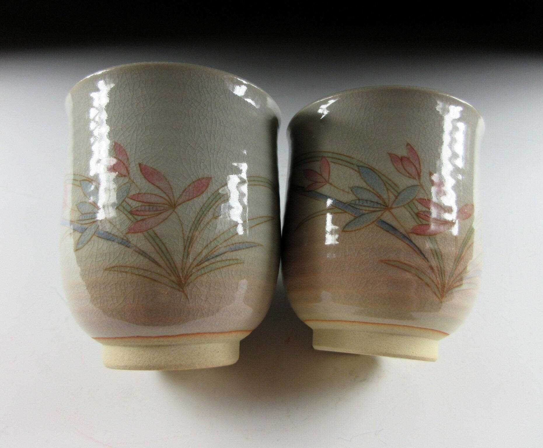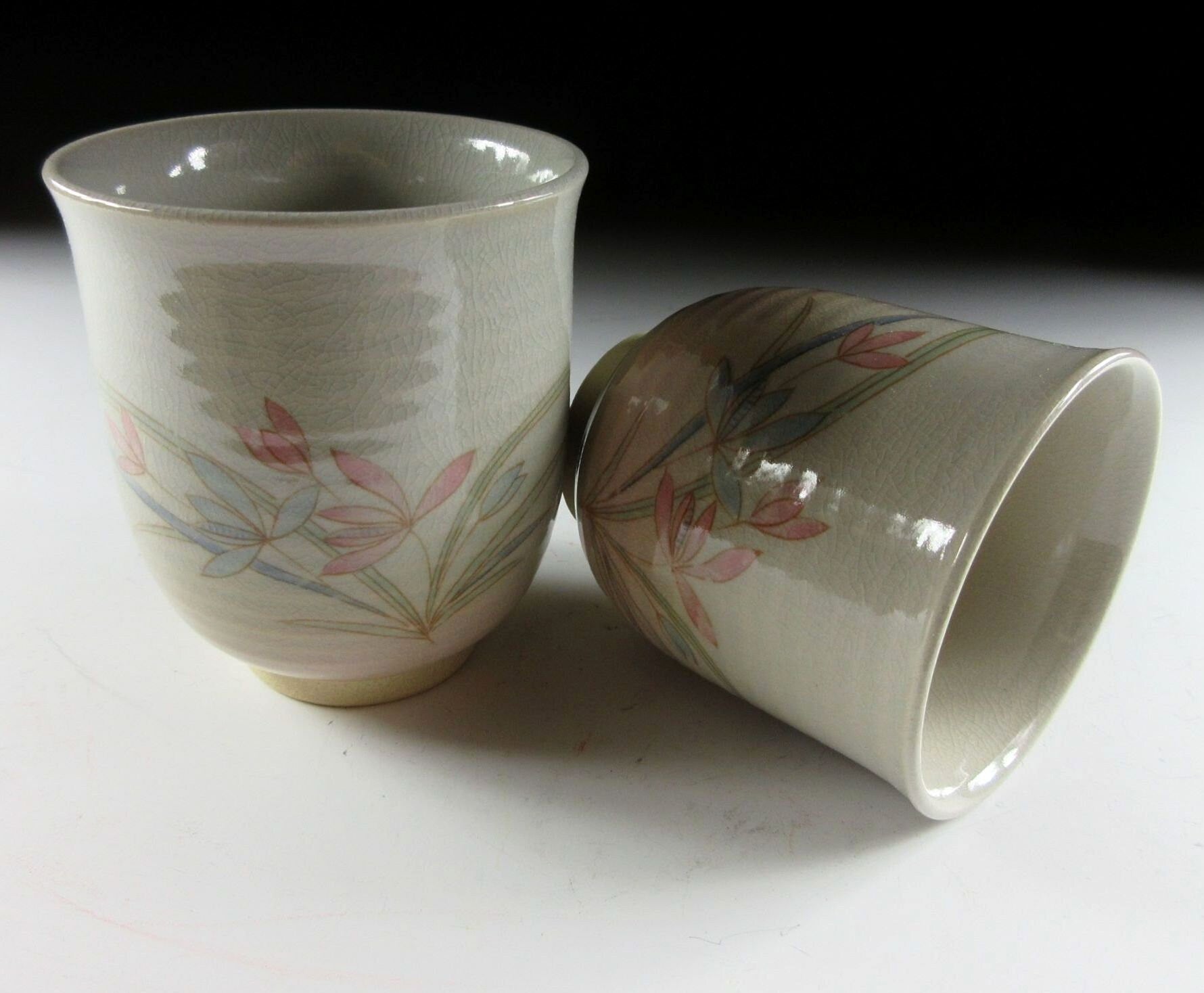 This listing is for a pair of Hagi-ware yunomi tea cups made around 20 years ago. They are wheel-thrown and the front of each cup is decorated with pale red and blue flowers. Also these cups are what we call meoto style, meaning they are two different sizes and often referred to as a husband and wife pair. The cups are unsigned , however they come with a signed wooden storage box. **PLEASE NOTE THAT THE CHASHAKU TEA SCOOP IS NOT INCLUDED.