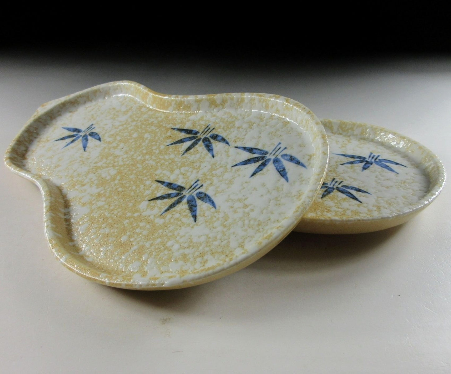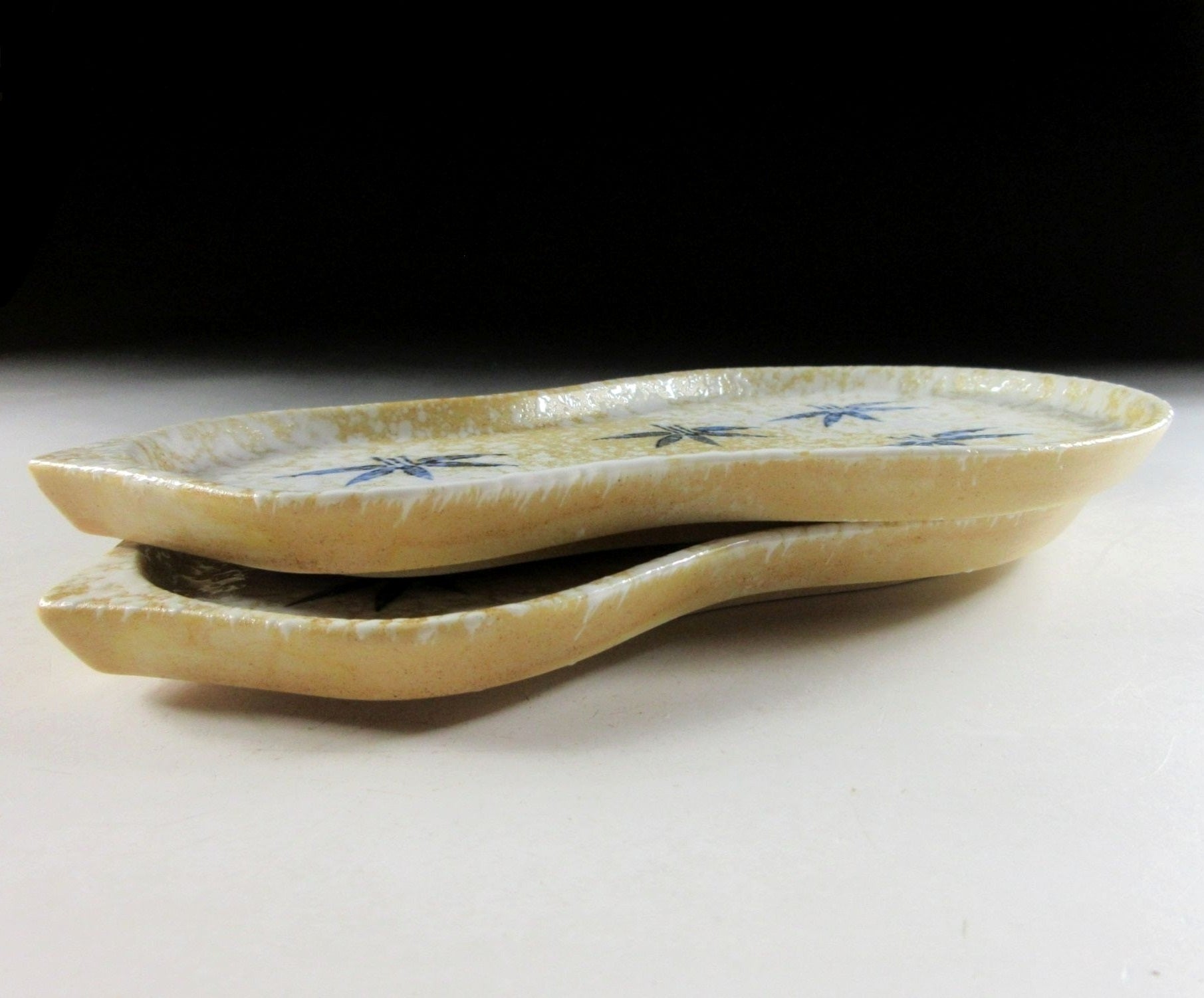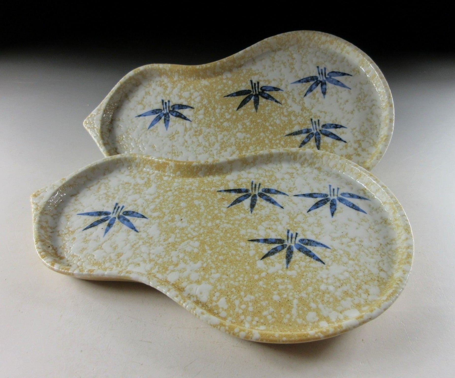 This listing is for a pair of Mino-ware plates made around 20 years ago. Each plate is shaped like a hyotan and decorated with blue bamboo. The gourd, or hyotan as it is known in Japanese, is an auspicious symbol linked to longevity and fertility. They are also thought to symbolize happiness and success, thus making them a popular motif during New Year. Bamboo is also a popular motif because it is one of the three friends of winter. Bamboo, matsu pine and ume are admired in both Japan and China as they do not wither against the cold of winter. All three plants are regarded as auspicious and are believed to symbolise endurance and strength. These plates are ideal for serving sweets and are suitable for daily use.