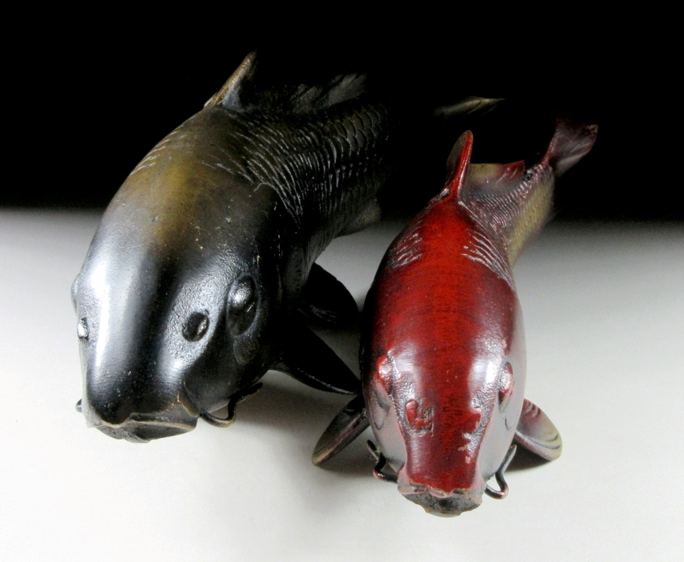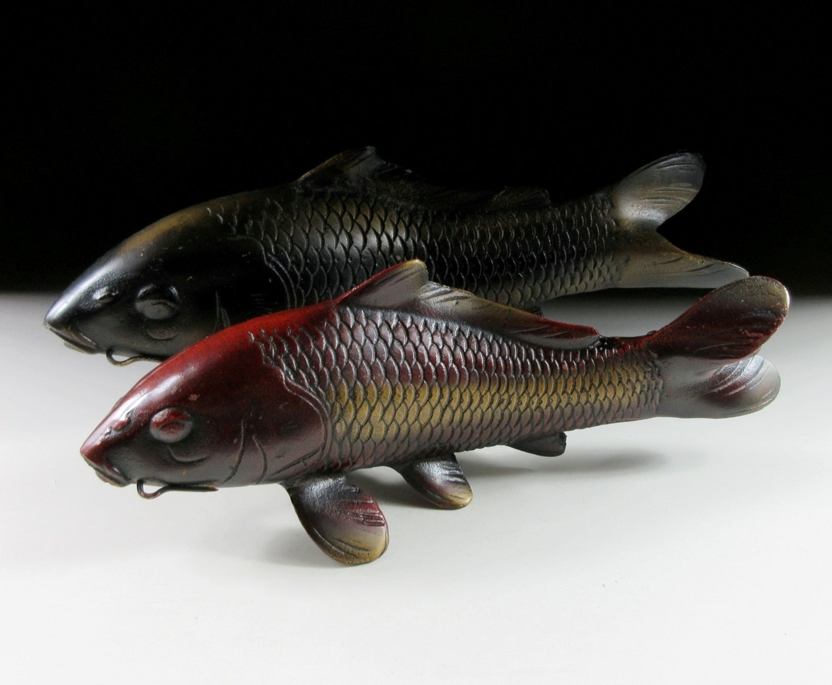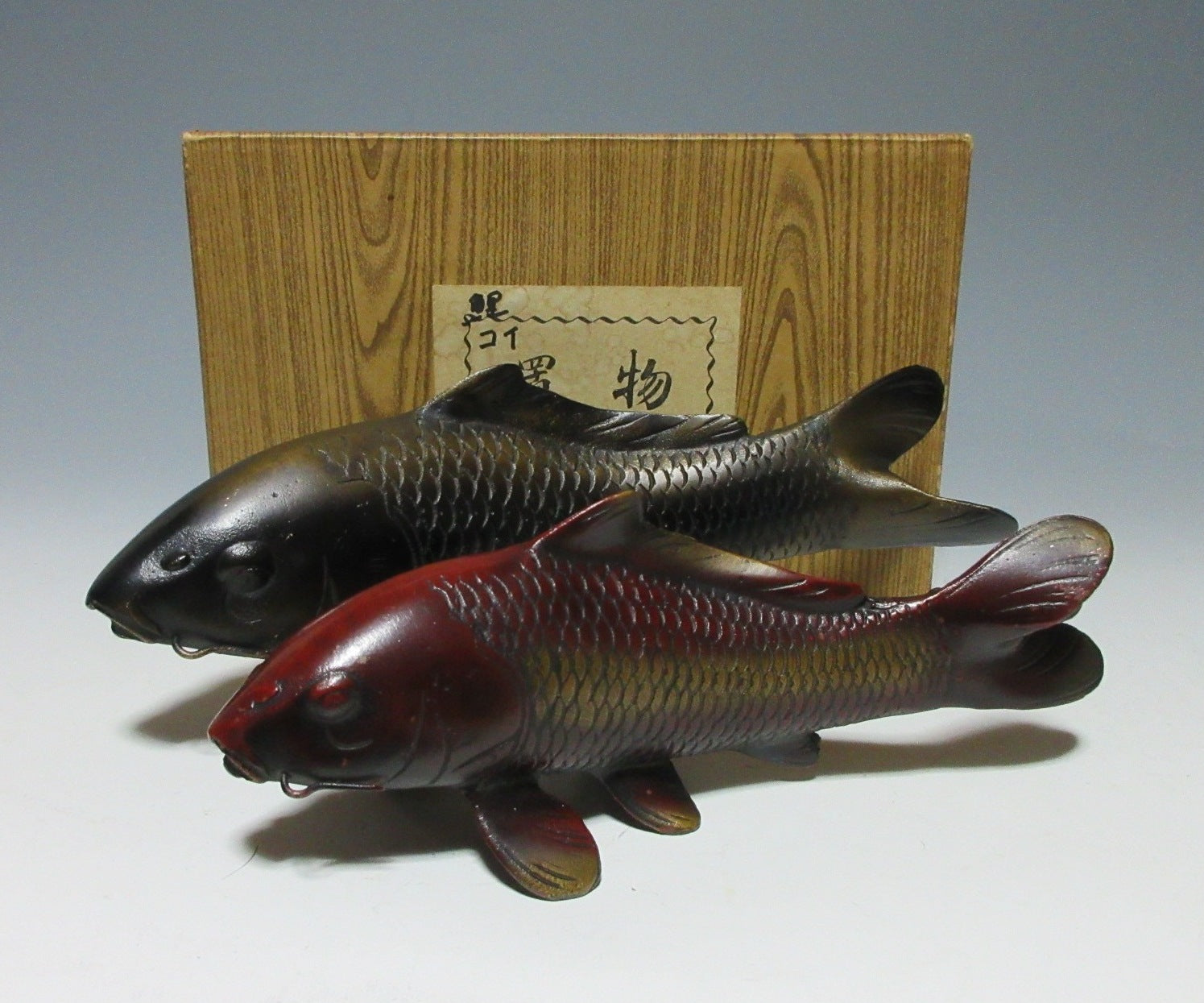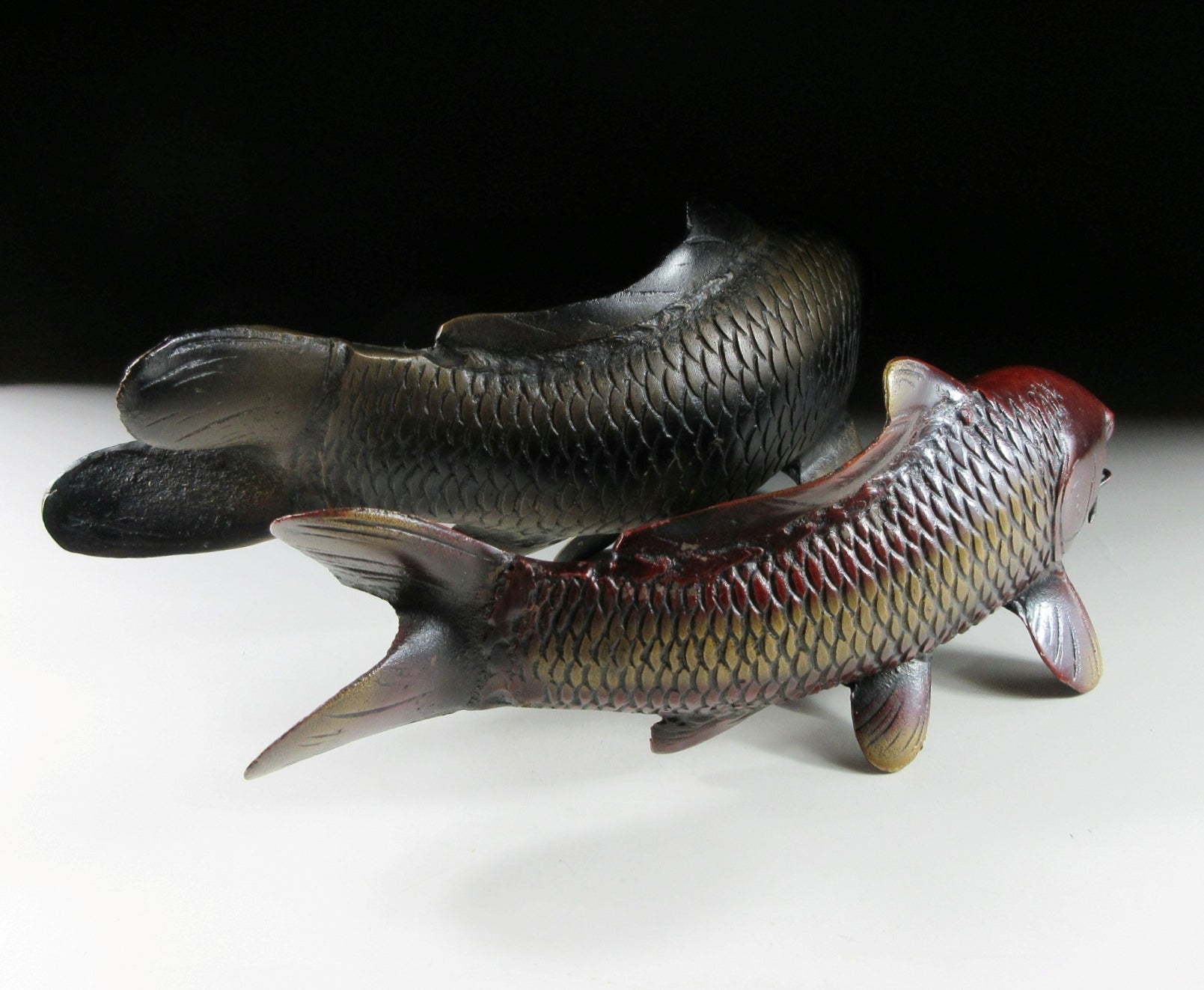 This listing is for a pair of iron alloy meoto koi ornaments made around 20-30 years ago. Meoto means a husband and wife pair. The exterior is coated in enamel - the larger fish is black and gold; and the smaller fish is red and gold. Ideal ornaments for indoors or outdoors, and would complement a Japanese garden beautifully. They come with their original paper storage box.