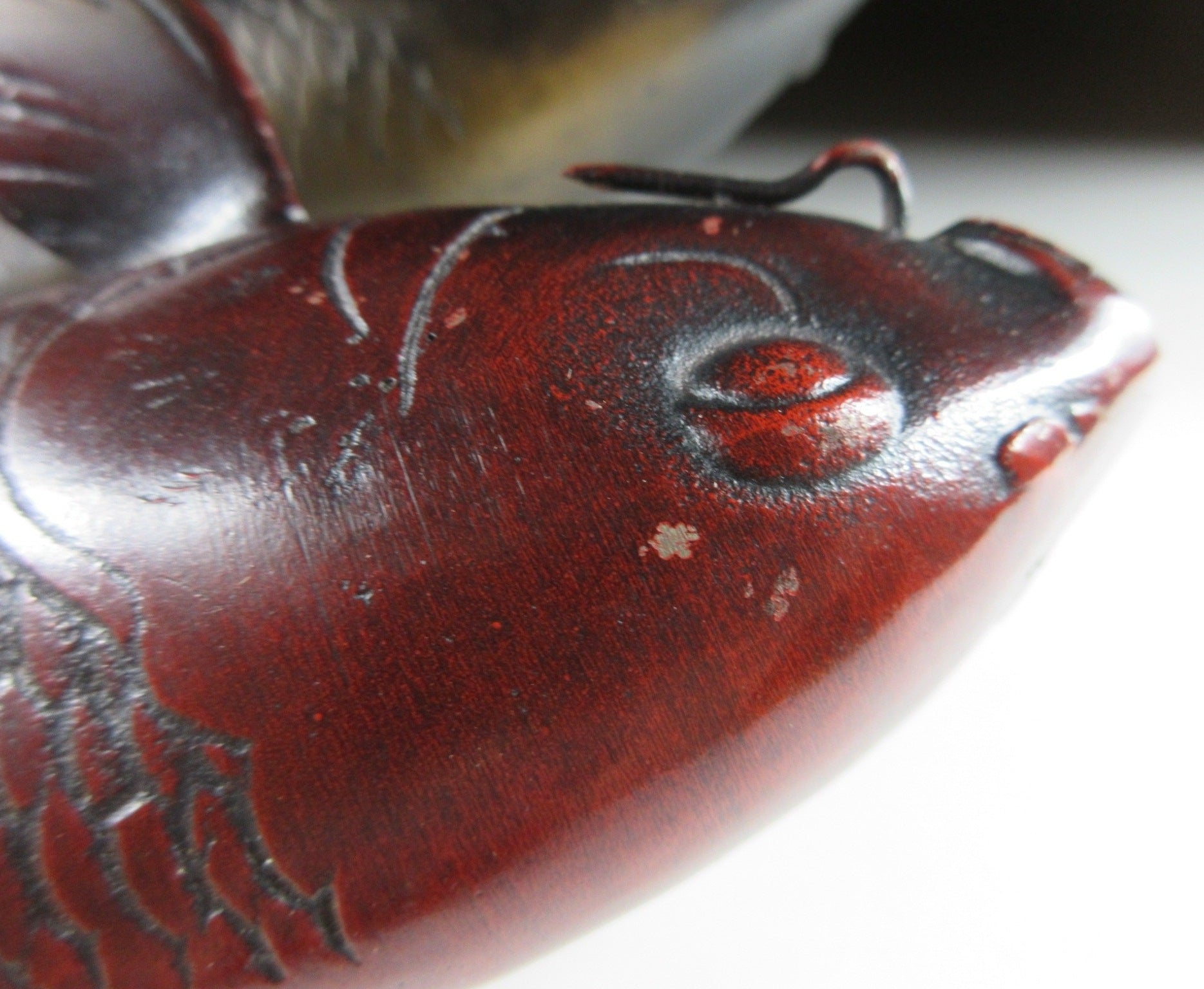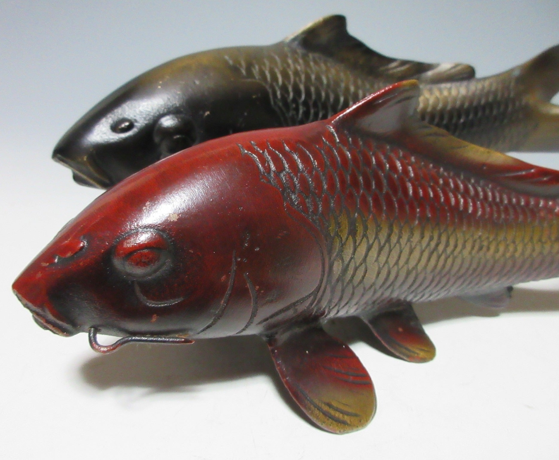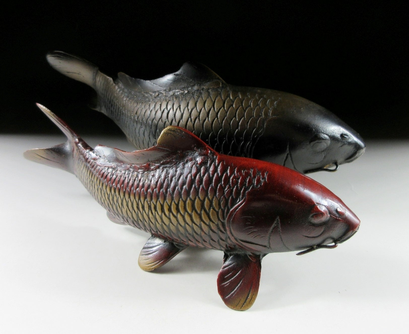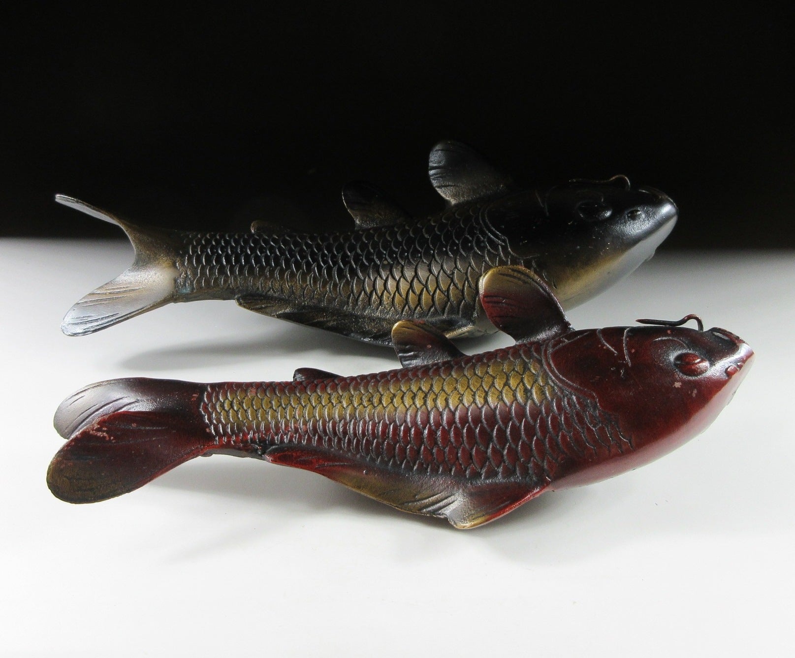 This listing is for a pair of iron alloy meoto koi ornaments made around 20-30 years ago. Meoto means a husband and wife pair. The exterior is coated in enamel - the larger fish is black and gold; and the smaller fish is red and gold. Ideal ornaments for indoors or outdoors, and would complement a Japanese garden beautifully. They come with their original paper storage box.