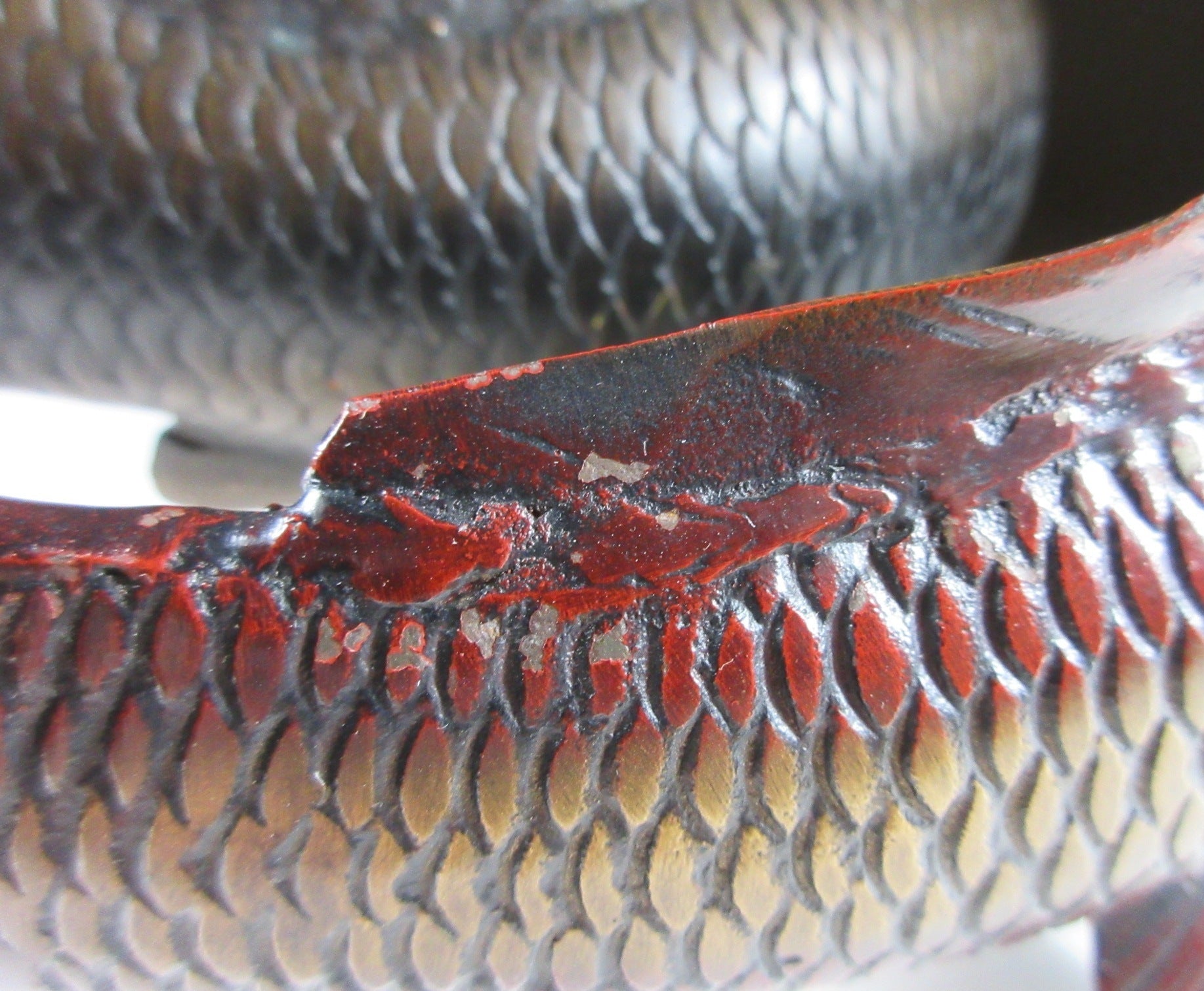 Some of the enamel is worn in places, also the box is discoloured and has dings from the fish.