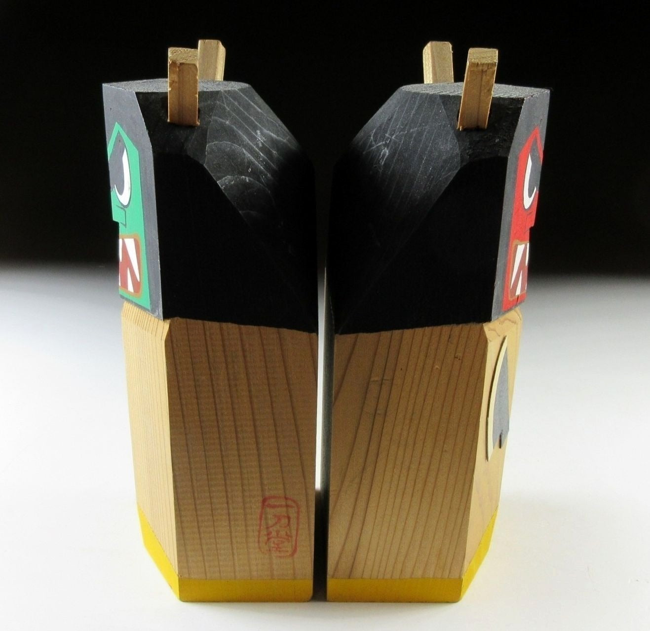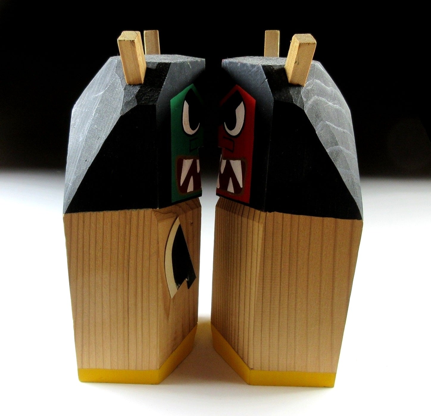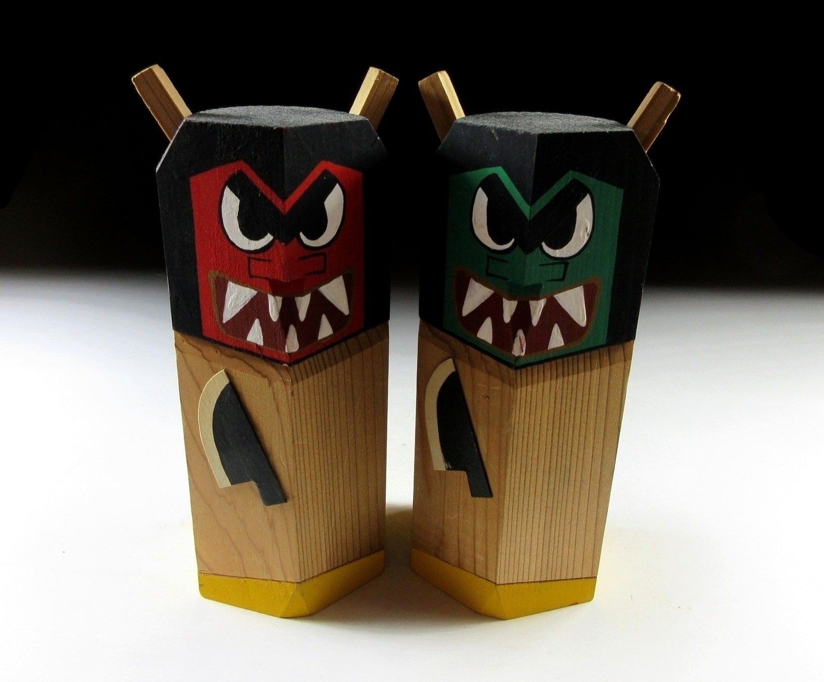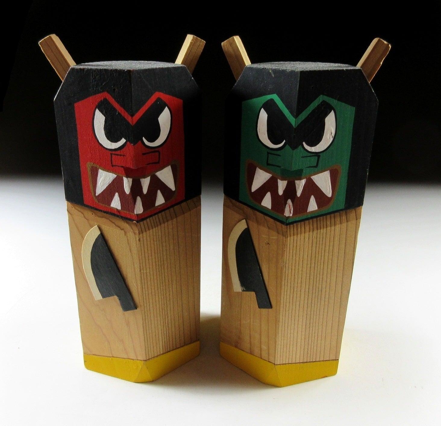 This listing is for a pair of Namahage ningyo made around 20 years ago. They have been carved from a single block of wood and hand-painted. Both feature a large knife attached to the front, as well as two horns on top of their heads. The red one is male, and the green one is female.