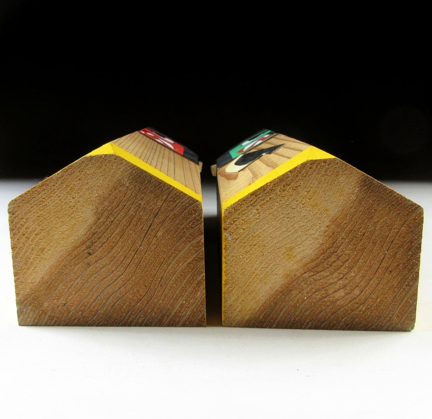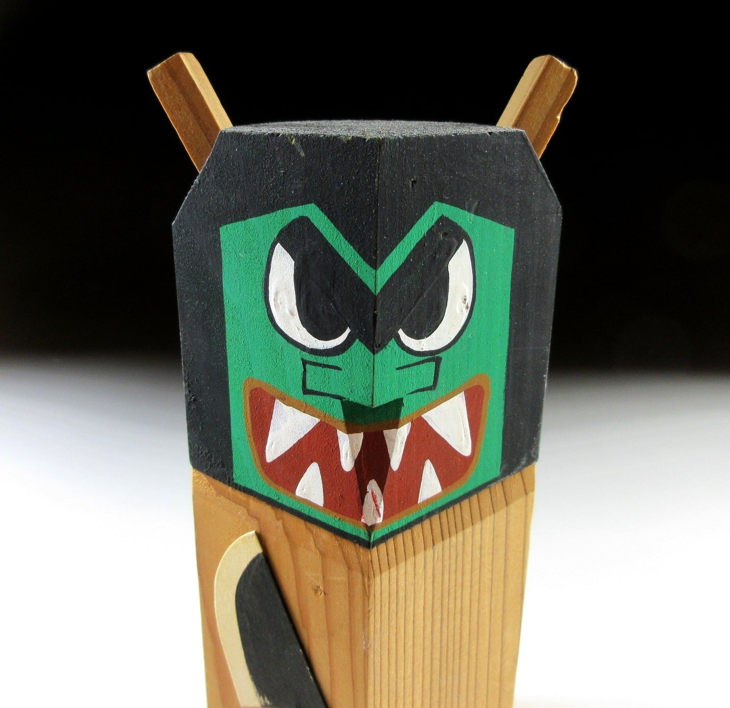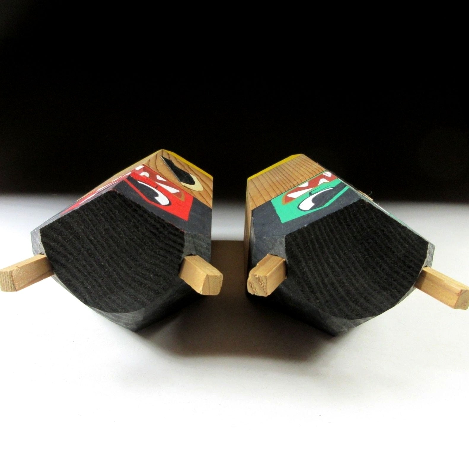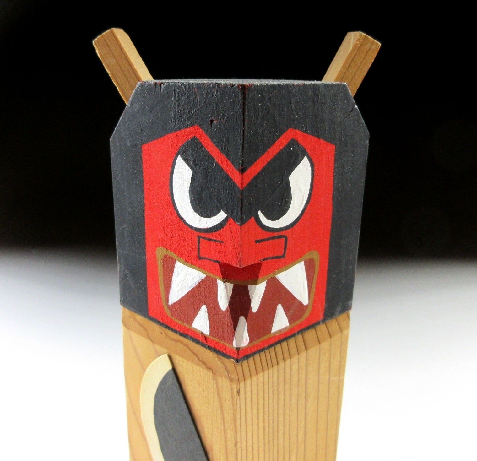 This listing is for a pair of Namahage ningyo made around 20 years ago. They have been carved from a single block of wood and hand-painted. Both feature a large knife attached to the front, as well as two horns on top of their heads. The red one is male, and the green one is female.
