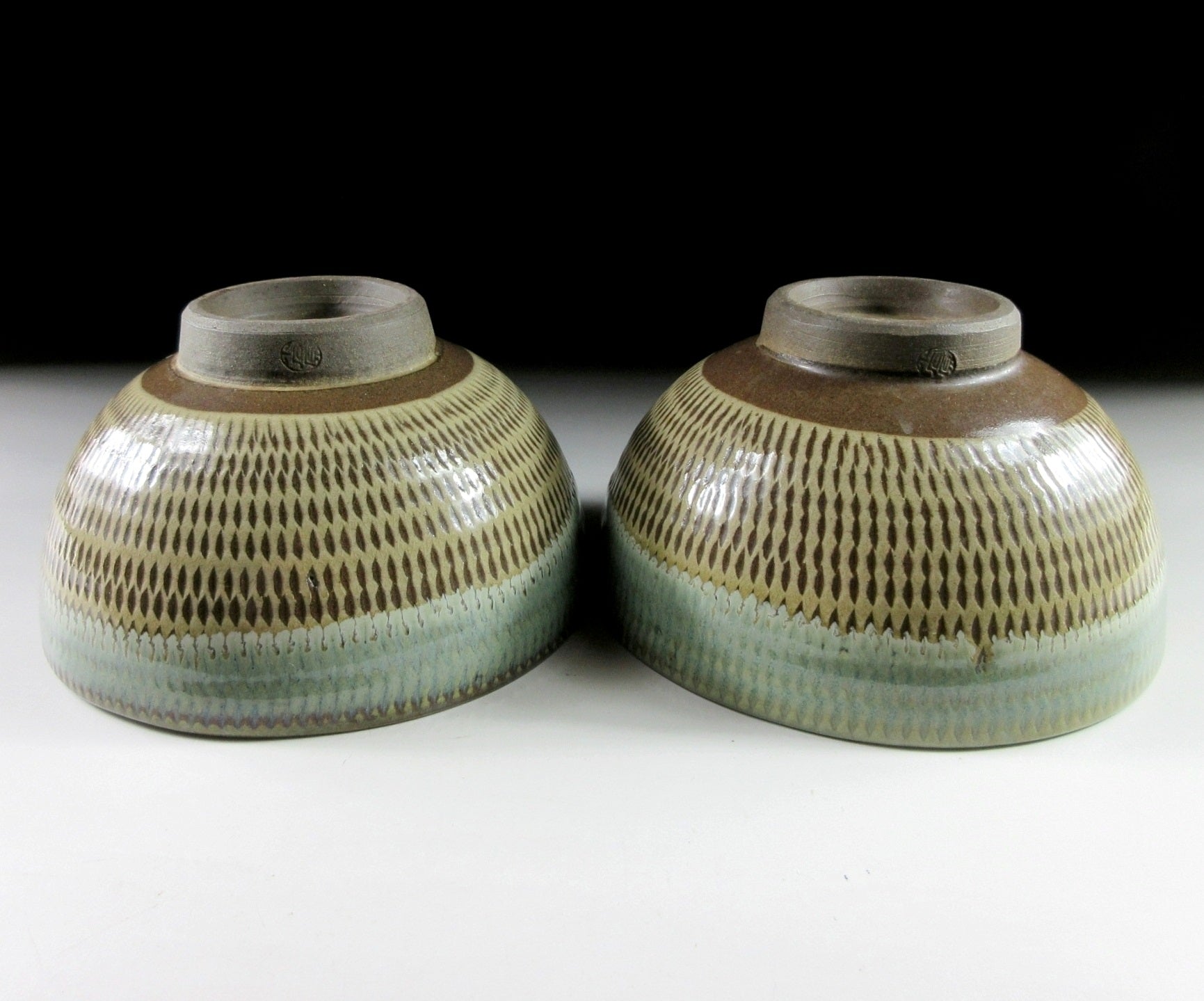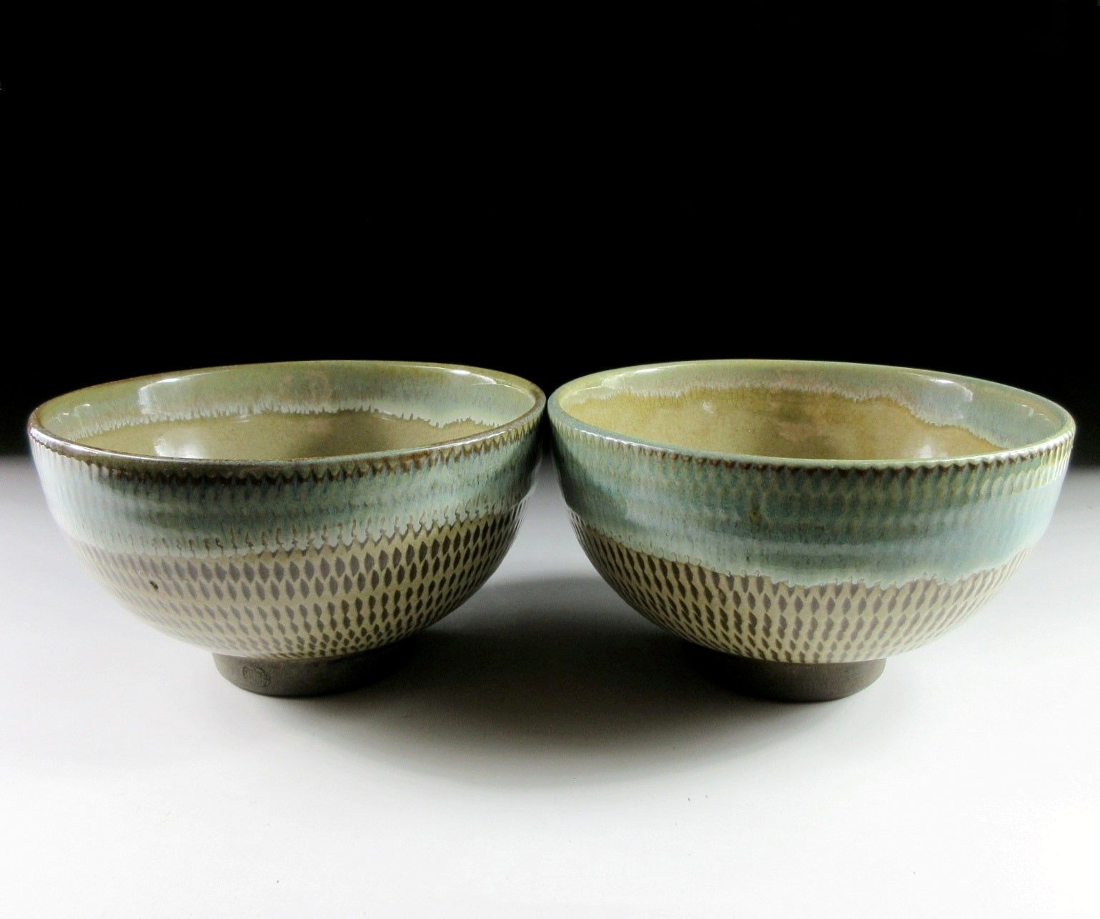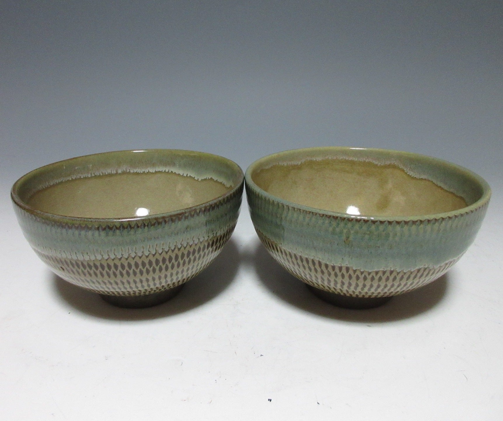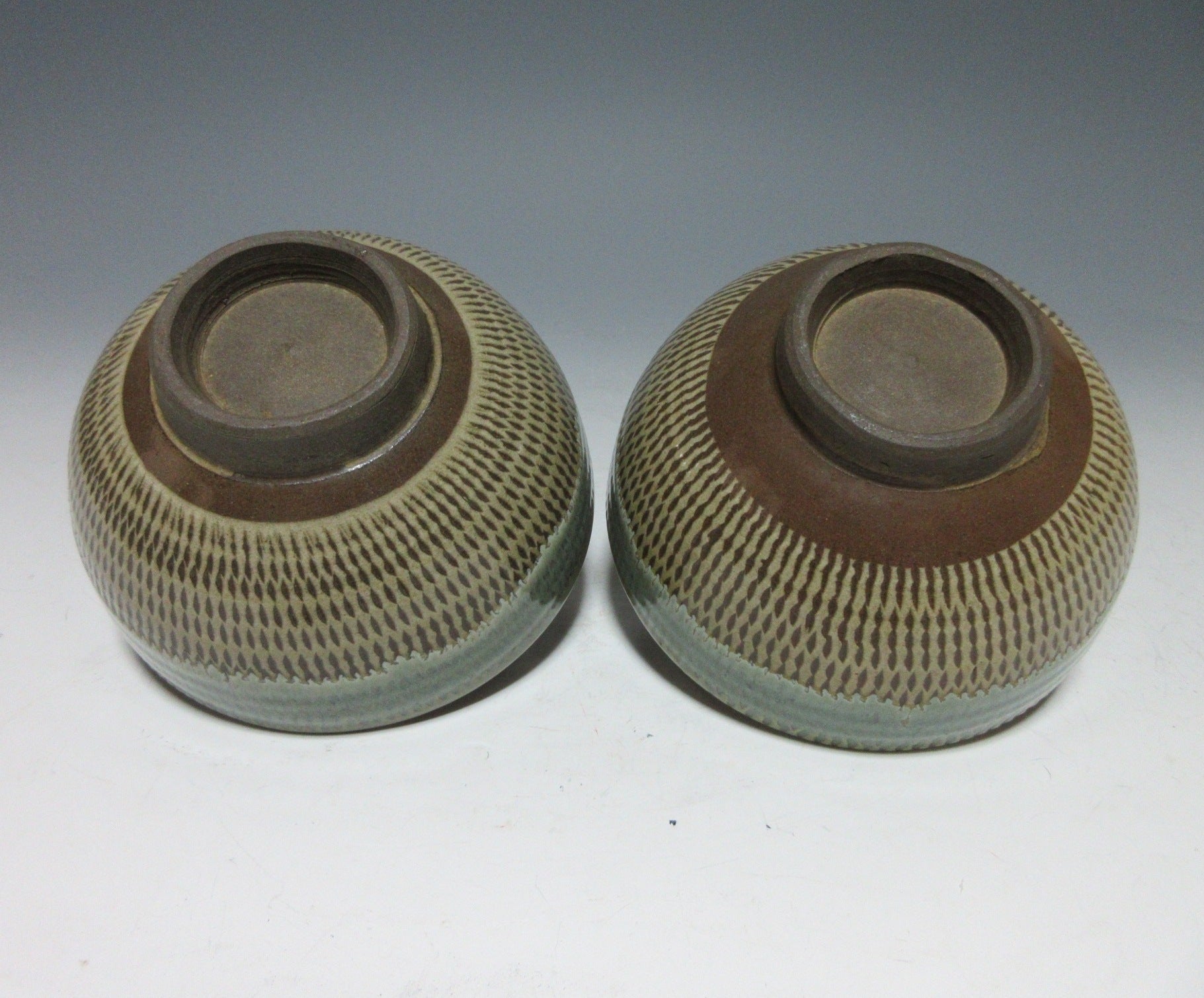 This listing is for a pair of reasonably large sized Onta-ware bowls made around 40 years ago. They are wheel-thrown and each bowl features a tobikanna pattern created with a chattering tool. The bowls are coated in light coloured slip and the chattering tool is used to carve nicks in the slip as they’re turned on the potter’s wheel. The rims of the bowls have been dipped in partially transparent ryokusho glaze, and the interior has some amber drips. An ‘Onta-yaki’ stamp can be found on the outer foot of each bowl.