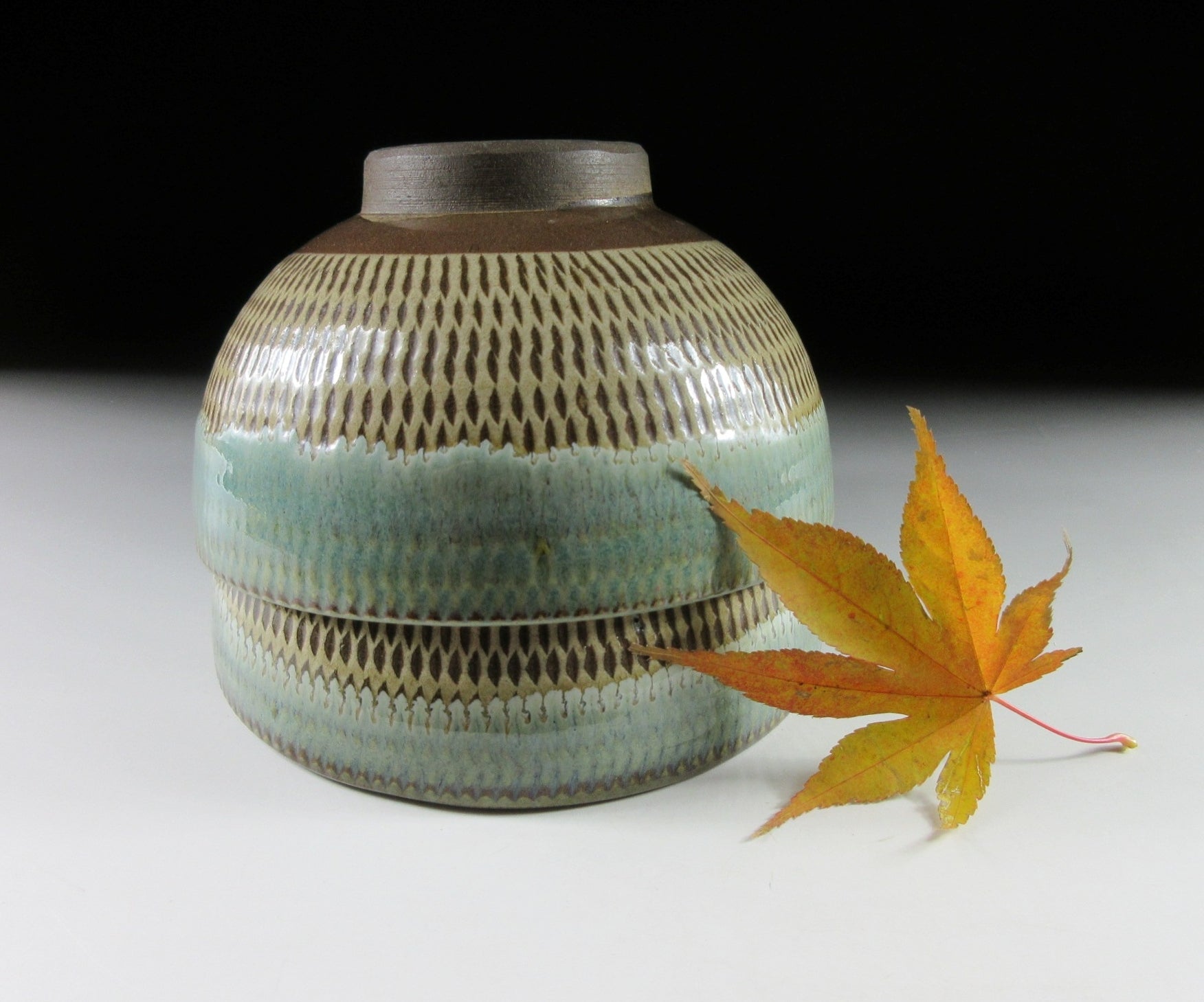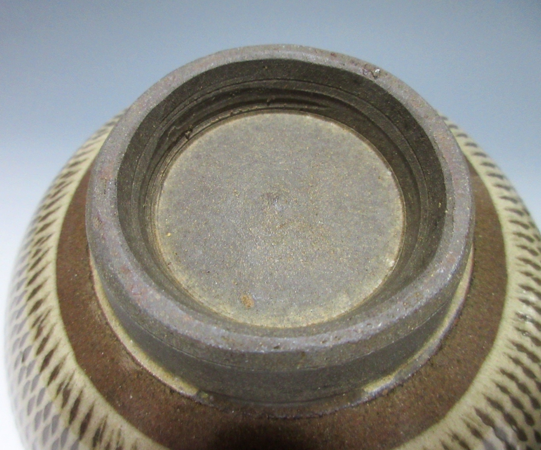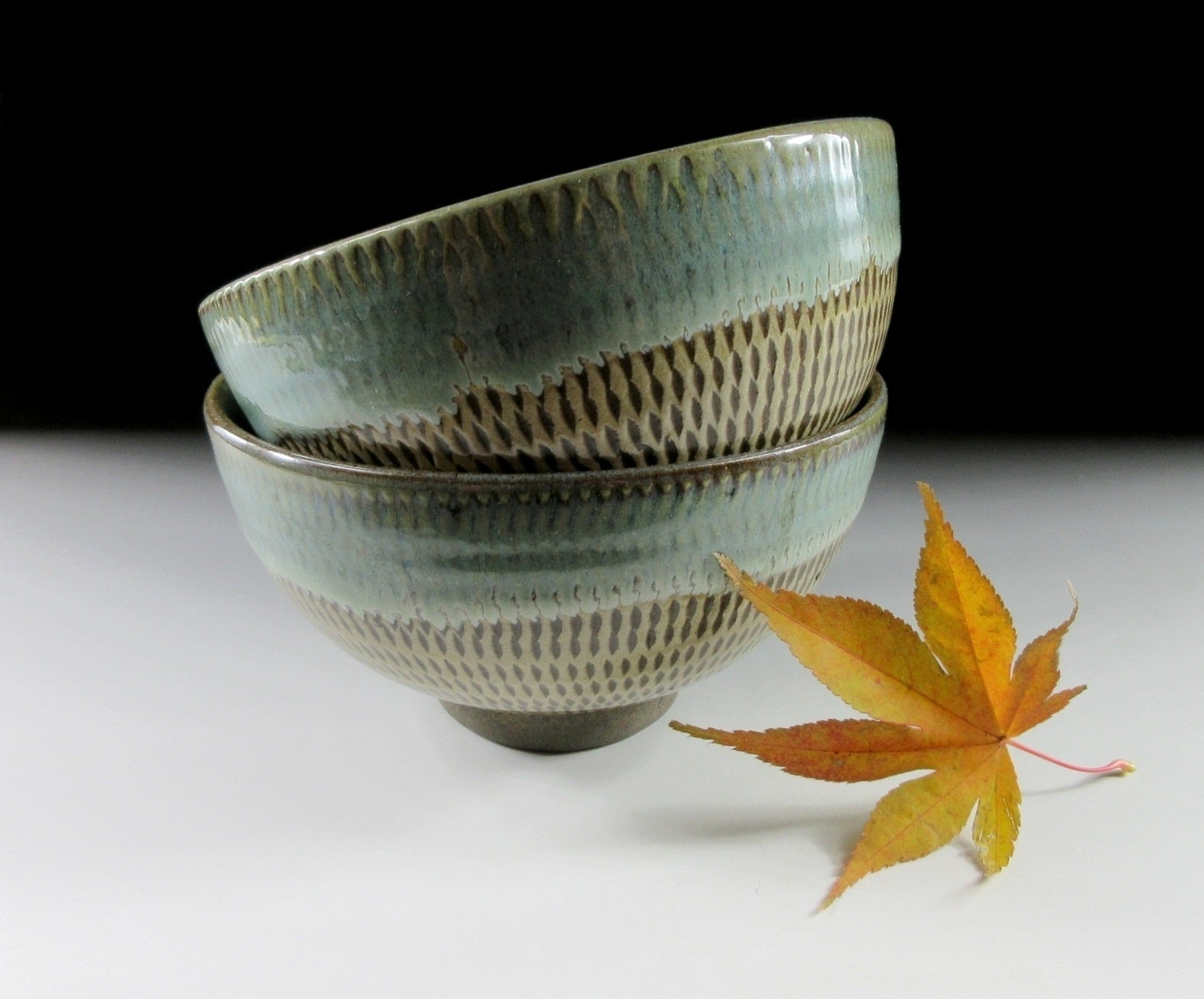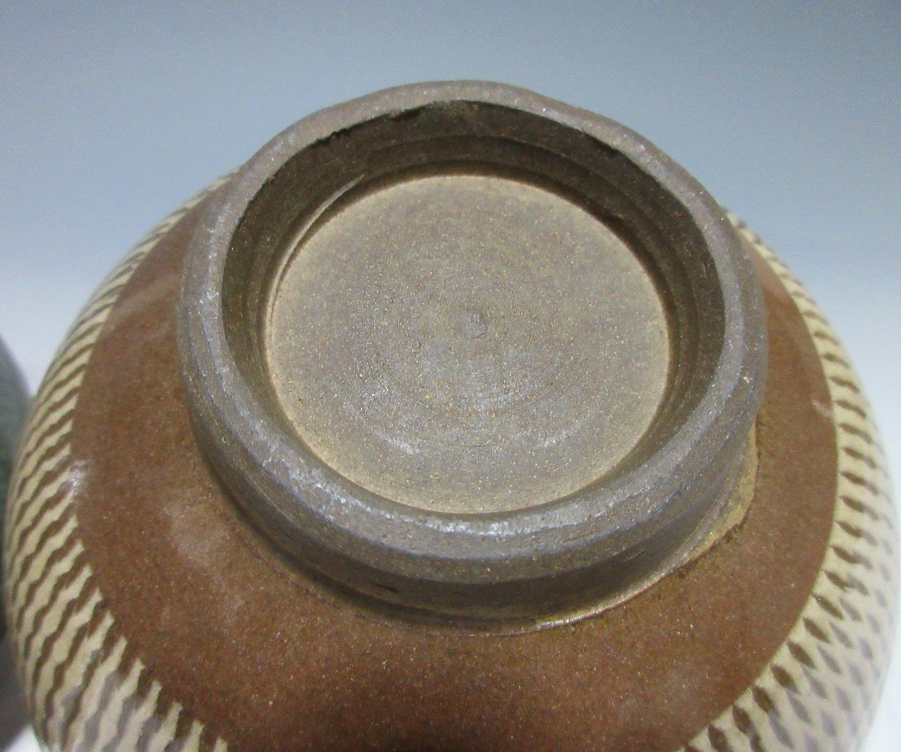 This listing is for a pair of reasonably large sized Onta-ware bowls made around 40 years ago. They are wheel-thrown and each bowl features a tobikanna pattern created with a chattering tool. The bowls are coated in light coloured slip and the chattering tool is used to carve nicks in the slip as they’re turned on the potter’s wheel. The rims of the bowls have been dipped in partially transparent ryokusho glaze, and the interior has some amber drips. An ‘Onta-yaki’ stamp can be found on the outer foot of each bowl.