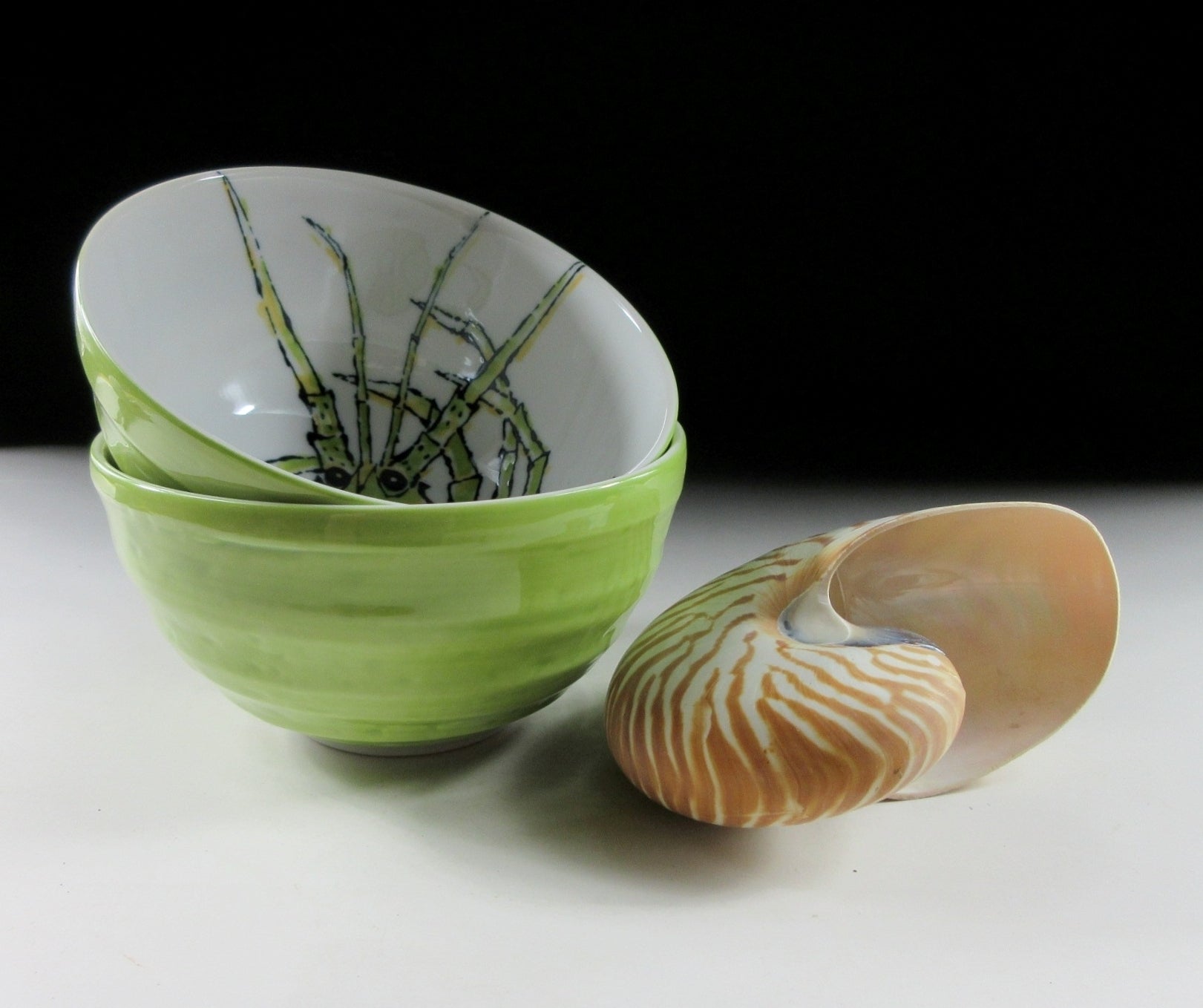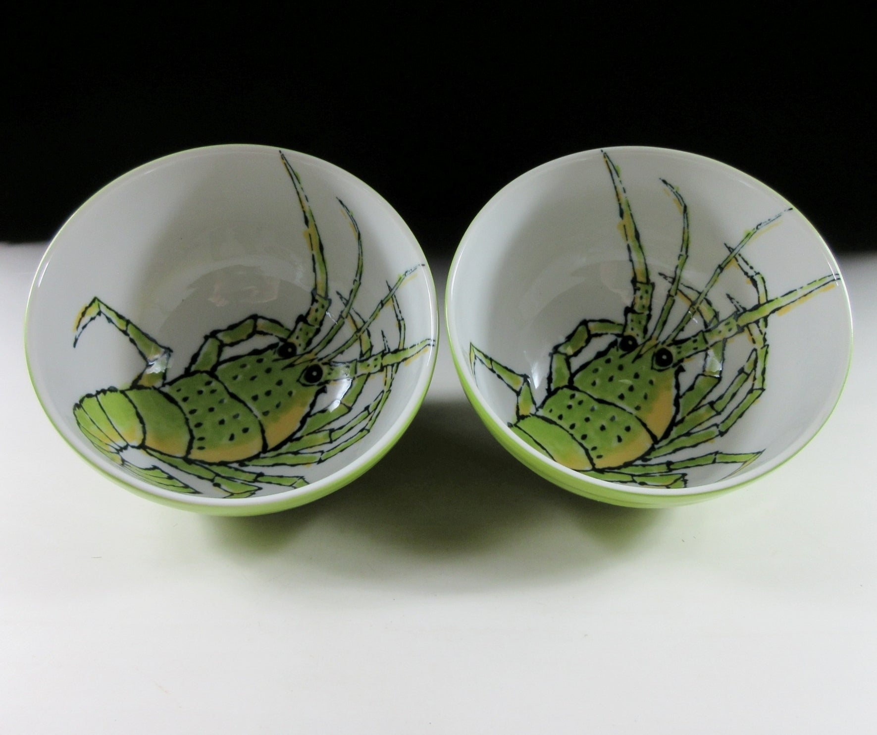 This listing is for a pair of Mino-ware bowls made by Seido Gama. They are made of stoneware slip and the interior of each bowl is decorated with a large ise ebi spiny lobster. Ise ebi symbolize longevity, and this is because the back of a lobster is curled just like an elderly person. The motif is often used to decorate New Year teaware in the hope that it will bring long life. These bowls are suitable for serving soup, ice cream, salad etc, and the signature of the kiln can be found on the bottom.