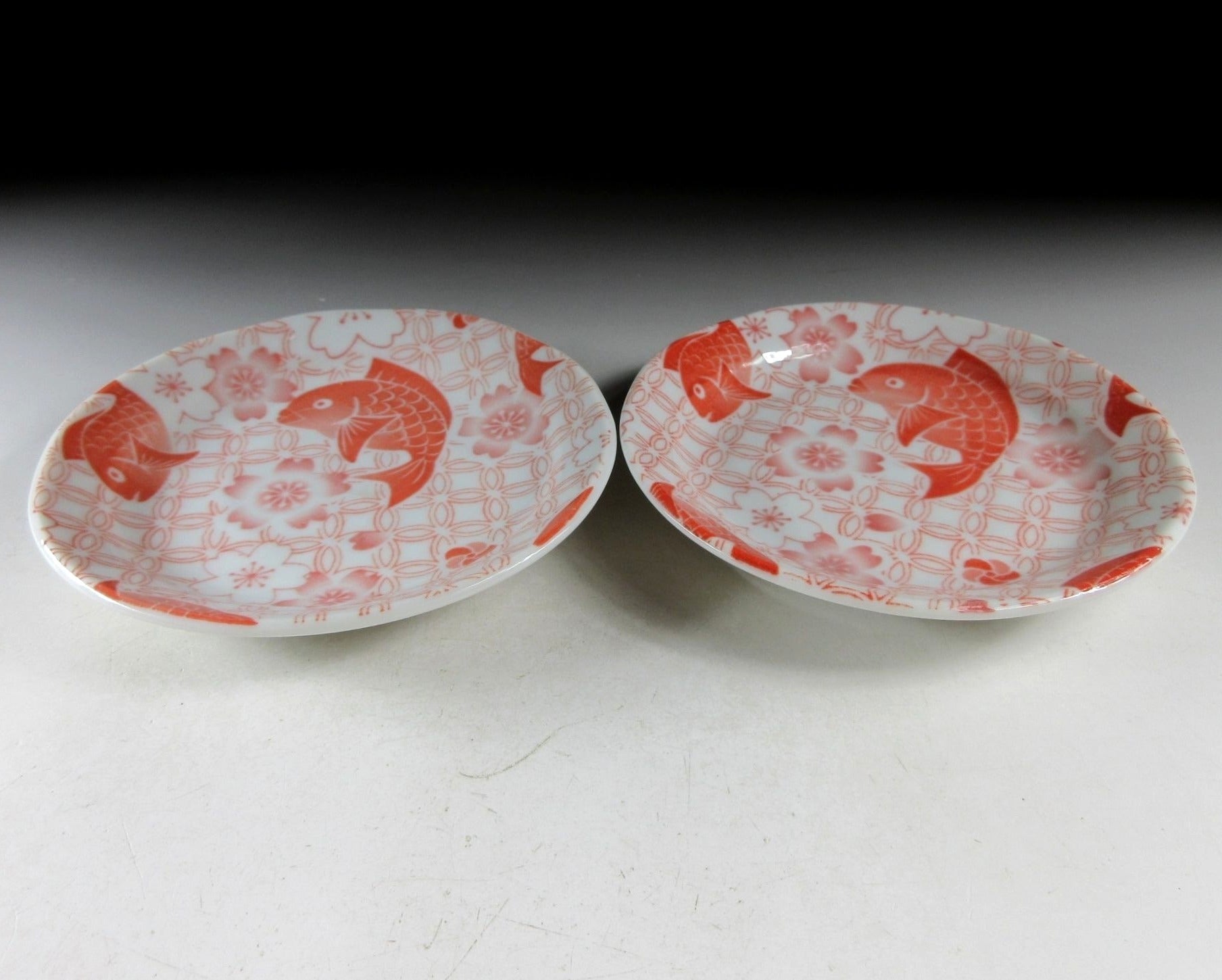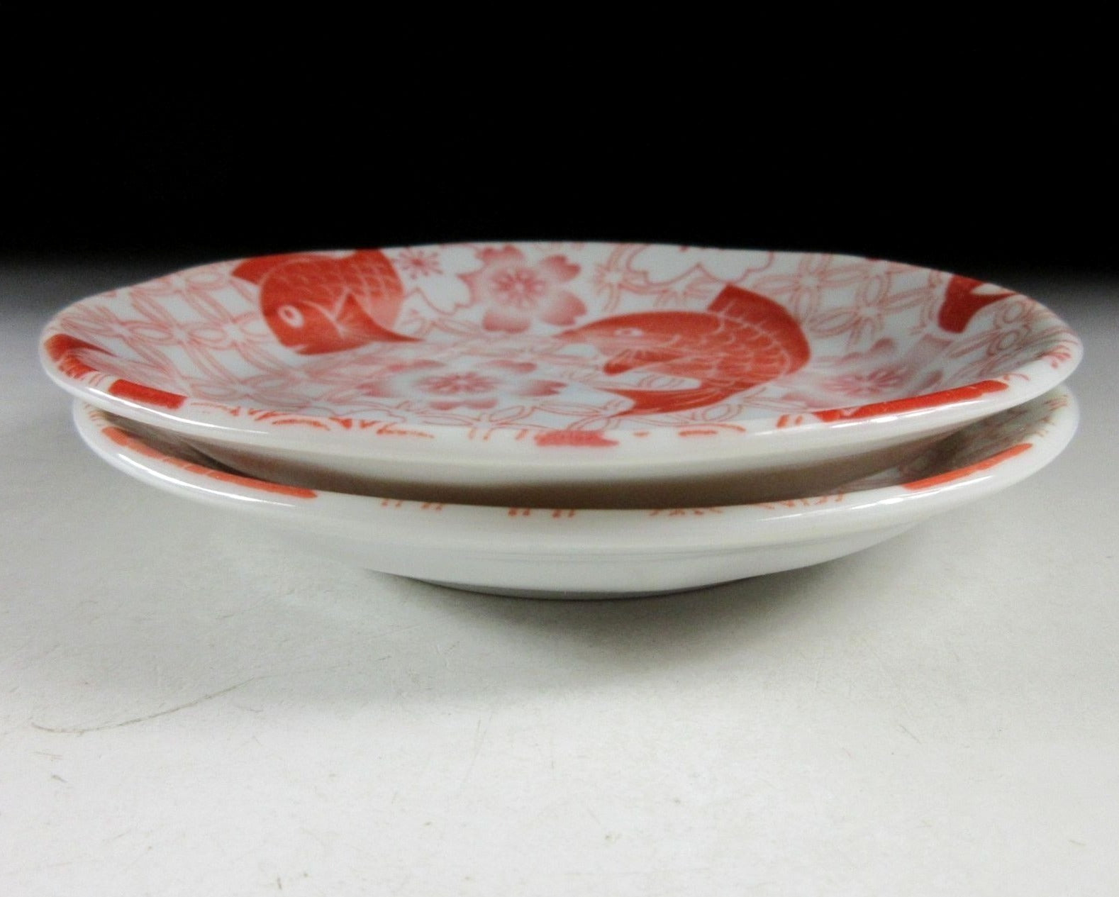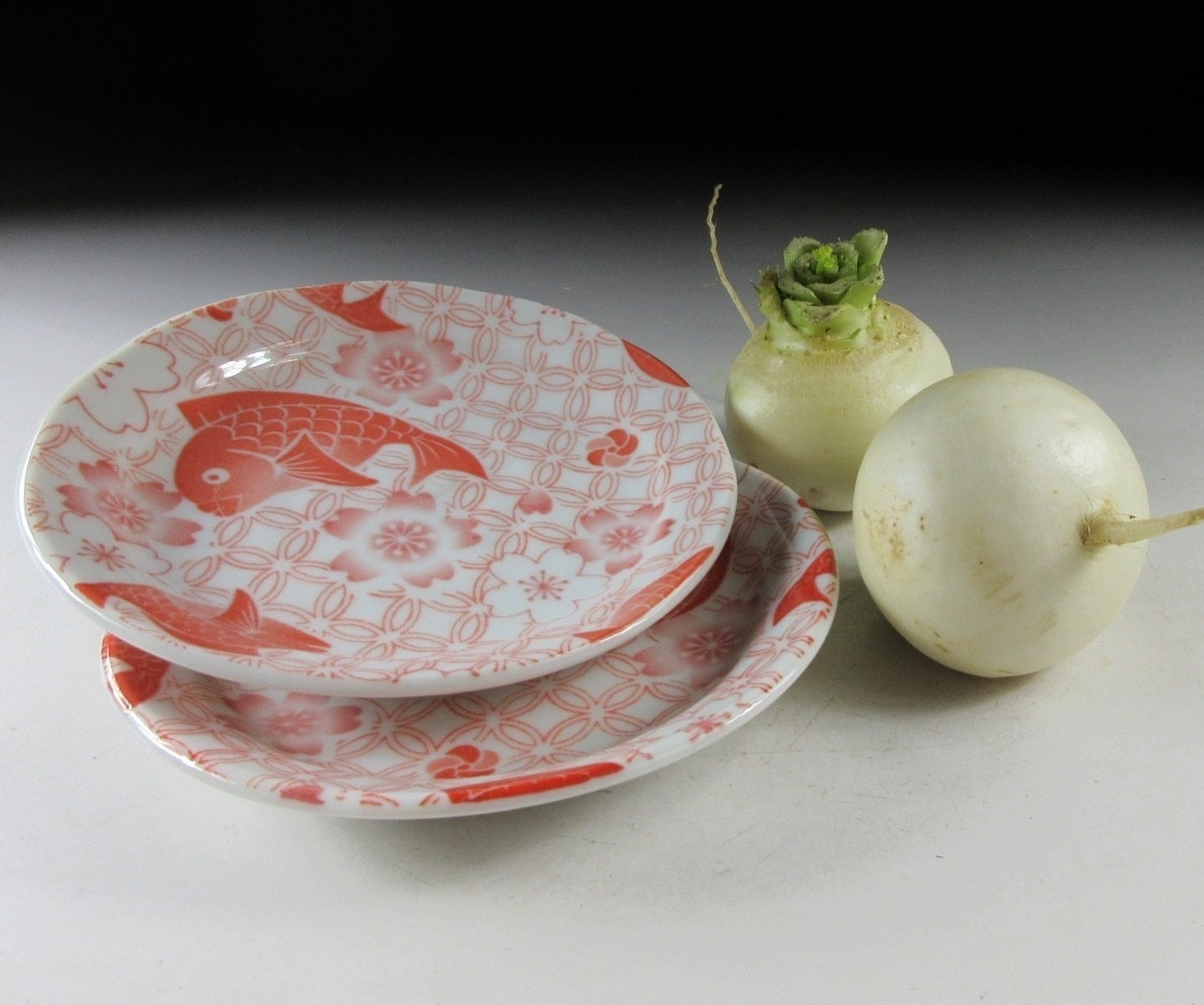 This listing is for a pair of Mino-ware plates made around 20 years ago. They are small in size and decorated with sea bream. Sea bream has symbolic importance in Japan, it is a fish for celebration and eaten at New Year. The Japanese name for sea bream is ‘tai’, which is part of the word ‘medetai’ which means auspicious and joyful. Also seam bream turns bright red when it’s cooked, and red is a lucky colour that is thought to ward off evil. These plates are nice for serving sweets during New Year. The signature of the kiln can be found on the back of each plate.