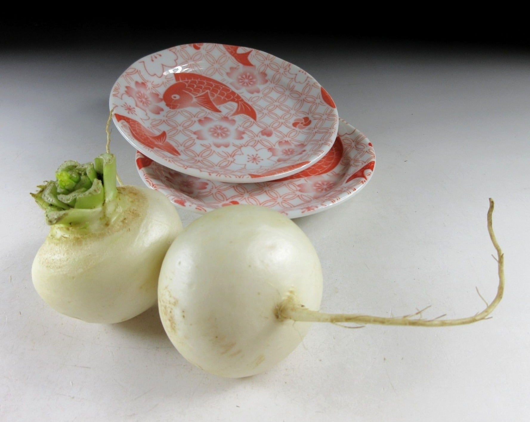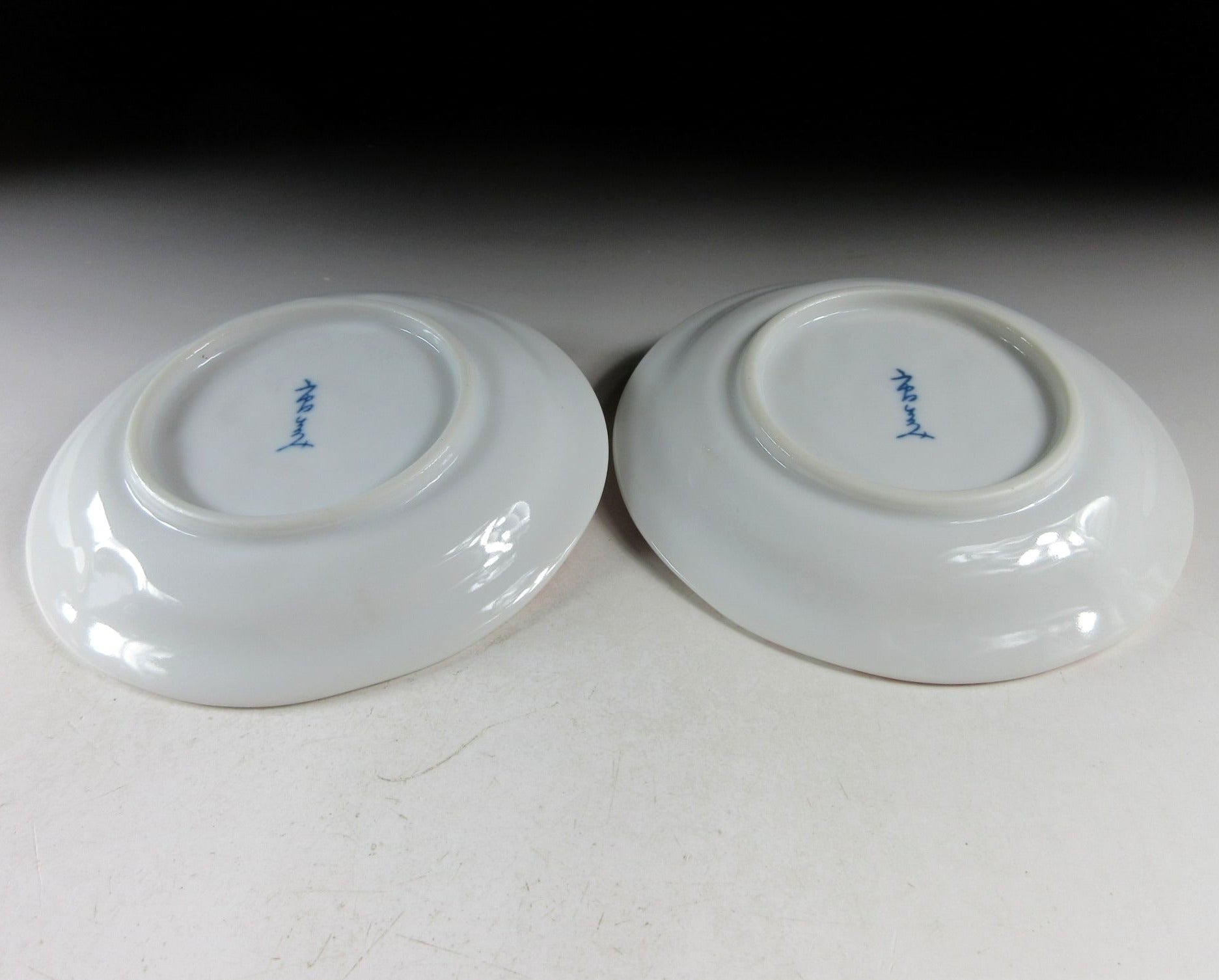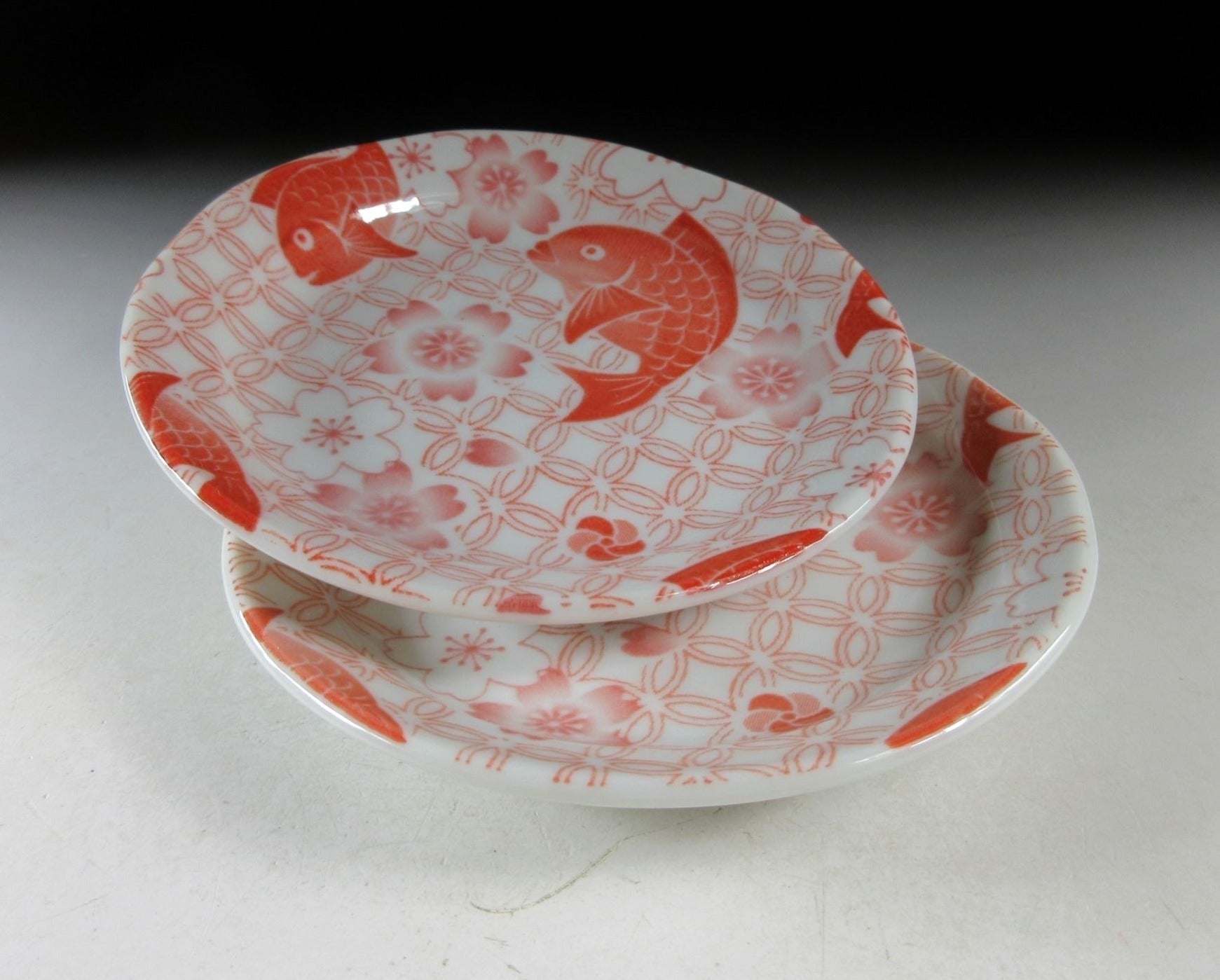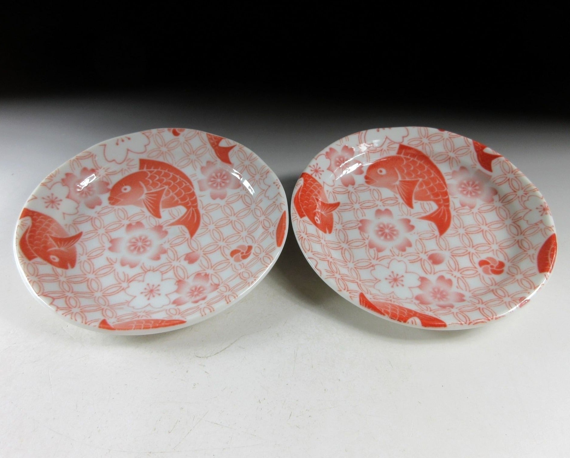 This listing is for a pair of Mino-ware plates made around 20 years ago. They are small in size and decorated with sea bream. Sea bream has symbolic importance in Japan, it is a fish for celebration and eaten at New Year. The Japanese name for sea bream is ‘tai’, which is part of the word ‘medetai’ which means auspicious and joyful. Also seam bream turns bright red when it’s cooked, and red is a lucky colour that is thought to ward off evil. These plates are nice for serving sweets during New Year. The signature of the kiln can be found on the back of each plate.