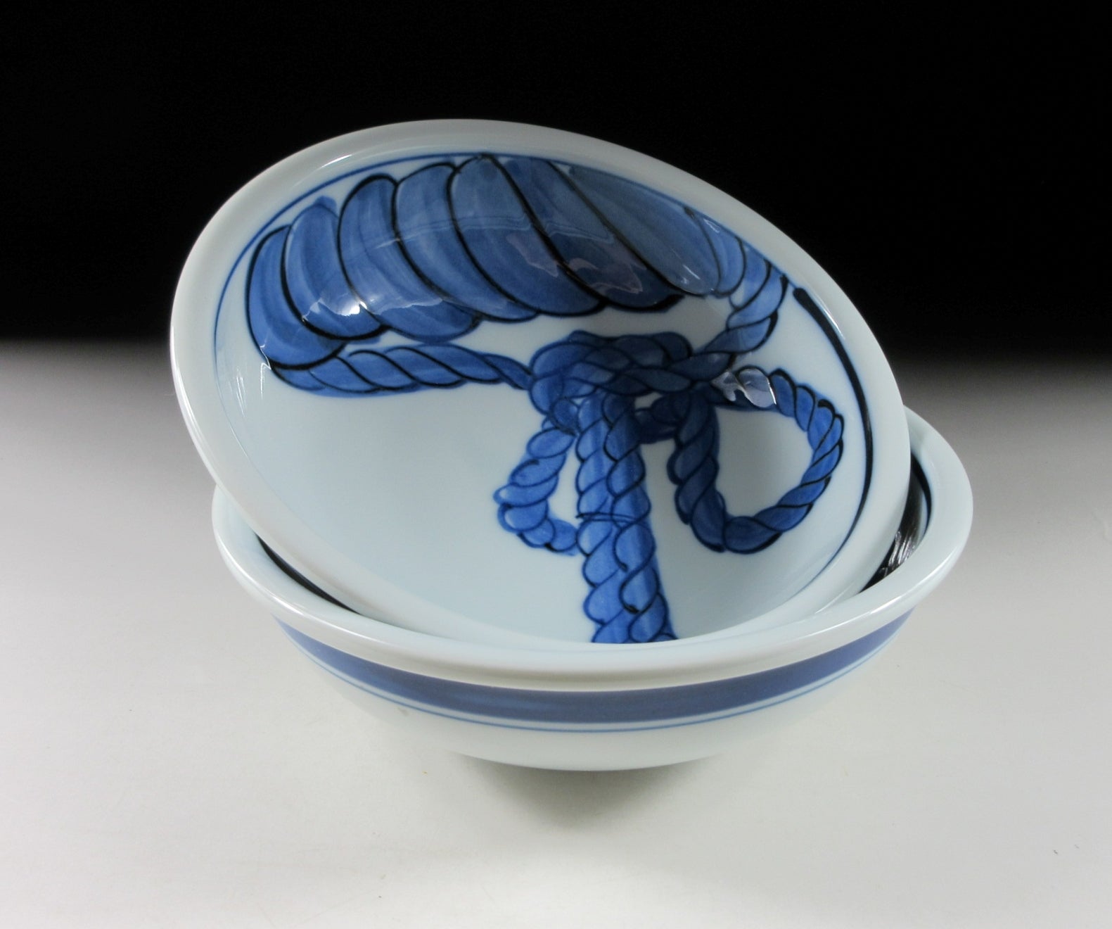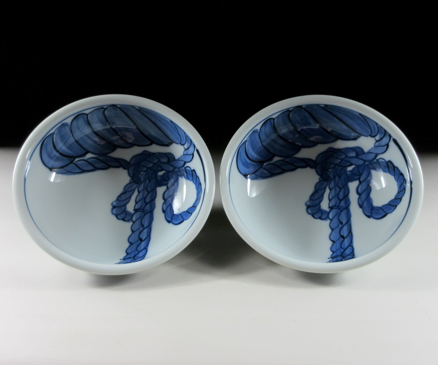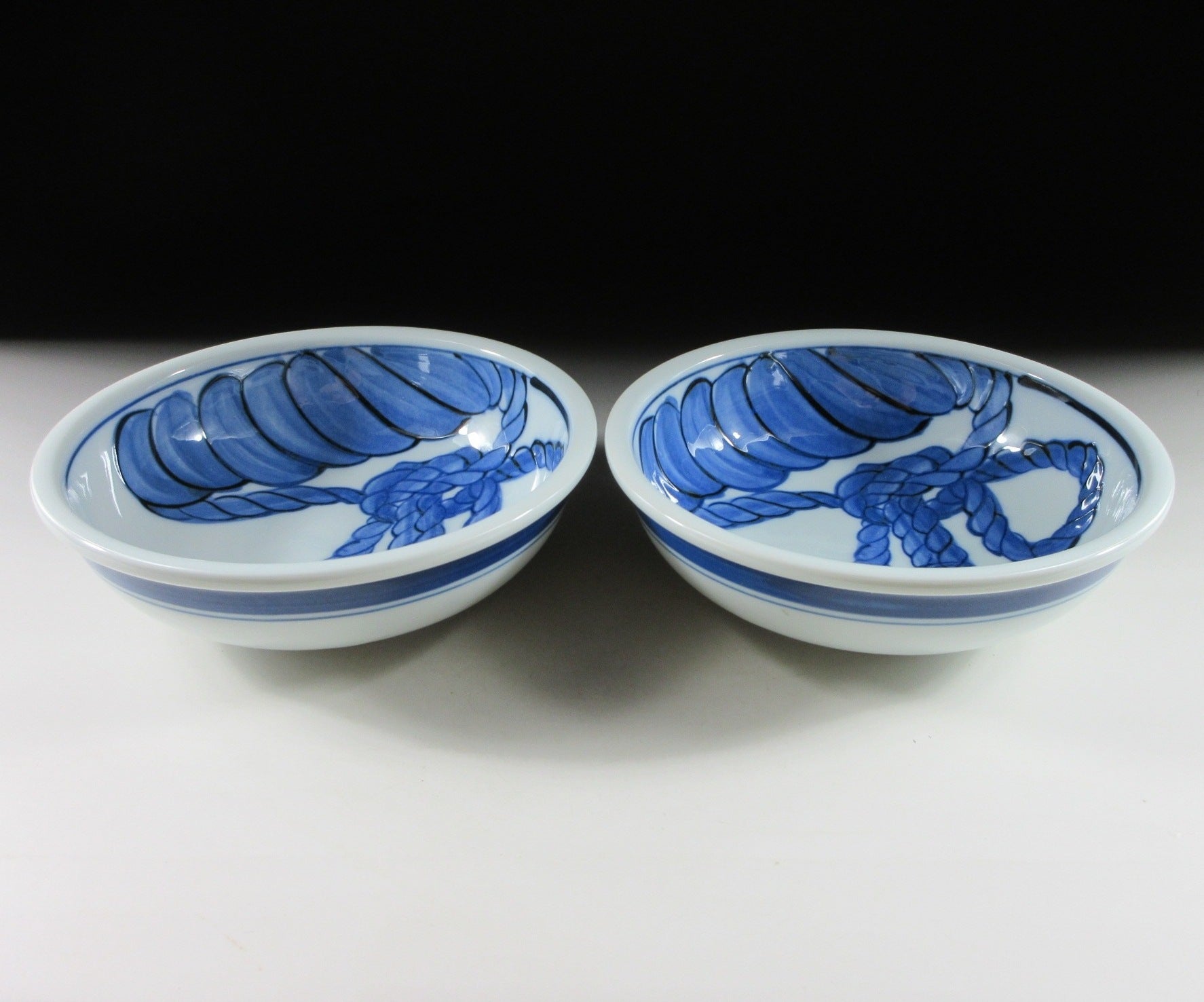 This listing is for a pair of sumo themed Arita-ware bowls made around 5-10 years ago. They are made of porcelain and the interior is decorated with two sacred white ropes used for ceremonial purposes. When a grand champion is promoted to the rank of yokozuna, they are fitted with a rope belt decorated with white ‘shide’ paper strips. These bowls are well suited for serving side dishes such as salad or fruit. The signature of the kiln can be found on the bottom.