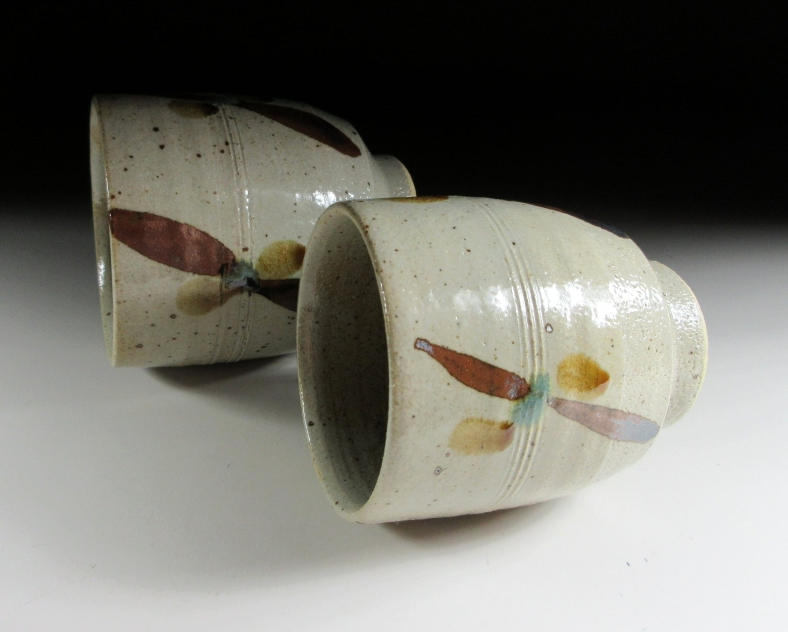 This listing is for a pair of Mashiko-ware yunomi tea cups made around 20 years ago by Tsukamoto Gama. They are wheel-thrown and the exterior is decorated with mingei style brushwork over a transparent white glazed base, and the slightly speckled appearance due to the iron content in the clay. Also these cups are what we call meoto style, meaning they are two different sizes and often referred to as a husband and wife pair.